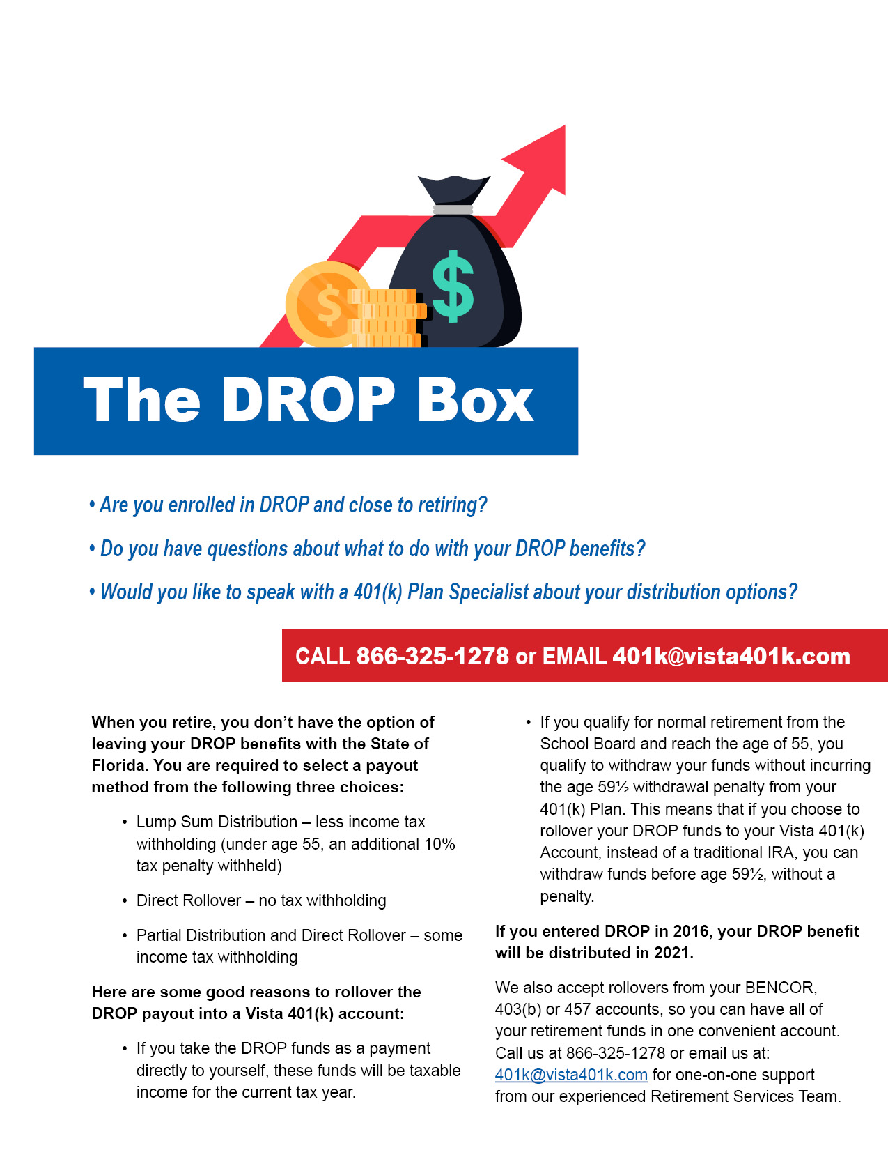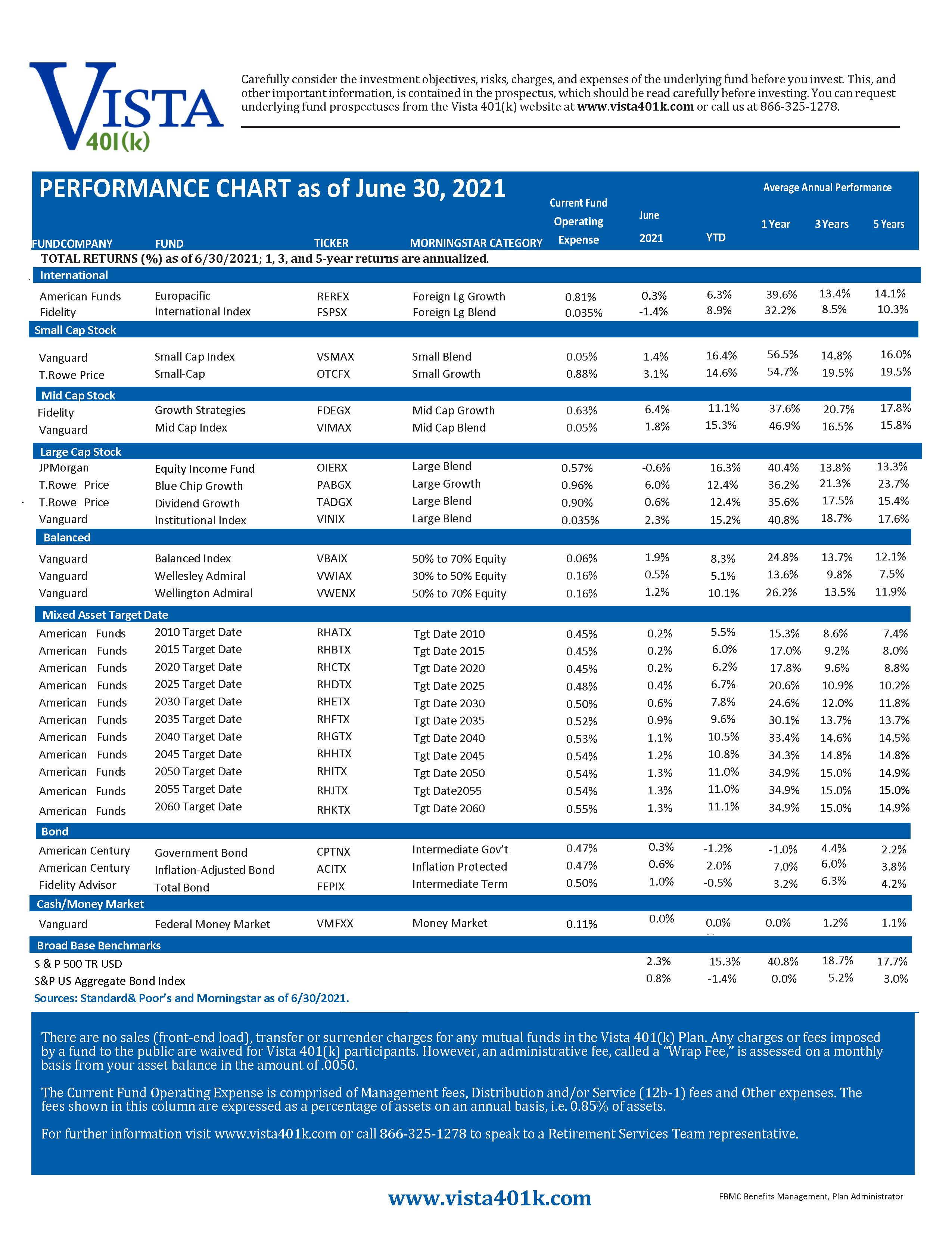 Remember, Vista 401(k) is focused, flexible and here for you. Please feel free to contact our Retirement Services Department at (866) 325-1278 for any help.