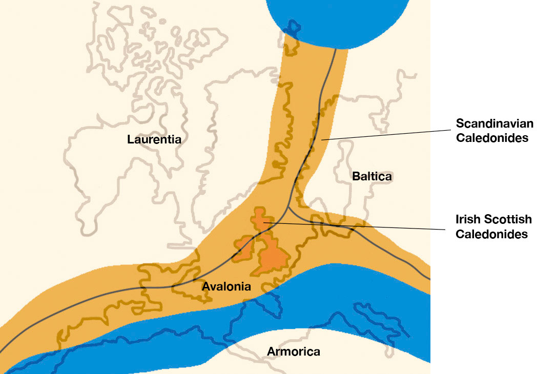 The story of Brimham Rocks starts 500 million years ago as the supercontinent Gondwana began breaking up, torn apart by the movement of the earth's tectonic plates. About 480 million years ago in the part of the globe that was about 20 degrees south of the equator the small continent of Avalonia started to drift northward and collided with two continental land masses, Laurentia and Baltica. Over the next 100 million years this collision created such enormous forces that the land buckled and a series of mountain ranges the size of the Himalayas were formed.
