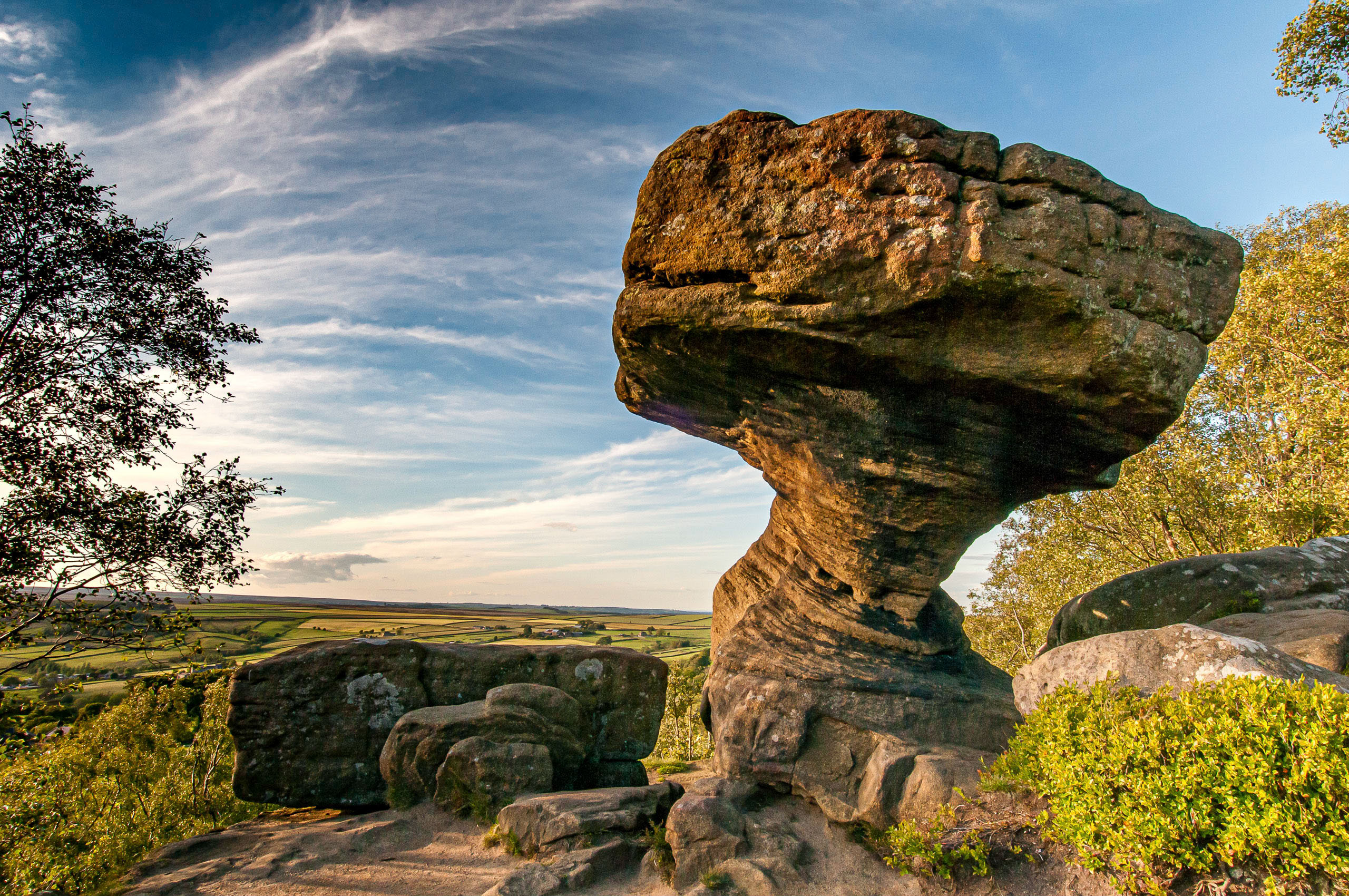 As the Millstone Grit rocks are eroded, the hard quartz grains fall to the ground only to be picked up by the wind and blasted against the rock surface. These sand grains are heavy and tend to have the greatest effect closer to the ground. Over time, the lower part of the rock will be eroded faster than the top and these fantastical shapes are the result.