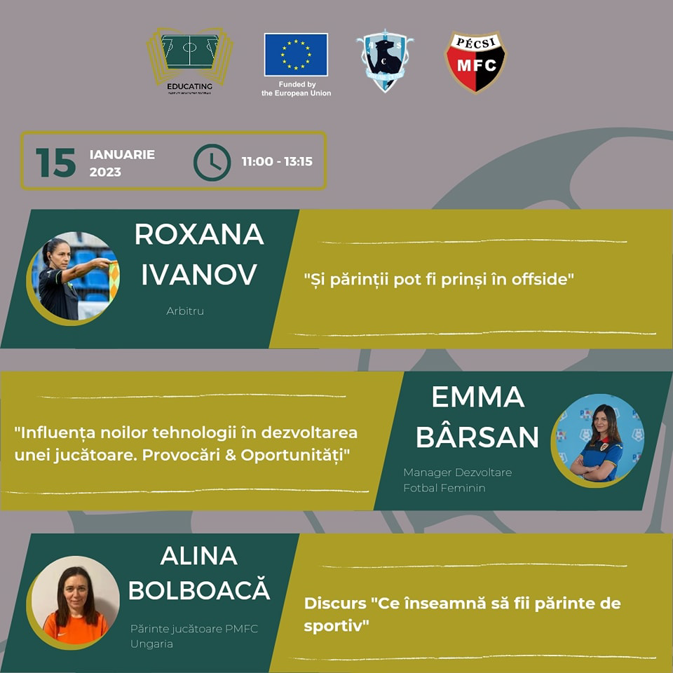 - Educația adulților în Erasmus+: Informează-te! —//— Formare și transfer de bune practici la nivel european, în domeniul educației, pentru specialiștii din sectorul social—//— Proiectul Erasmus+ „Educarea părinților în fotbalul feminin, conștientizarea și creșterea implicării acestora în procesul de dezvoltare a sportivelor”