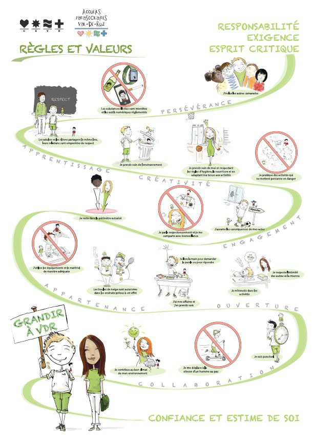 Des affiches, en lien avec le règlement de discipline et le fil rouge de la prévention (confiance et estime de soi), sont utilisées comme supports pour rappeler ce qui est attendu pour bien évoluer au sein du CSVR et afin de développer des valeurs indispensables dans la vie comme le respect, la citoyenneté, l’appartenance, la collaboration, etc.