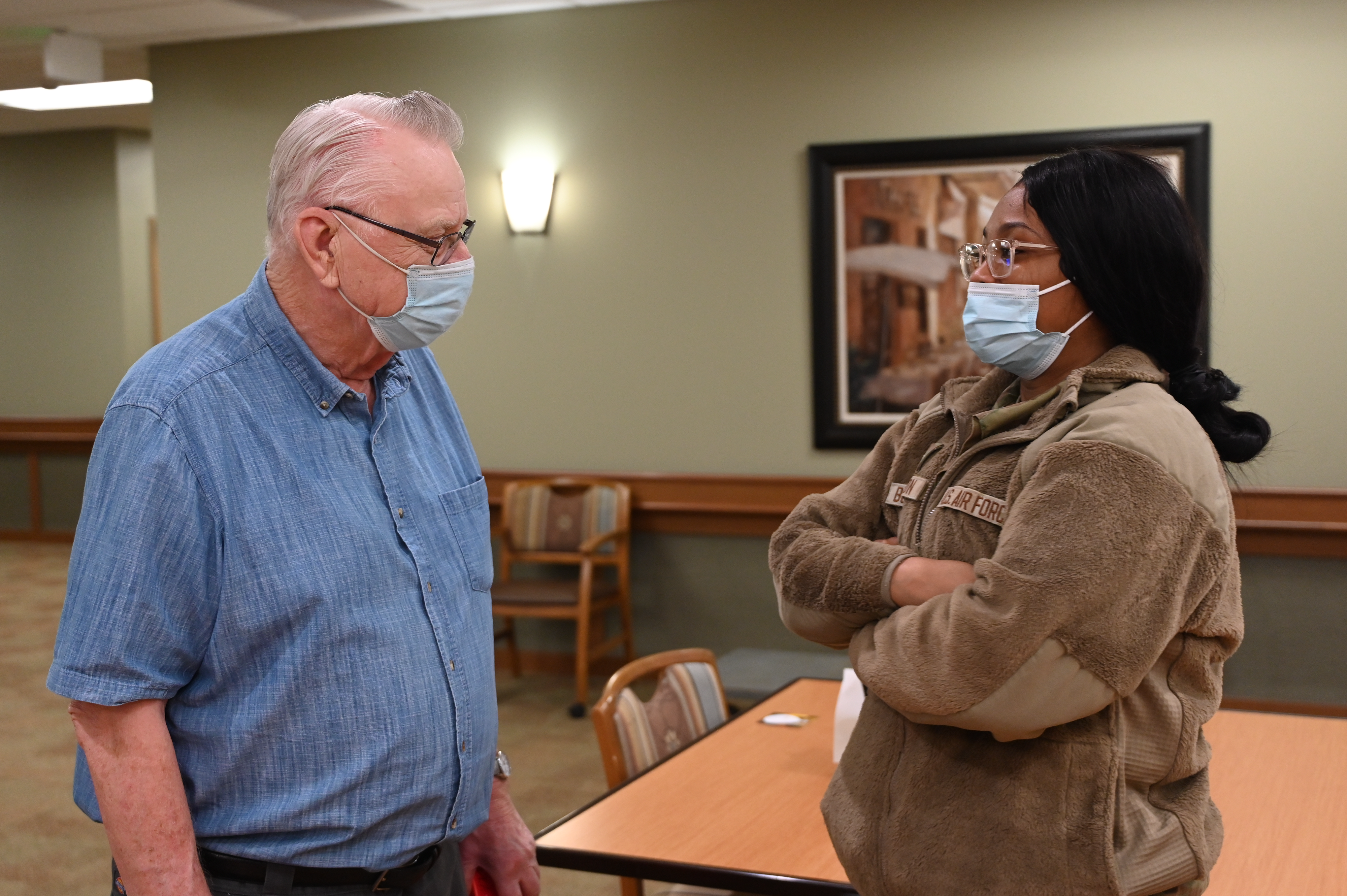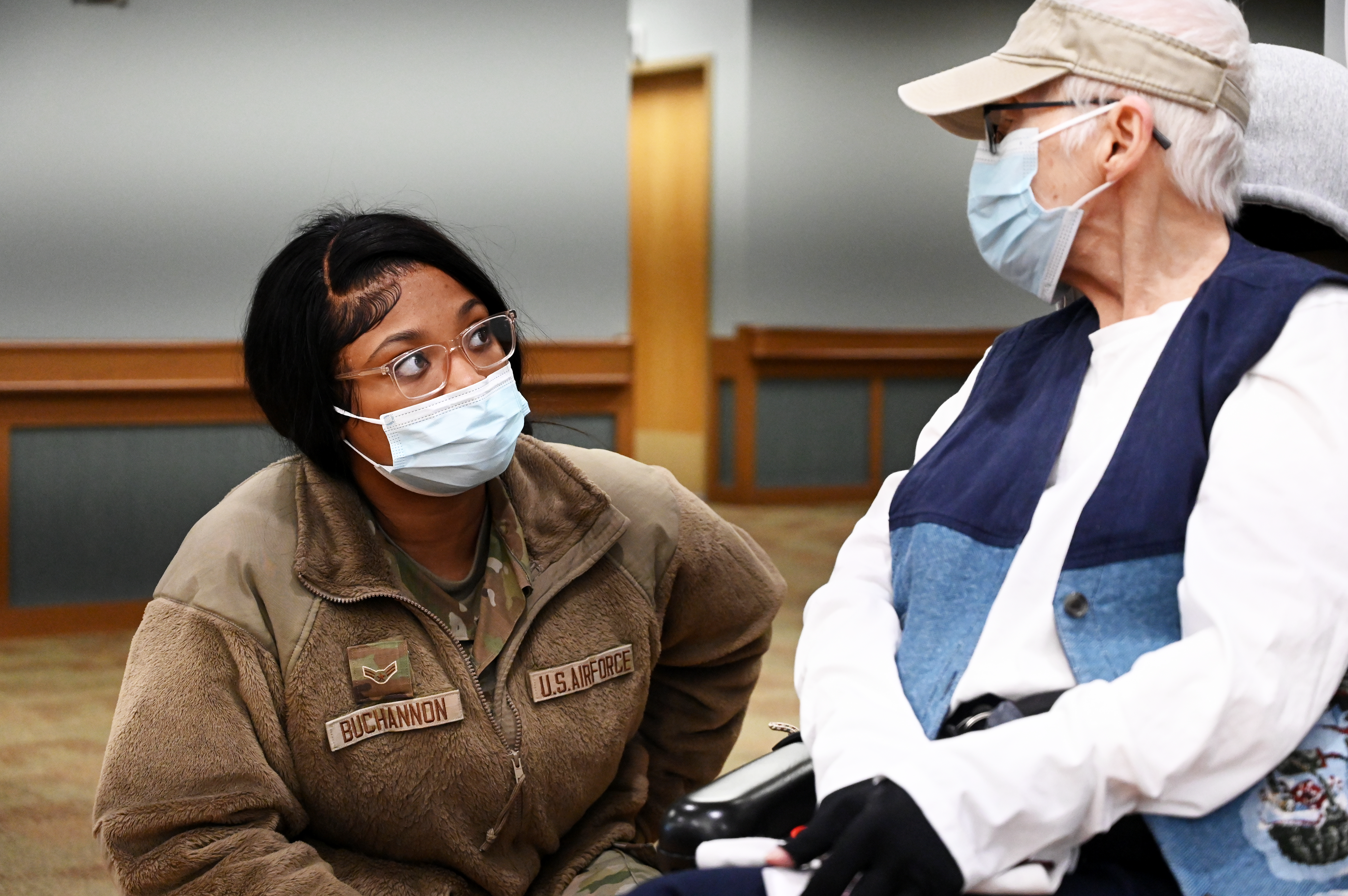 Airman 1st Class Tylia Buchannon, 119th Operations Group, visits with a resident of the North Dakota Veterans Home during the annual National Guard Christmas party held at the facility, Dec. 21, 2022, Lisbon, N.D.