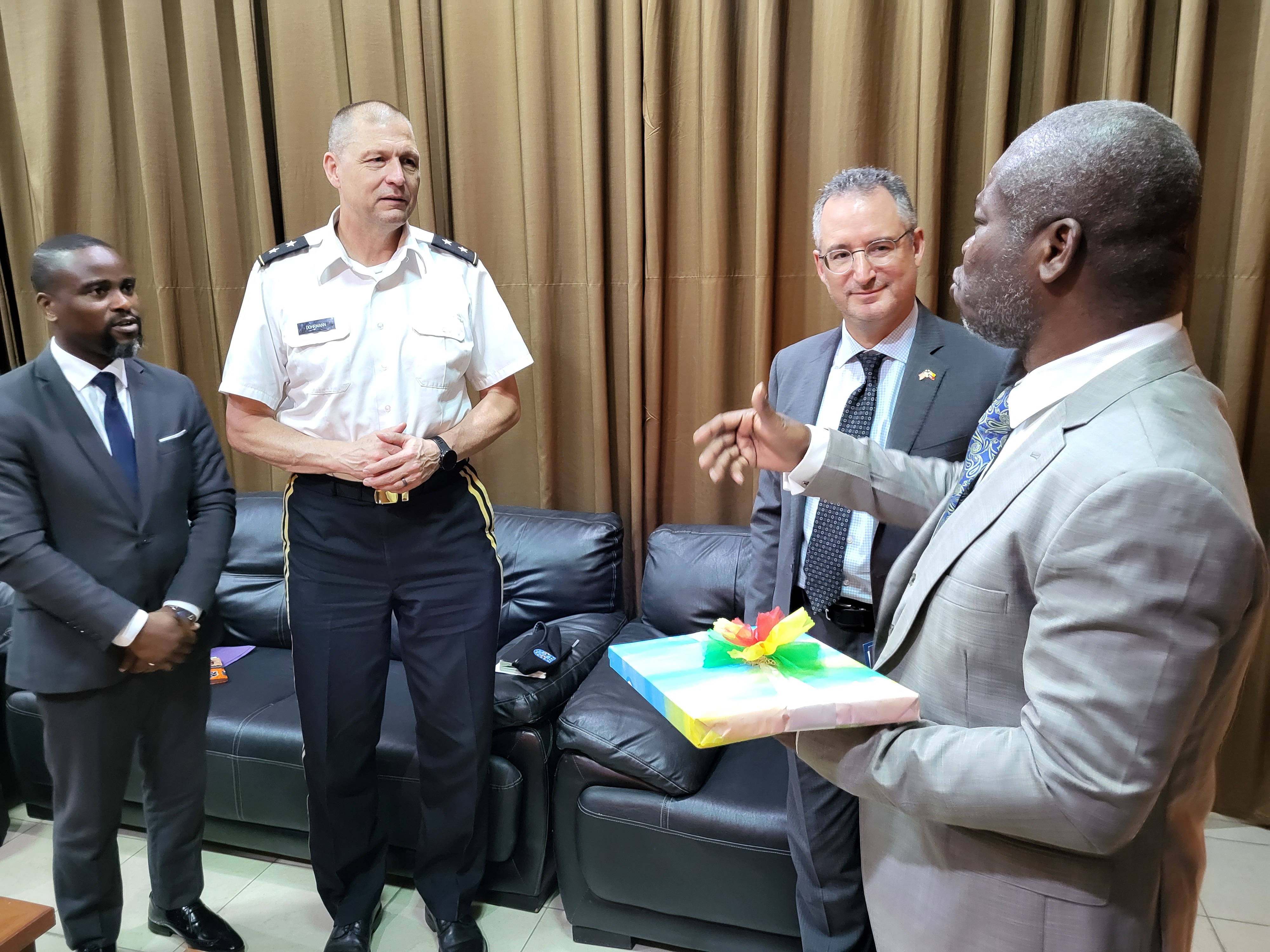 Benin's Minister of Defense Fortunet Alain Nouatin welcomed the N.D. adjutant general and expressed gratitude for the interest in his country. The gathering also included the U.S. Ambassador to Benin, Brian Shukan and the NDNG's bilateral affairs officer, Lt. Col. Paul Dosch. Nouatin expressed his hopes that this partnership will contribute to the Benin National Guard's efforts to (BNG) become fully operational.