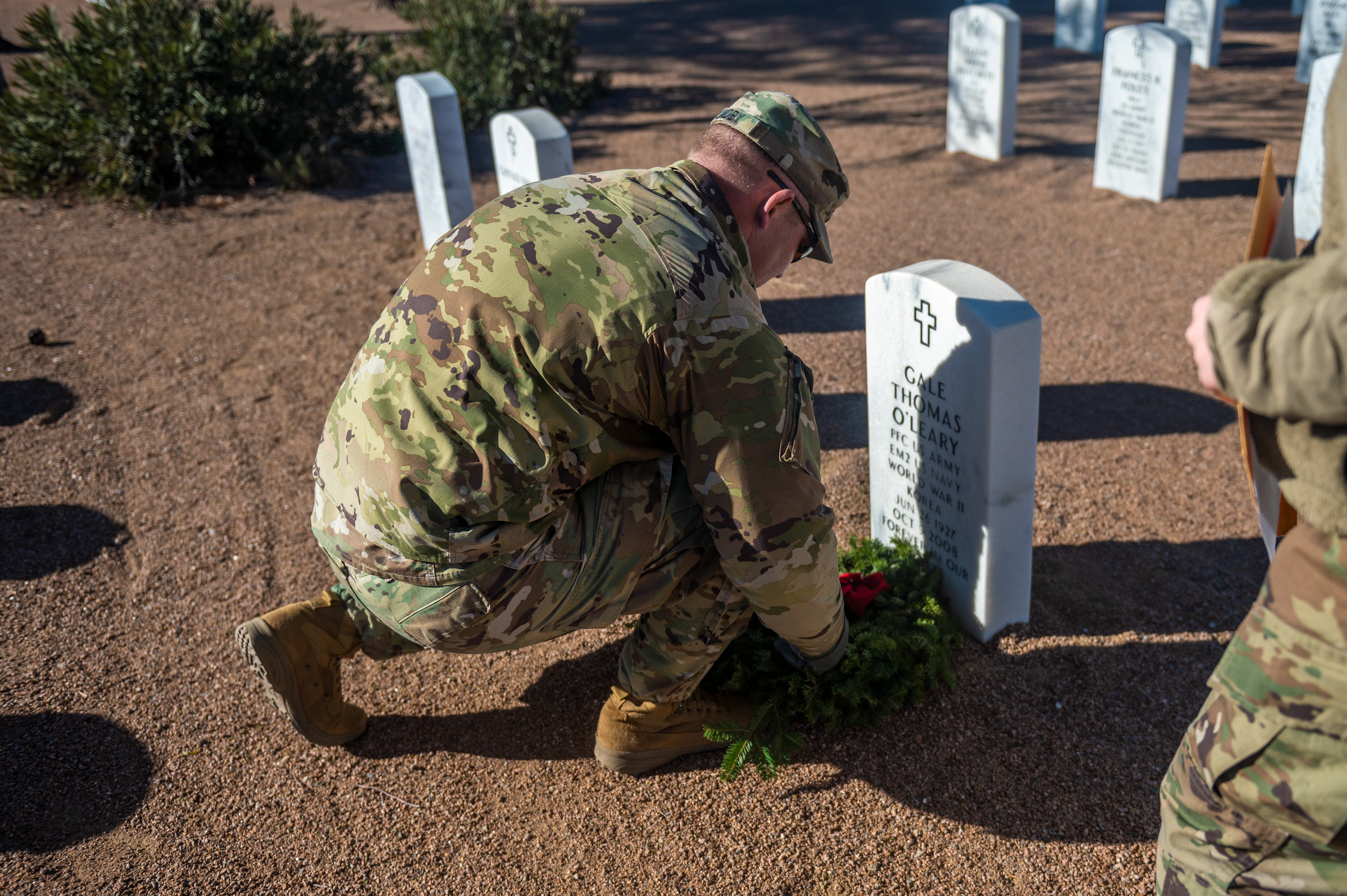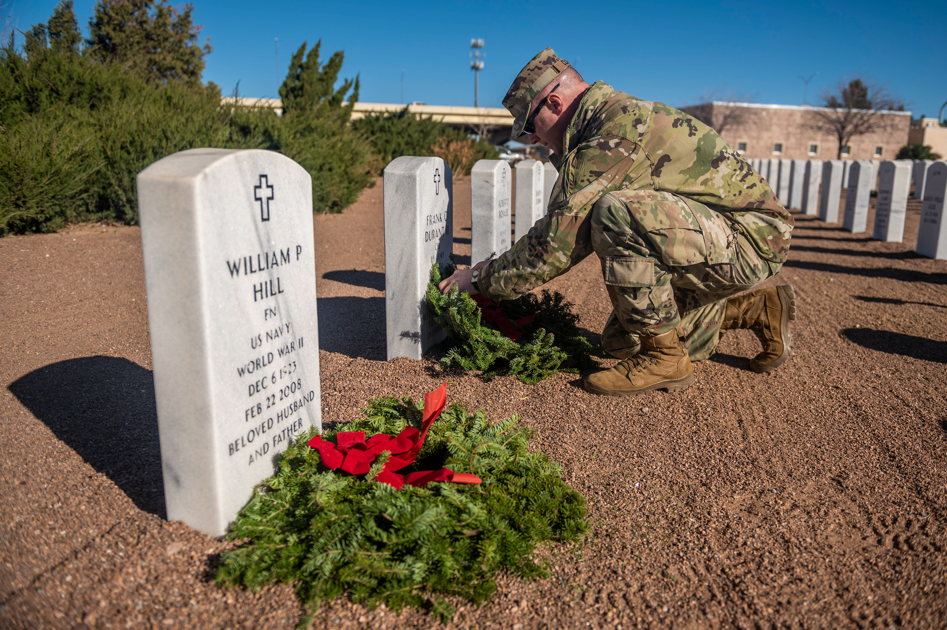 Maj. Russ Sundby, 1st Battalion, 112th Aviation Regiment commander, places a wreath on a gravestone during Wreaths Across America, Dec. 17, 2022, El Paso, Texas.