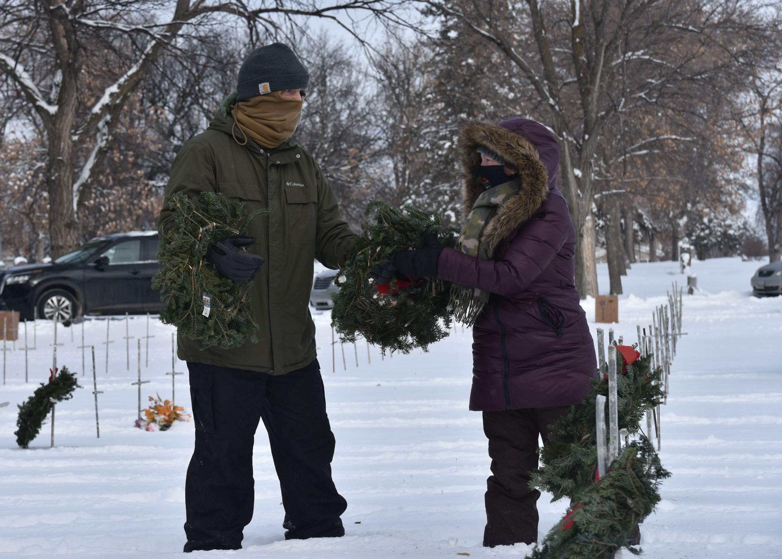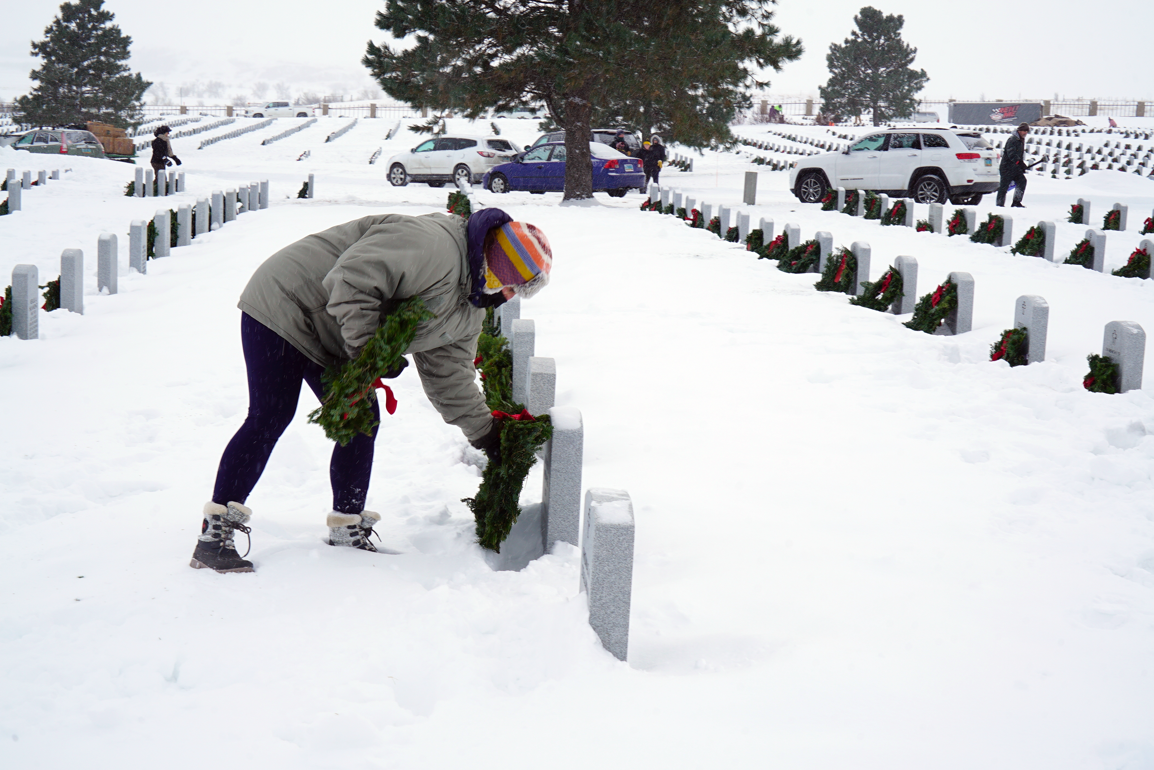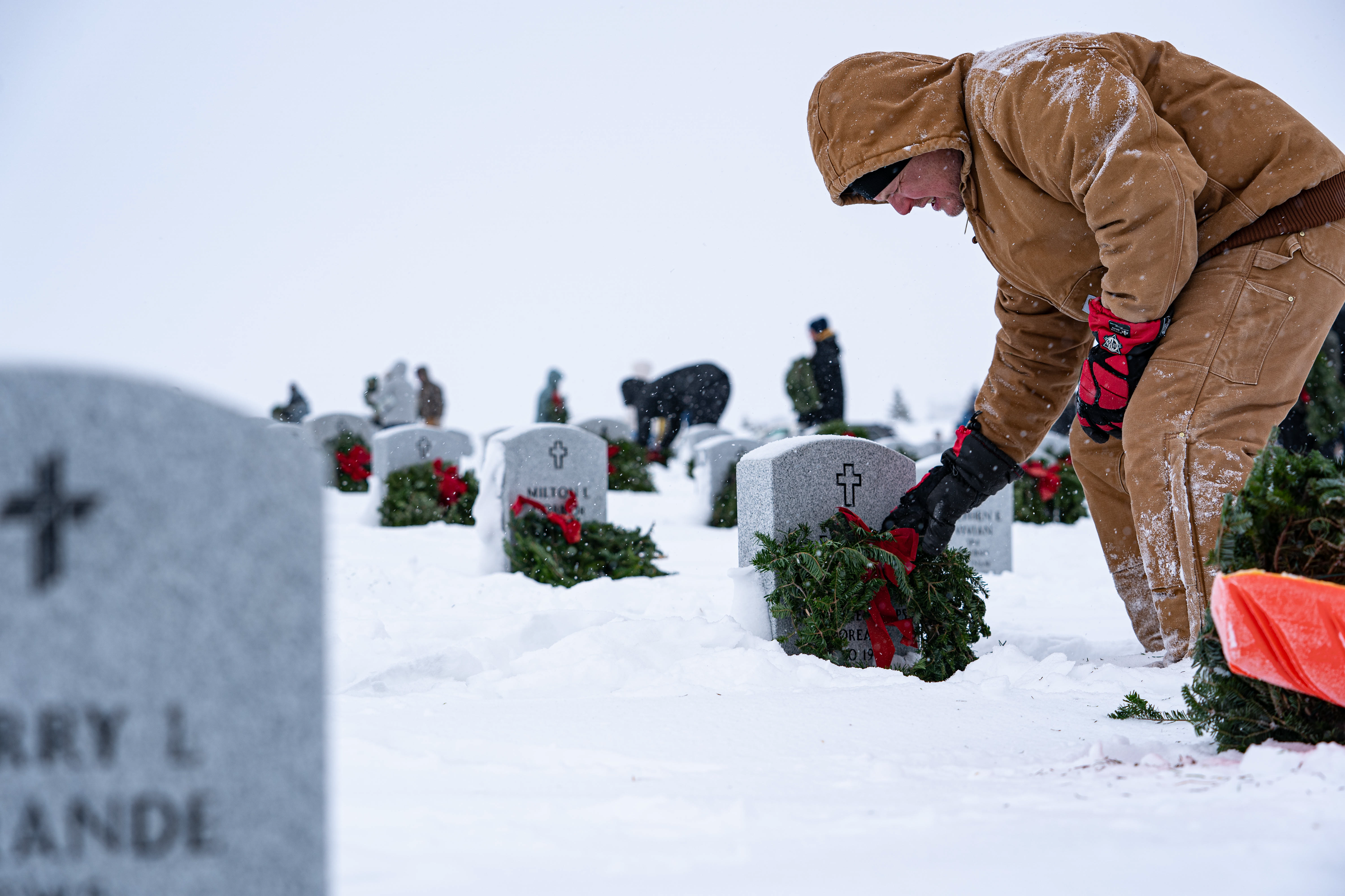 Volunteers place wreaths during the Wreaths Across America event at the N.D. Veterans Cemetery, Mandan, N.D. on Dec. 18, 2022. (National Guard photo by Staff Sgt. Sam Kroll, N.D. National Guard Visual Information)