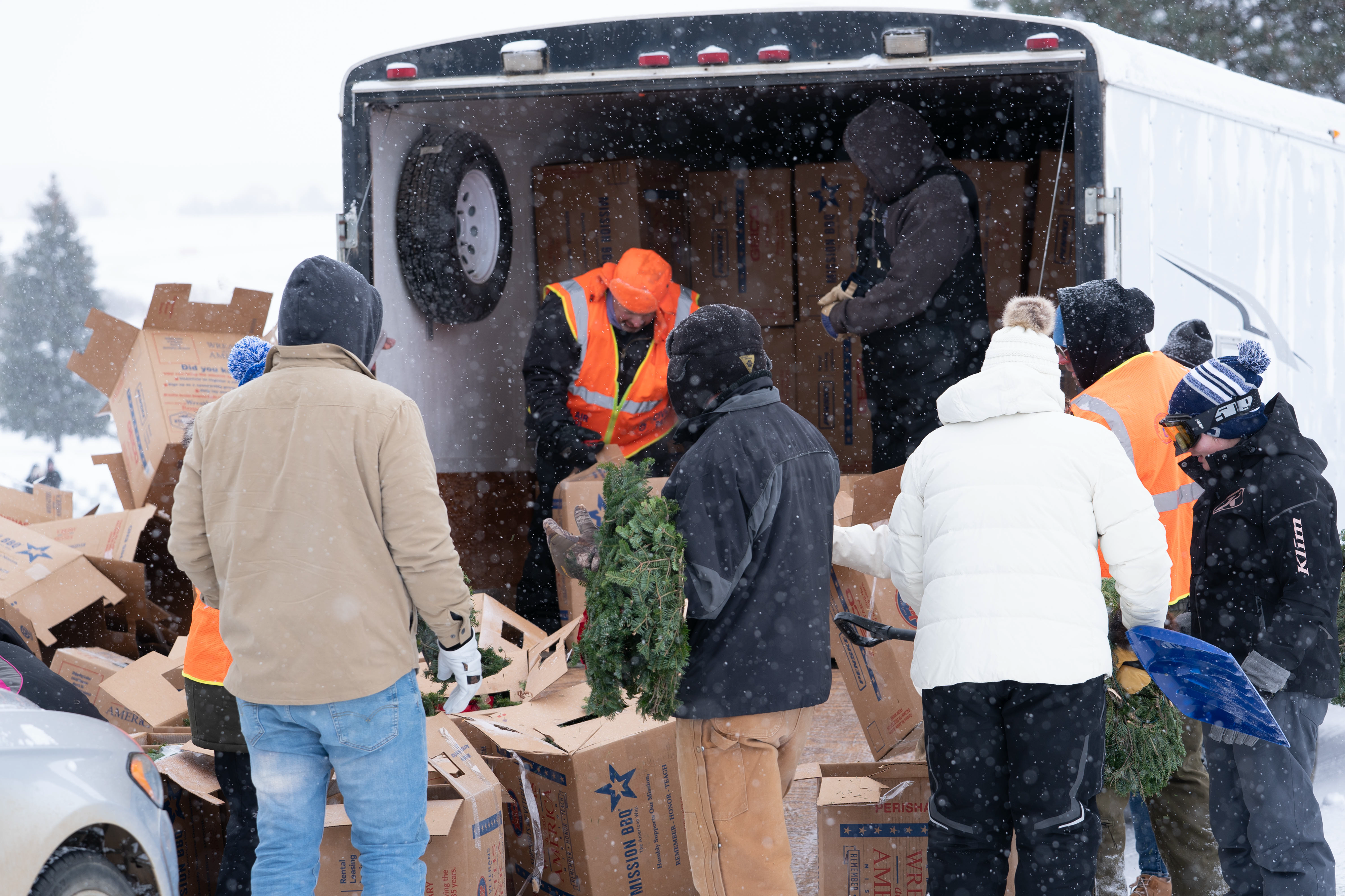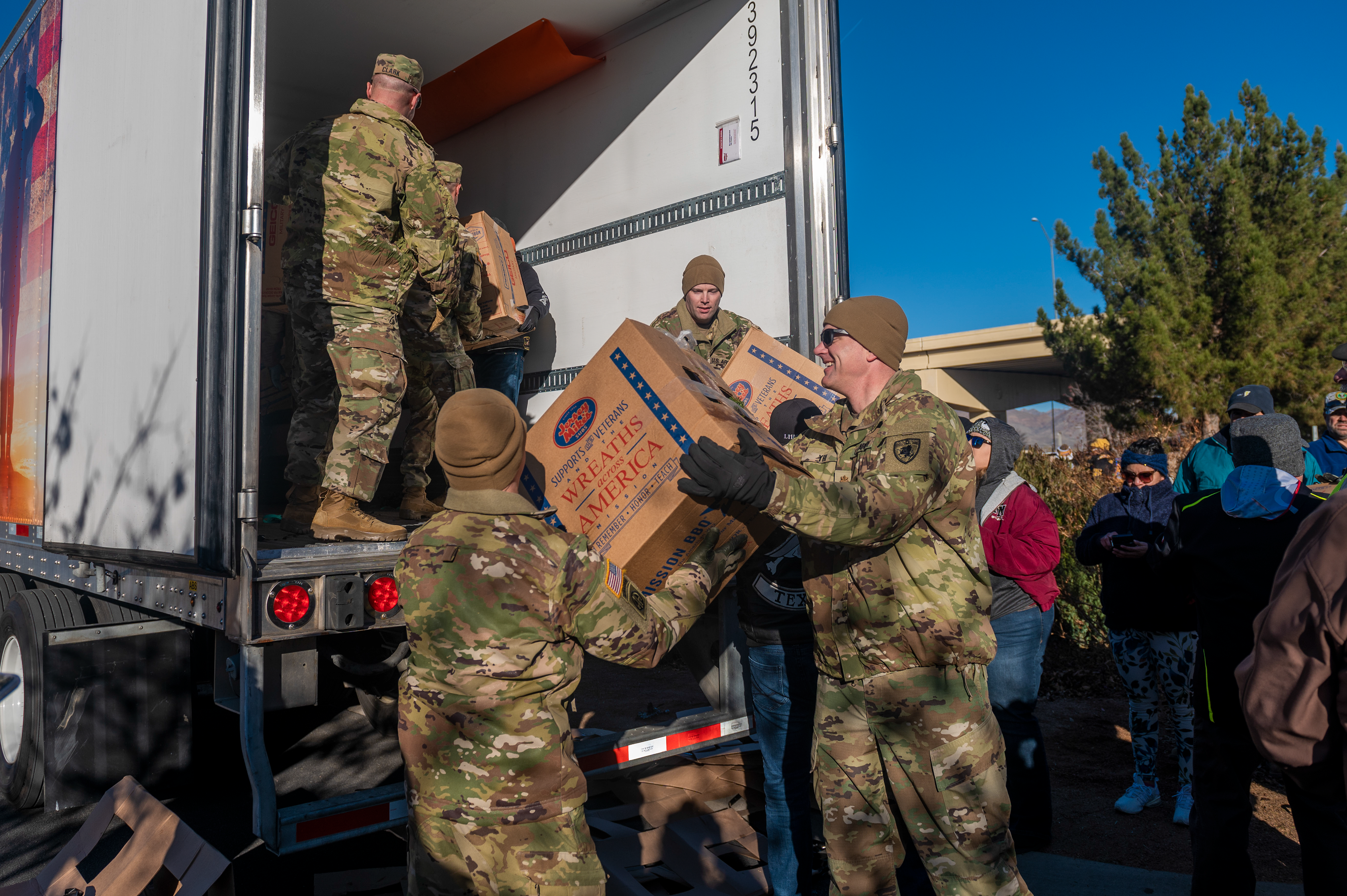 Soldiers of 1st Battalion, 112th Aviation Regiment, North Dakota National Guard, unload boxes of wreaths during Wreaths Across America, Dec. 17, 2022, El Paso, Texas.