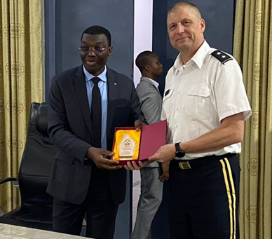Minister (Brigadier General) Damehame Yark, Ministry of Security and Civil Protection (MSCP) of Togo, left, presents Maj. Gen. Al Dohrmann, N.D. adjutant general, a plaque representing the agency, Dec. 13, 2022, Lomé, Togo.