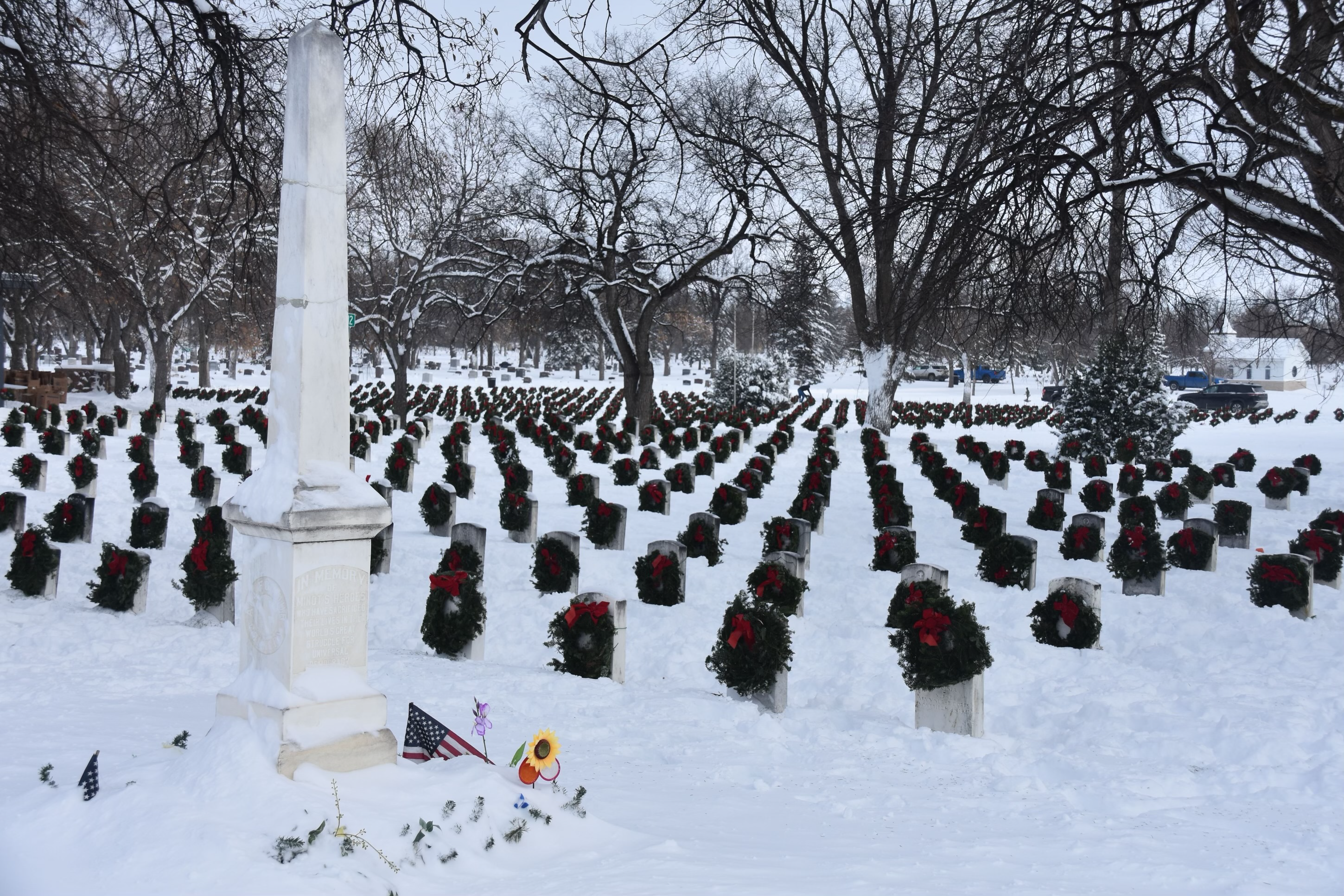 This annual holiday event is one of more than 3,400 wreath-laying ceremonies across the United States. Of the locations hosted nationally by the Civil Air Patrol, the event at the N.D. Veterans Cemetery is rated at the top, with Minot at seventh place. This year enough money was raised to sponsor 9,826 wreaths, more than number of graves at the N.D. Veterans Cemetery. The extra ones were provided to other sites.