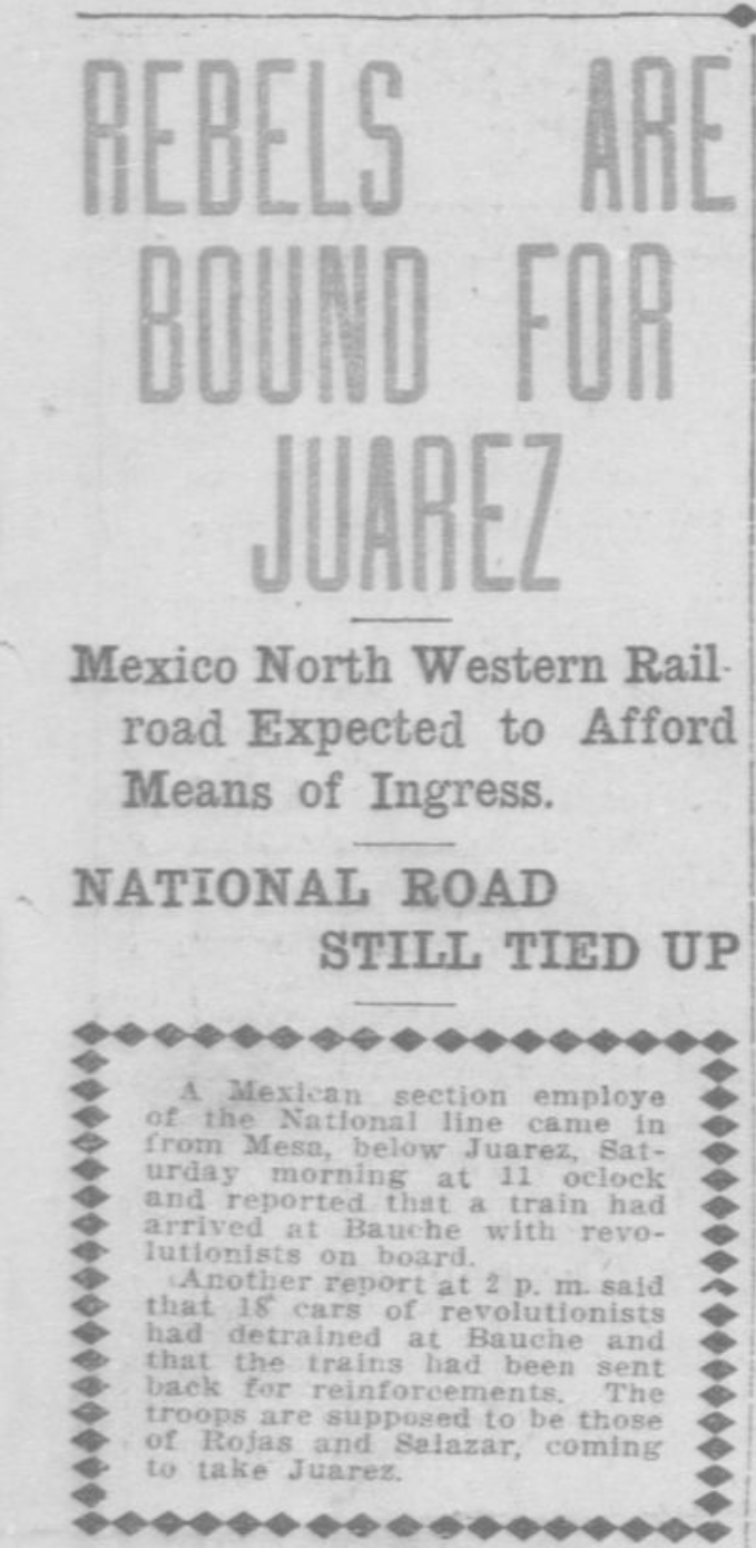Mientras estaba en el exilio, Madero ordenó ataques contra las tropas de Díaz. El ejército revolucionario de Madero y las tropas federales de Díaz lucharon a lo largo del ferrocarril del norte de México y de los pueblos de hacienda que florecieron durante el Porfiriato. Los ejércitos de Madero y Díaz necesitaban el ferrocarril para transportar tropas y suministros a los lugares de batalla en todo el norte de México.