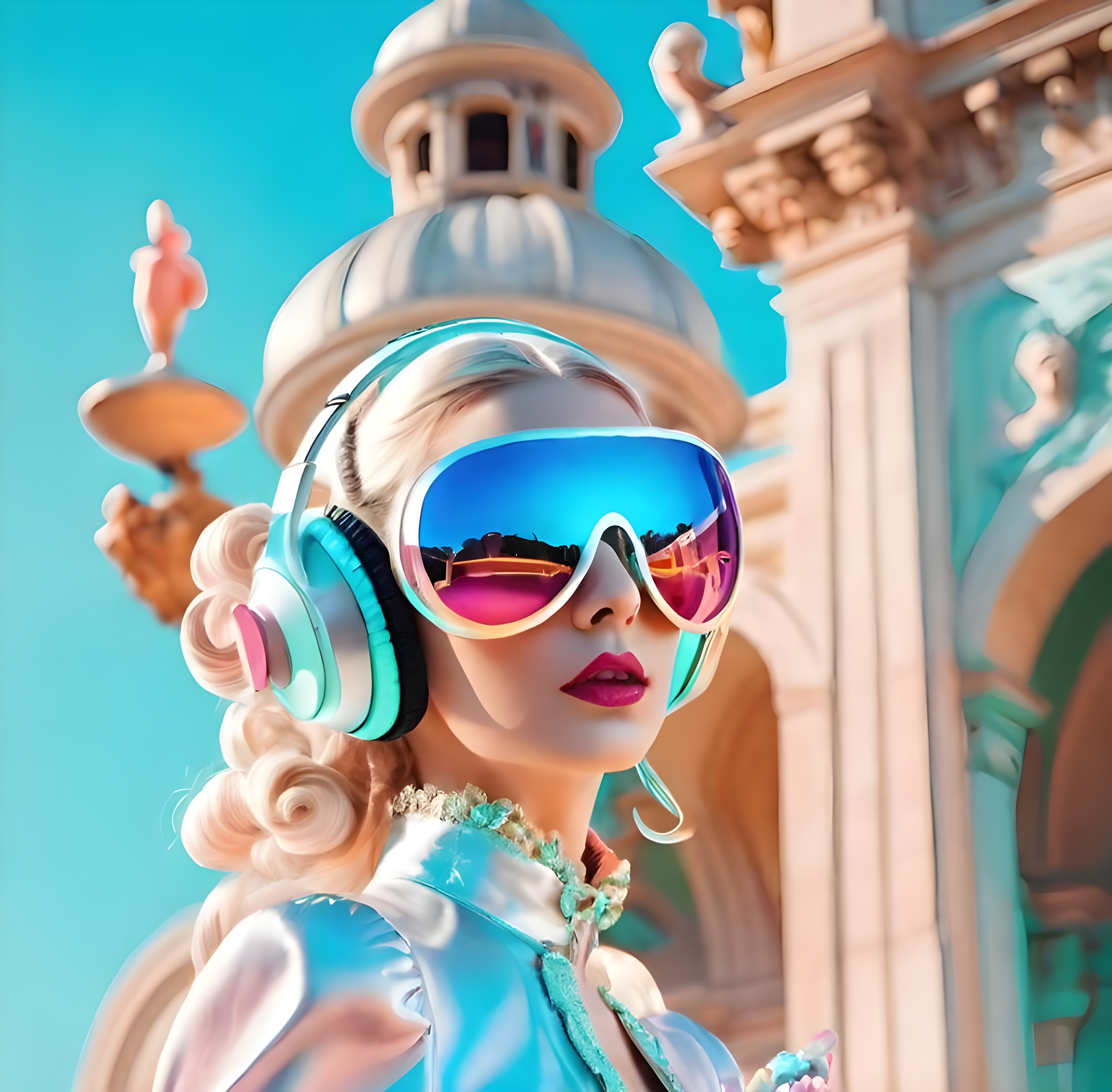 Created with images by AD - "Businessman hand hold digital marketing, SEO strategies, social media campaigns, PPC advertising, influencer marketing, content creation, conversion optimization, branding, customer engagement" • palangsi - "Futuristic lady in renaissance rococo fashion wearing glowing headphones and avant Garde reflective sunglasses"