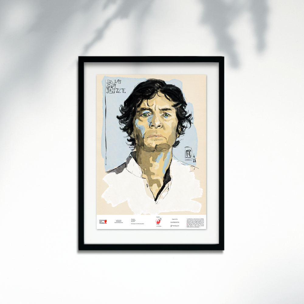 I thought the podcast Mr. Drosten did at the beginning of the pandemic was good, because it really went into detail, one wanted to know everything as precisely as possible. So Drosten was a point of orientation for me. That's why I understand the painting as a small thank-you and I also portrayed Drosten a little heroically. But also with a certain sadness. It's the sadness that he talked his head off, but politics did not listen to him. Science was denied because economic interests and money always took first priority, unfortunately. I found the quote I wrote on the picture, "Ja, ist gut jetzt" - It's OK now - on Twitter. Drosten was responding to a Corona denier and I think it shows the resignation of many scientists. When you research something so intensively like Dr. Drosten and then warn and get invested, but the warnings are not taken seriously because there are people who want to profit from it - that must be frustrating.