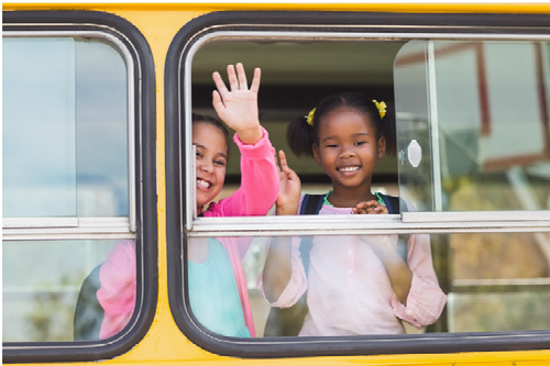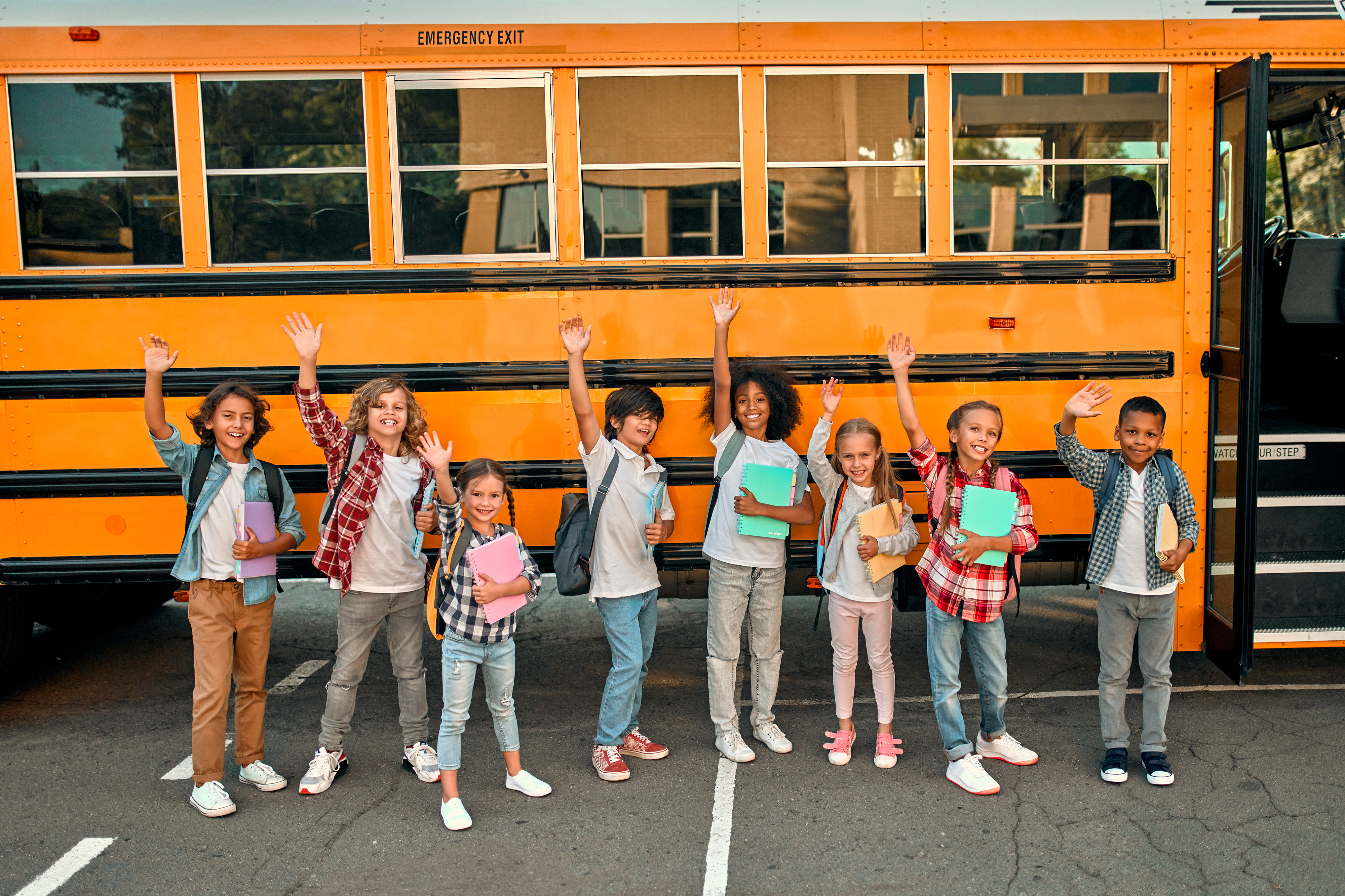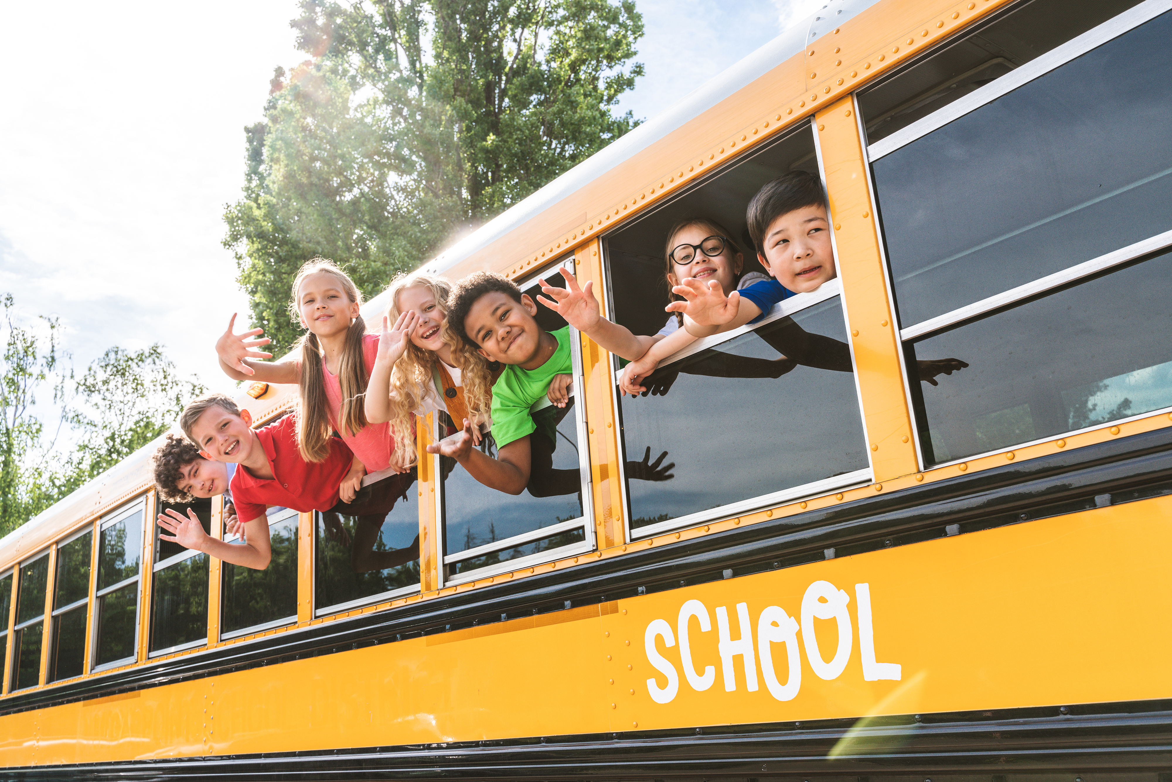 Created with images by Vasyl - "Children near school bus" • oneinchpunch - "Group of young students attending primary school on a yellow school bus" • WavebreakmediaMicro - "Portrait of school kids waving hand from bus " • Vasyl - "Children near school bus"