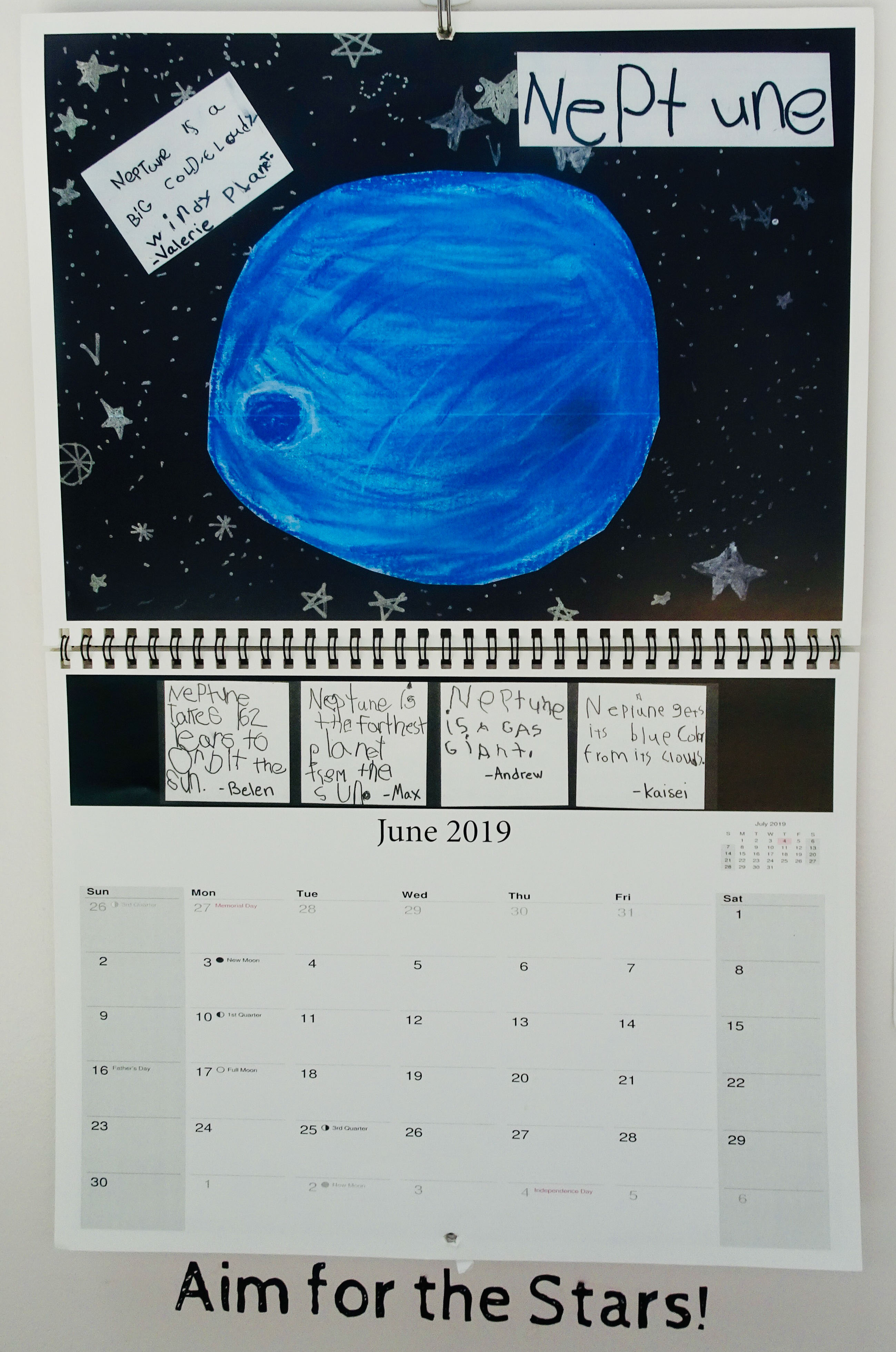 Whilst walking around the school I was struck by the vast amount of student work that was on display. Student work was hung on just about every wall and from every ceiling. It felt like walking through an art gallery where the exhibits were continually refreshed and updated. One specific piece of student work that excited me was a calendar of the planets in our solar system (pictured here). This calendar had been made by year 1 students to answer questions like 'what is space?', 'where are we in space?', and 'what does it take to explore space together?'. The calendar is a final product that combined students' love of art and science. Groups of students worked together to research facts about the planets and then created scientifically accurate illustrations.