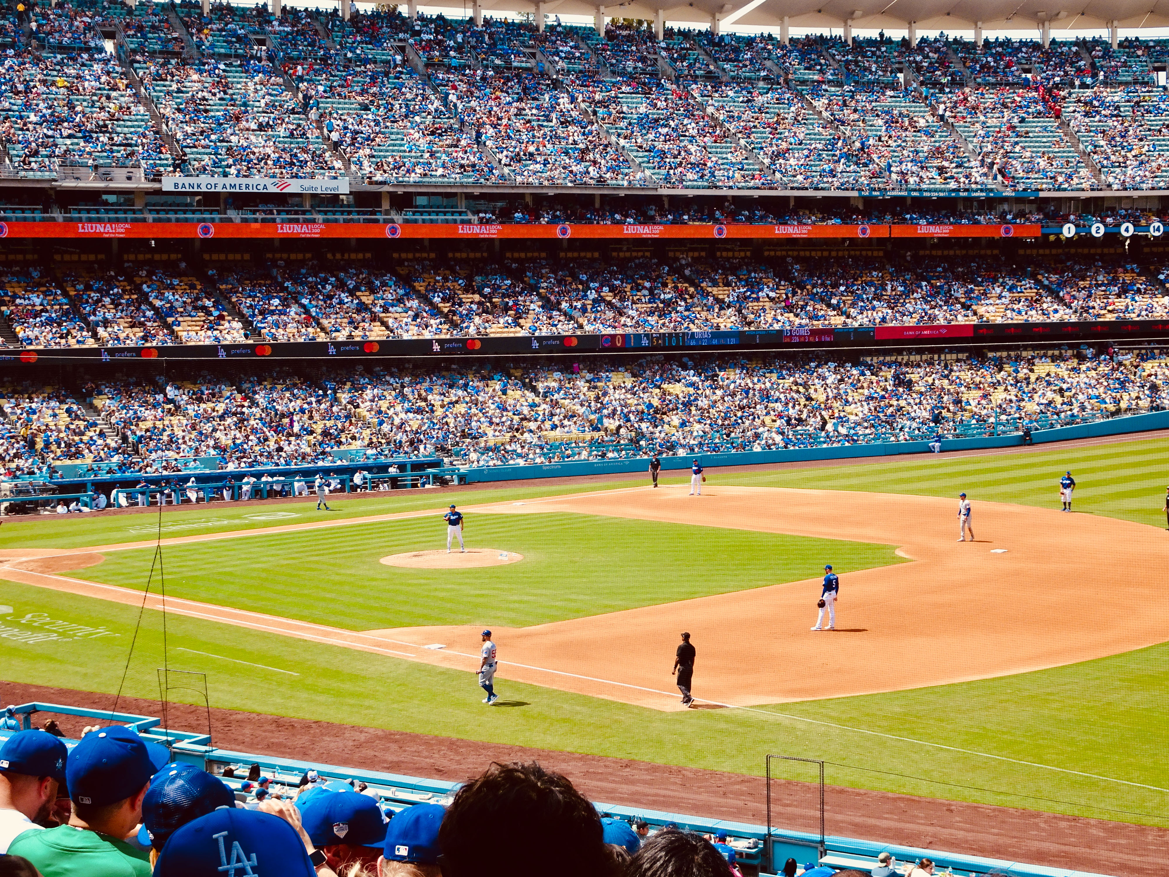 I met some fellow sports fans during my tour of SoFi stadium from the USA and England and ended up sharing a ride to Dodger Stadium with a guy from Chicago. He was a Cubs fan, and they were in town to play the Dodgers. This was my first time at an LA Dodgers game and the atmosphere was amazing. Live sports in America really keep you entertained from start to finish by providing lots of fan interaction, stats, food and merchandise. This was a great end to my first day.