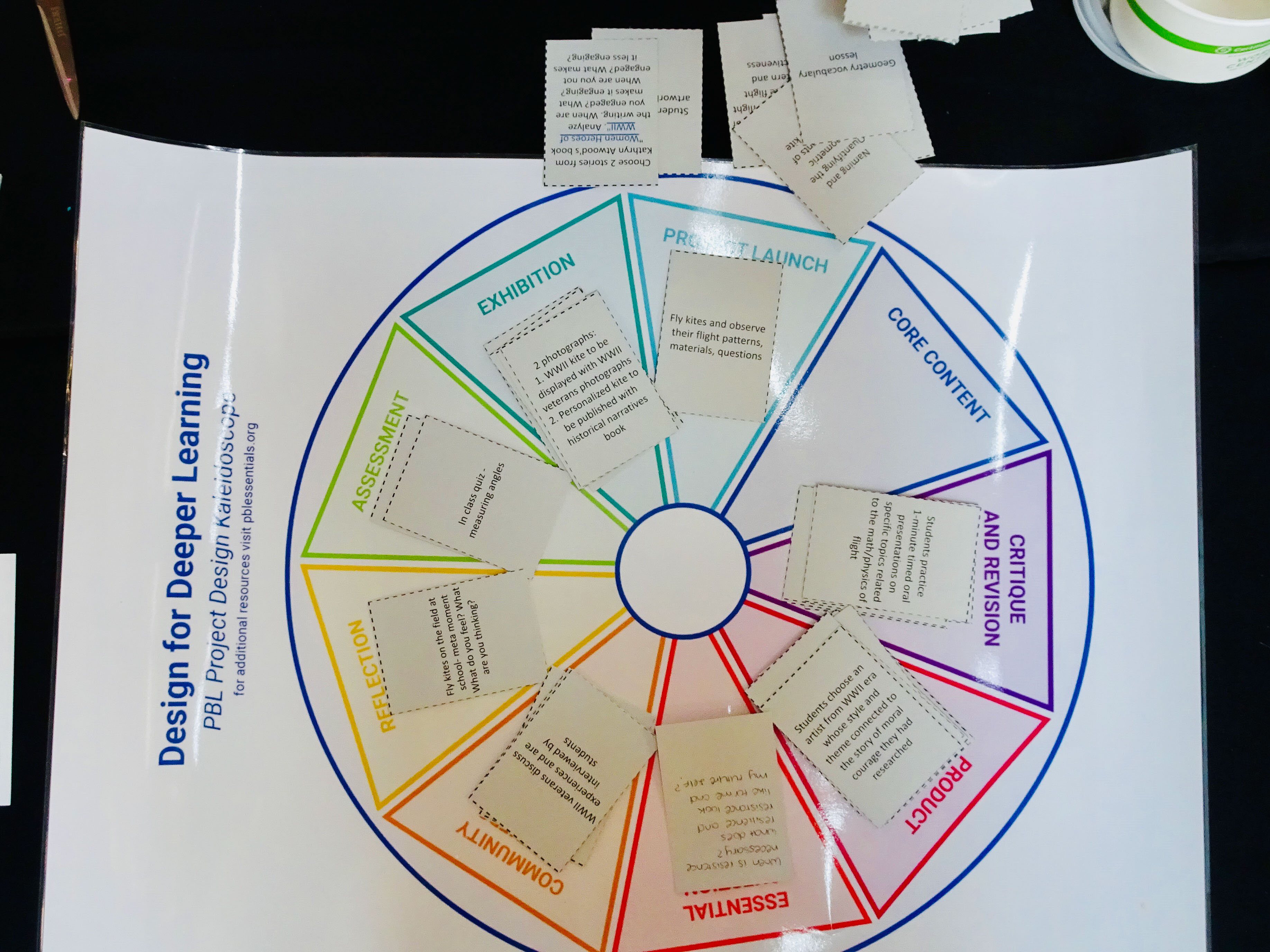The main focus of day 2 was to develop a project idea using the PBL Deeper Learning Kaleidoscope (pictured right). The Kaleidoscope is a scaffold to help teachers design transformative learning experiences. We worked in groups to collaboratively develop a project idea we had chosen using various design strategies. One strategy we used was called 'Yes, and...'. This ideation protocol involved each member of the group sharing their idea and then receiving feedback on community partners that could be included in the project, things students could make, resources to support students, questions that students could explore and suggestions on how student work could be exhibited.