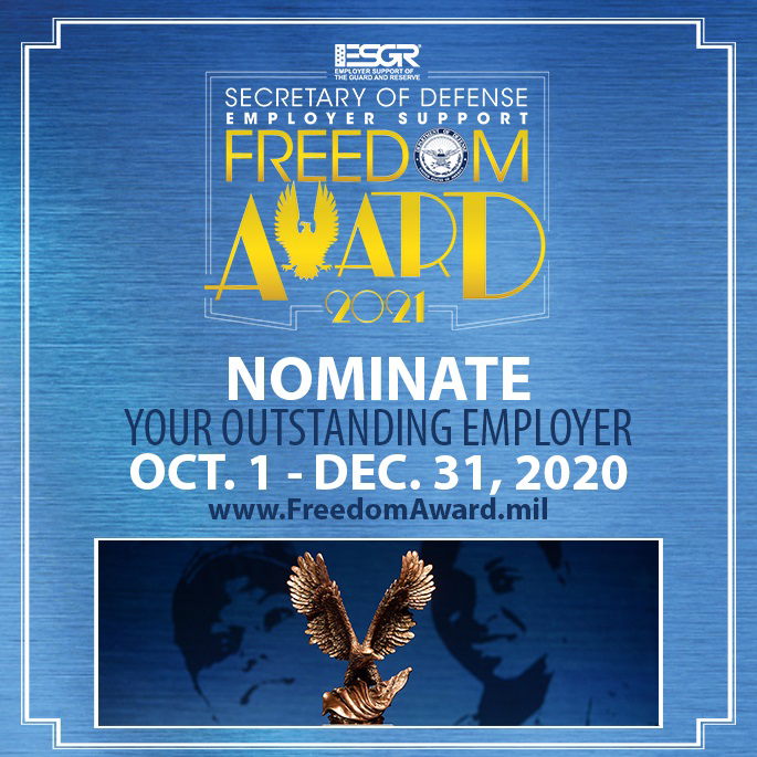The ESGR's Secretary of Defense Employer Freedom Award was established in 1996 and is the highest award administered in recognition of exceptional employer support, with 295 honorees to date. The nomination season runs from Oct. 1 through Dec. 31, 2020. For more information and to learn how to nominate your employer, click www.freedomaward.mil.