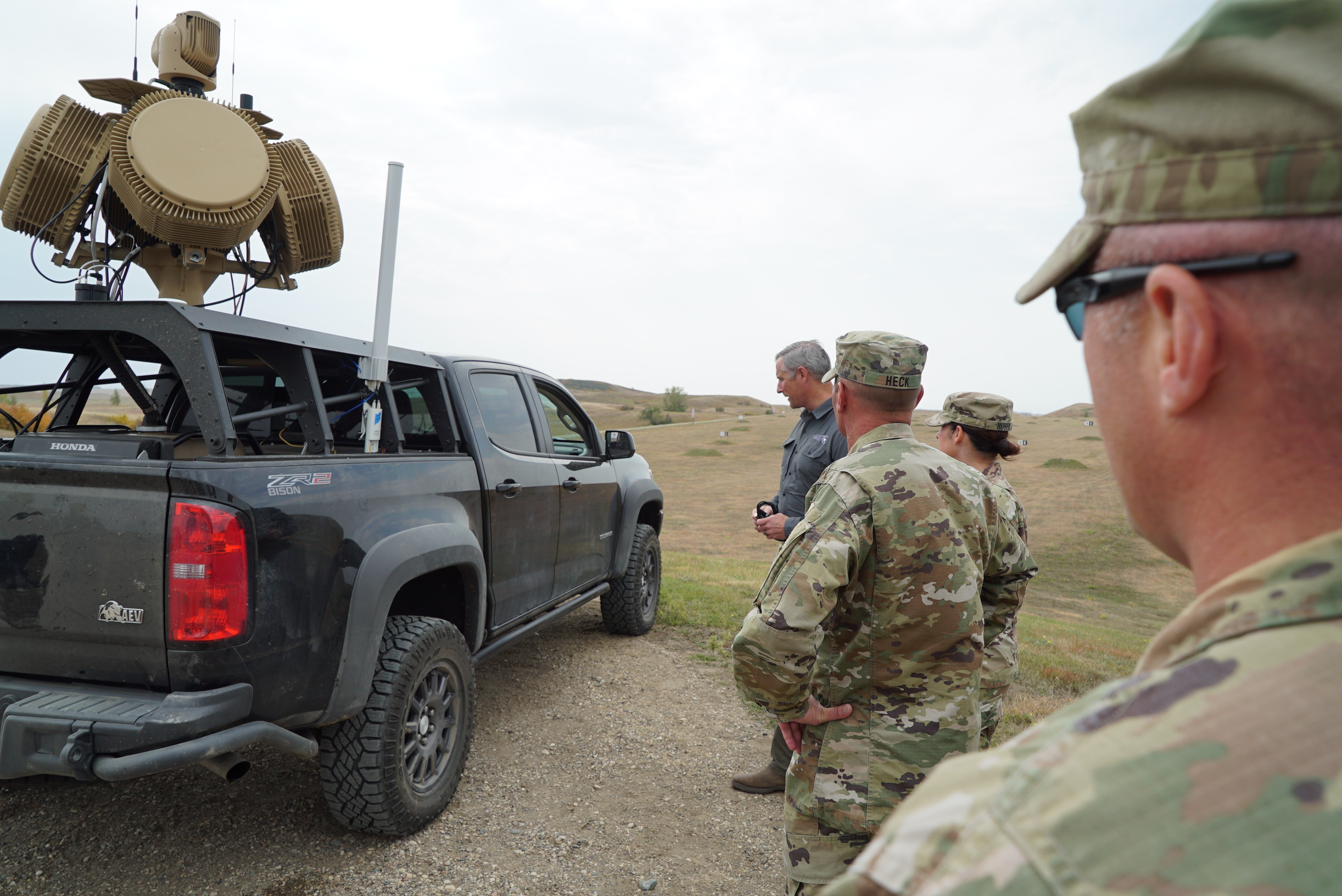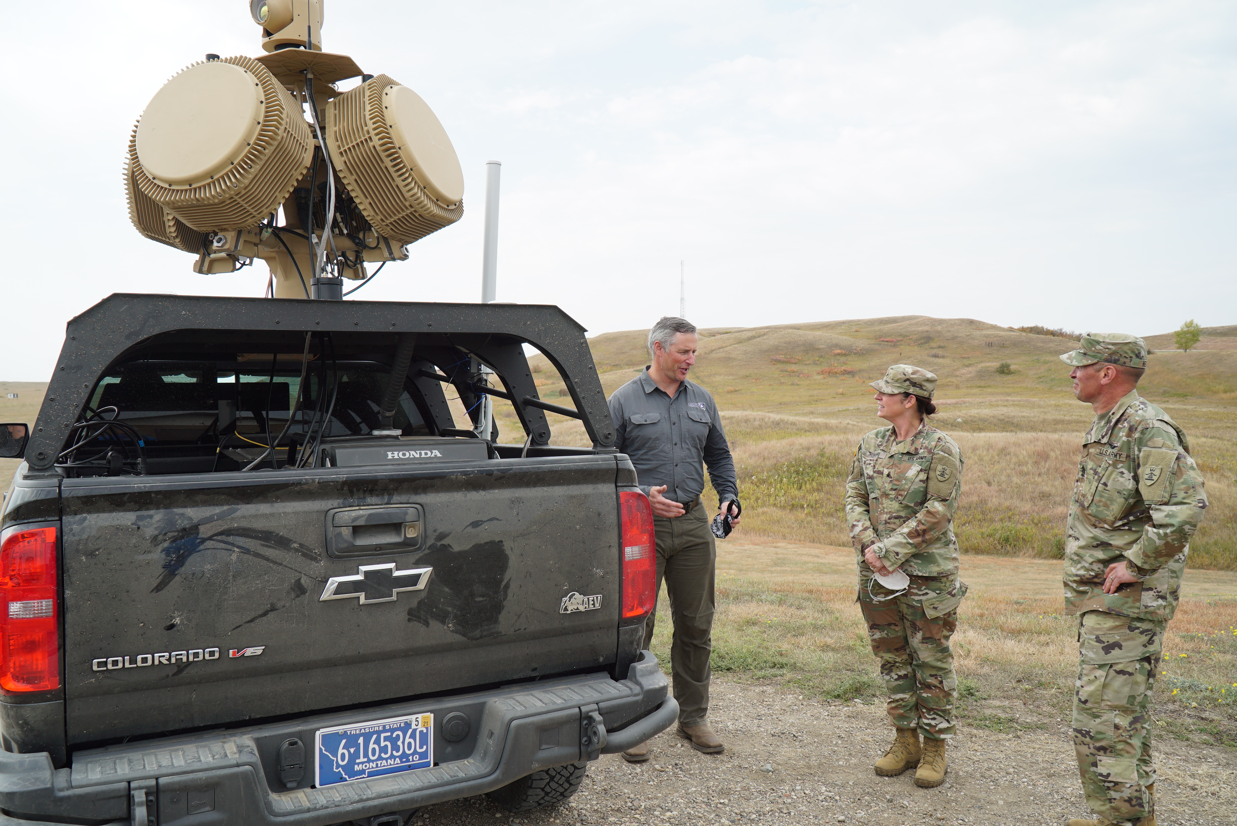 Mr. Lee Dingman, Ascent Vision Technologies (AVT), briefs Brig. Gen. Jackie Huber, deputy adjutant general, and Command Sgt. Major Derek Heck, state command sergeant major, about his company's counter Unmanned Aerial System being tested at Camp Grafton Training Center, Near Devils Lake, N.D. on Sept. 23, 2020. CACI, AVT’s parent company was also present. (U.S. National Guard photo by Sgt. 1st Class Charles Highland, N.D. National Guard Public Affairs Office)