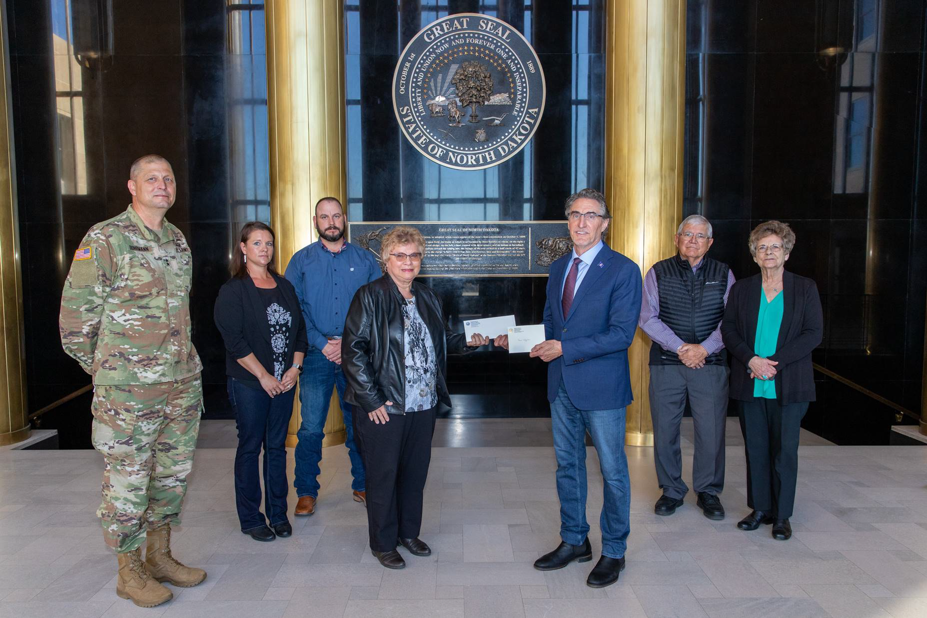 A U.S. Army identification tag (dog tag) belonging to a North Dakota Soldier finally came home. Spc. Ronald D. Hepper lost the tag when he was wounded by a grenade during the Vietnam War more than 50 years ago. The tag resurfaced in Russia and was returned to the Soldier's widow, Ruth Hepper by Gov. Doug Burgum during a ceremony on Sept. 30, 2020 at the N.D. State Capitol. Ronald Hepper passed away in 2007 at the age of 58. Click for more information. (Story and photo by Mark Staples, Office of the Governor)