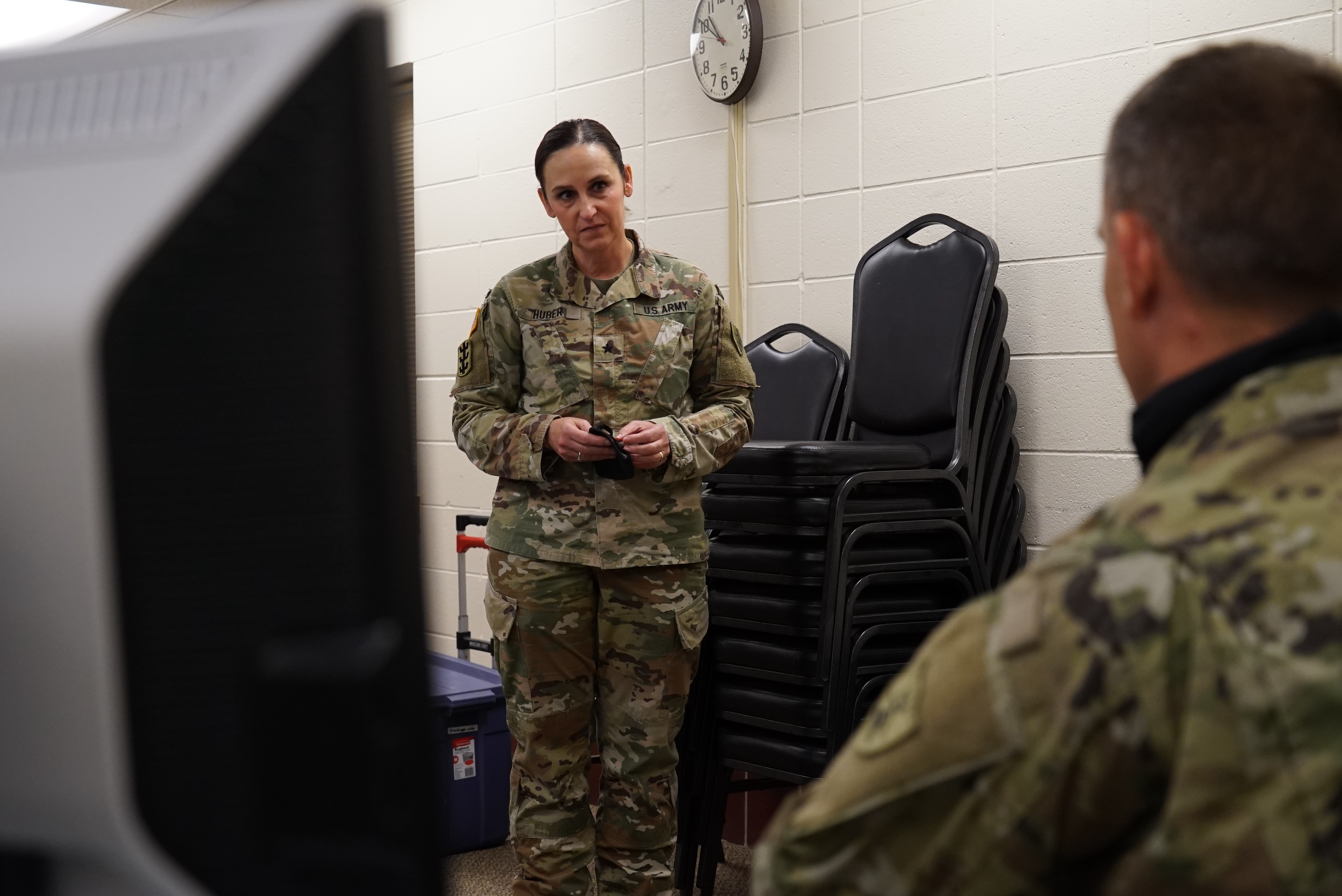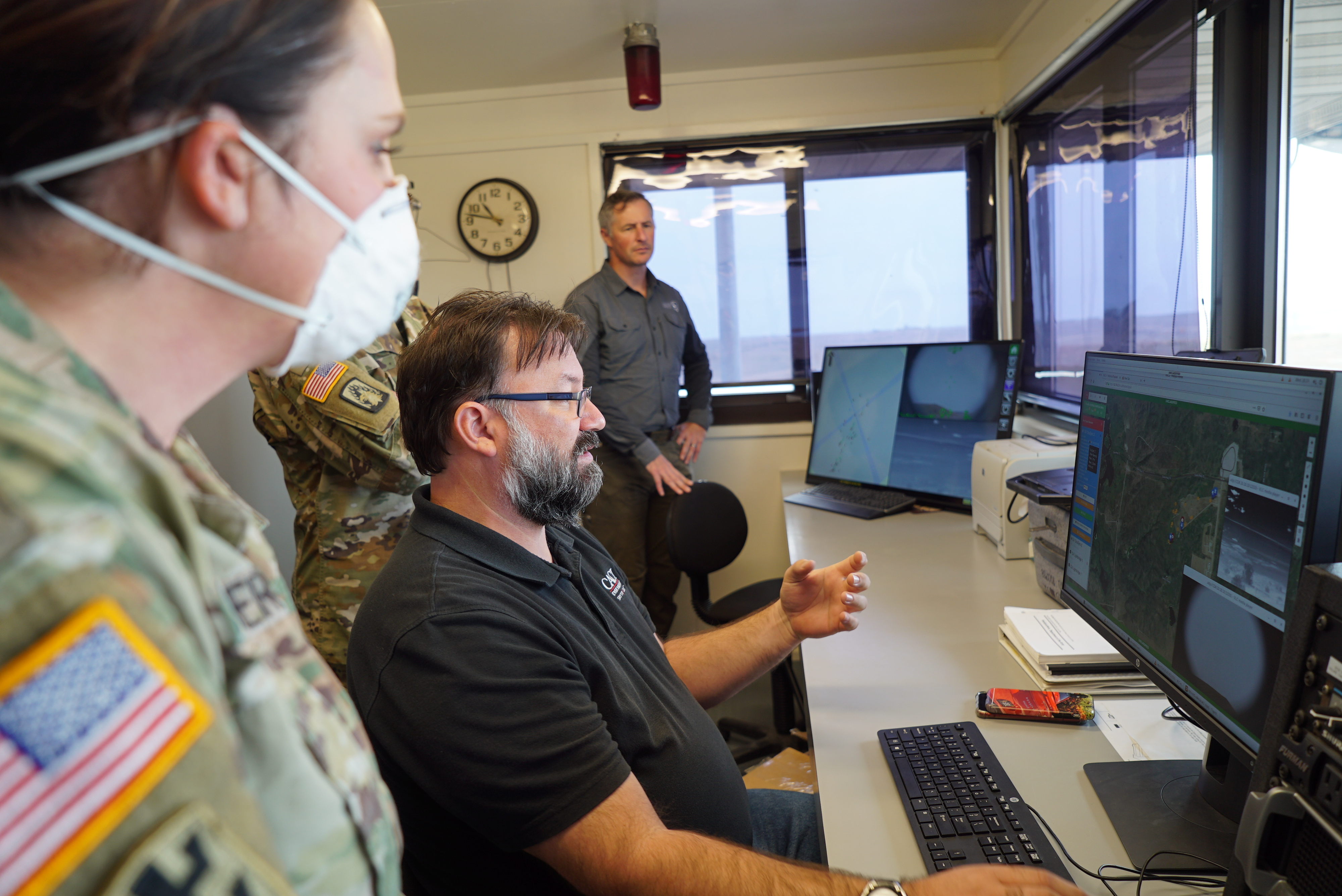 Brig. Gen. Jackie Huber, deputy adjutant general, receives a briefing from Ascent Vision Technologies and CACI employees during counter UAS system testing at CGTC on Sept. 23, 2020.