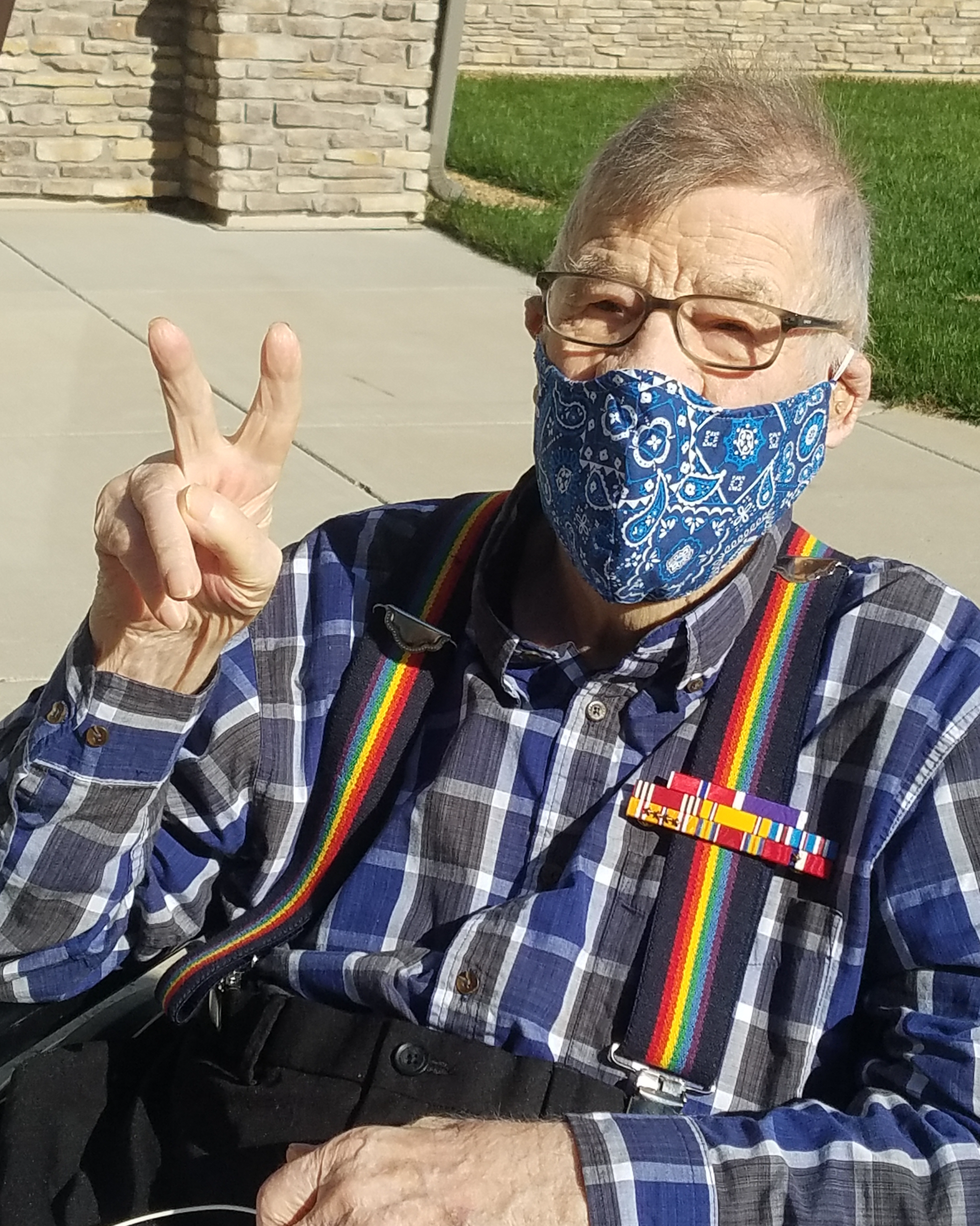 Staff Sgt Louis J. Hanson, who served with Company E, 164th Infantry Regiment from 1941-1945, received a new ribbon bar in honor of his 101st birthday on Sept. 27, 2020. "The Japs met up with somebody new," quipped Hanson when recalling the Regiment's landing on Guadalcanal Oct. 13, 1942 while reinforcing the 1st Marine Division. He earned four "battle" stars for his service during the campaigns of Guadalcanal, Northern Solomons, Leyte and Southern Philippines. (U.S. National Guard story and photo by Shirley J. Olgeirson, N.D. National Guard historian)