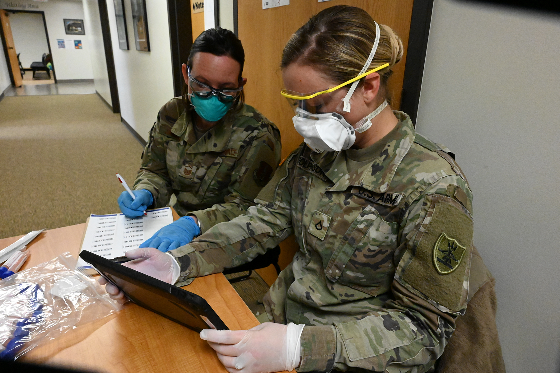 Tech. Sgt. Tiffany Jasmann, of the 119th Services Flight, left, writes tracking information as she helps process testing information of Tech. Sgt. Josh Hawkins, of the 119th Communications Flight, at the 119th Medical Group clinic at the N.D. Air National Guard Base, Fargo, N.D., Oct. 2, 2020.