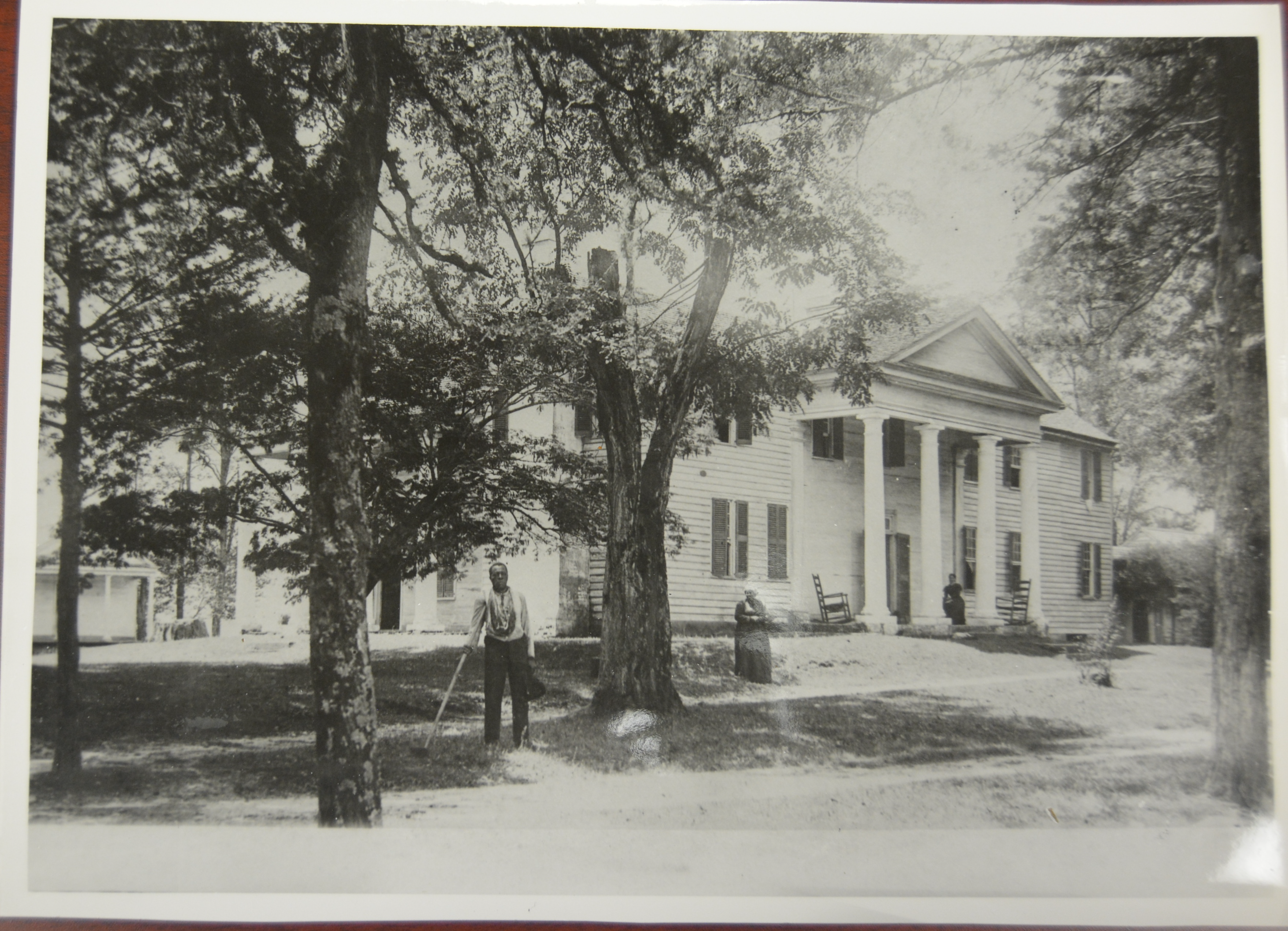 Photograph: Thomas and Frances Fruster, former enslaved persons (foreground) and Mary Prince, caretaker (on porch) at the Fort Hill Plantation house, post-Reconstruction (Source: Thomas Green Clemson Papers, Clemson University Libraries' Special Collections & Archives. Used with permission.).