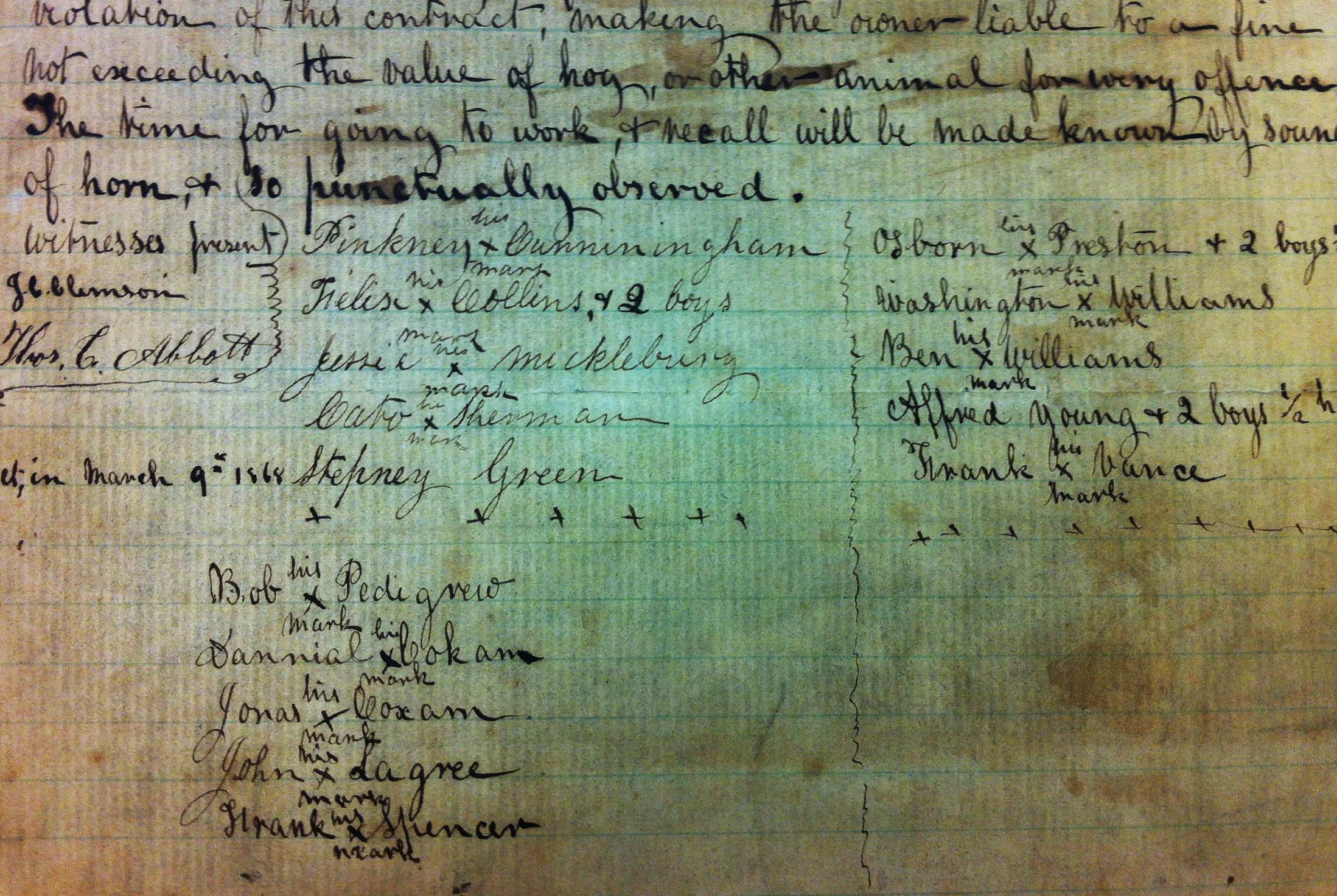 Between 1866 and 1874, at least 82 freedmen and freedwomen—formerly enslaved persons—signed annual contracts to labor as sharecroppers for Duff Green Calhoun, son of Andrew Pickens "A.P." Calhoun, and Clemson University founder Thomas Green Clemson and his agent at the Fort Hill Plantation. Children who worked alongside them were described as boys and/or classified as 1/2 or 1/4 hand. The adult laborers affixed an "X" mark (likely due to illiteracy or disability) for their signature to labor agreements that stipulated the terms of their work, including pay for planting and harvesting crops, housing arrangements, rules governing behavior, and punishments for offenses.