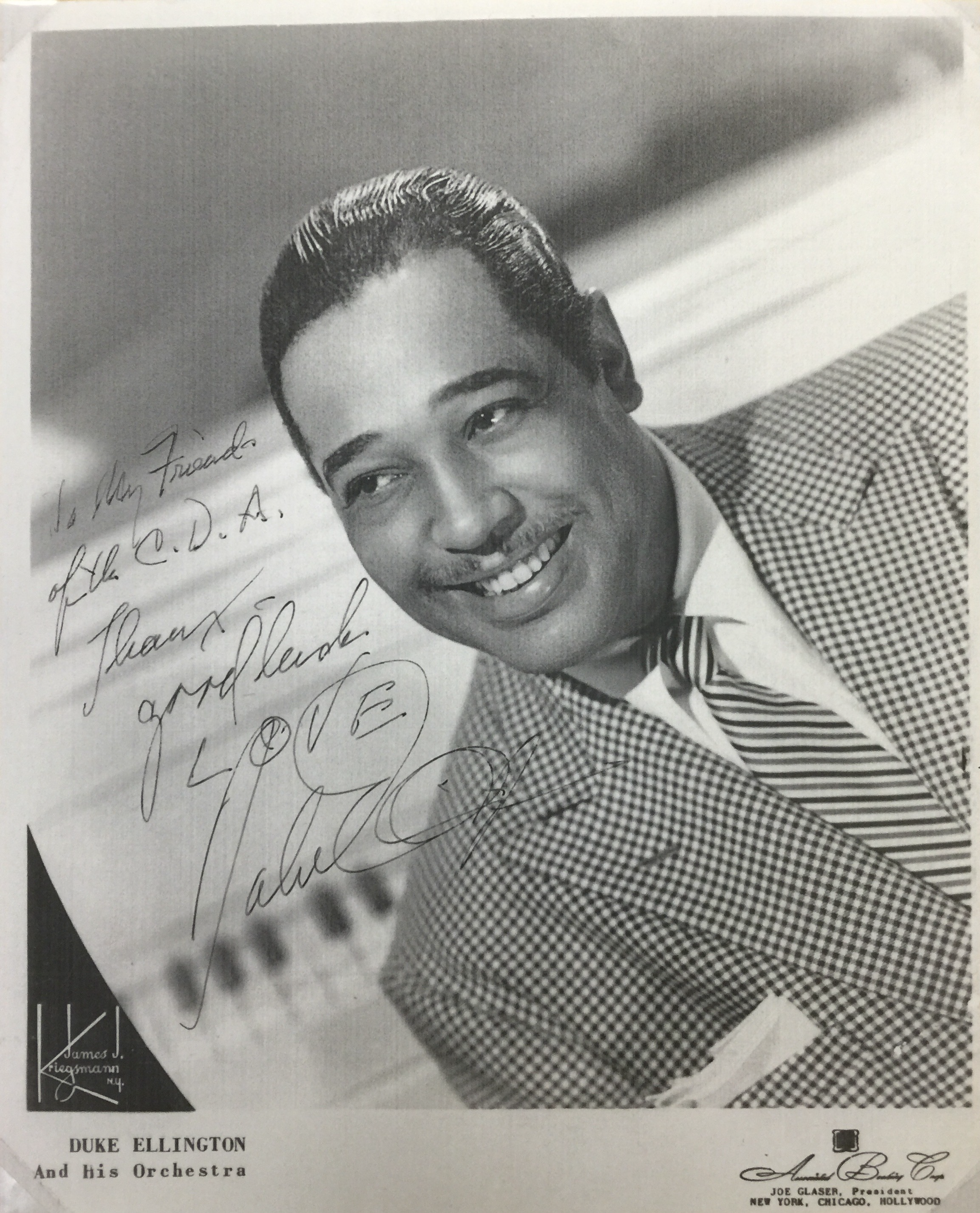 Photograph: Duke Ellington autographed this photo for the Clemson Dance Association (Source: George Bennett Papers, Clemson University Libraries' Special Collections & Archives, ca. 1955. Photograph is in the public domain.).
