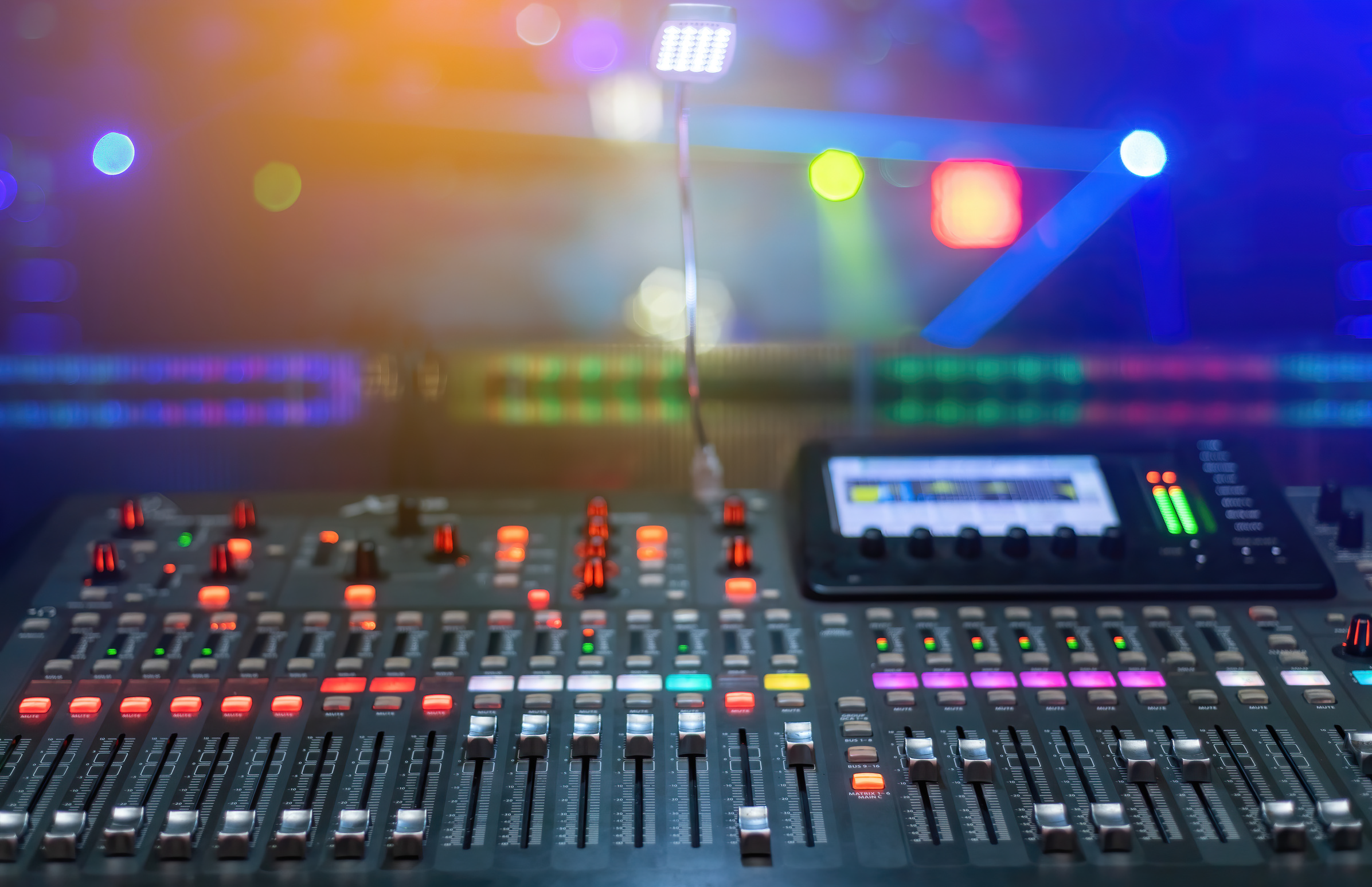 Created with images by paffy - "Studio condenser microphone with professional headphones acoustic panel" • smolaw11 - "Media Television film Production and interview reporter concept: Video recorder movie recording films shooting of grand opening in conference hall live event streaming for presentation by videographer" • Somboon - "A sound mixing plan for mixing music with lots of buttons and a lighted screen and a nightclub stage background" • Gorodenkoff - "University Library: Portrait of Gifted Beautiful Black Girl Stands Between Rows of Bookshelves and Searching for the Right Book Title, Finds and Picks one for Class Assignment" • .shock - "theatre"