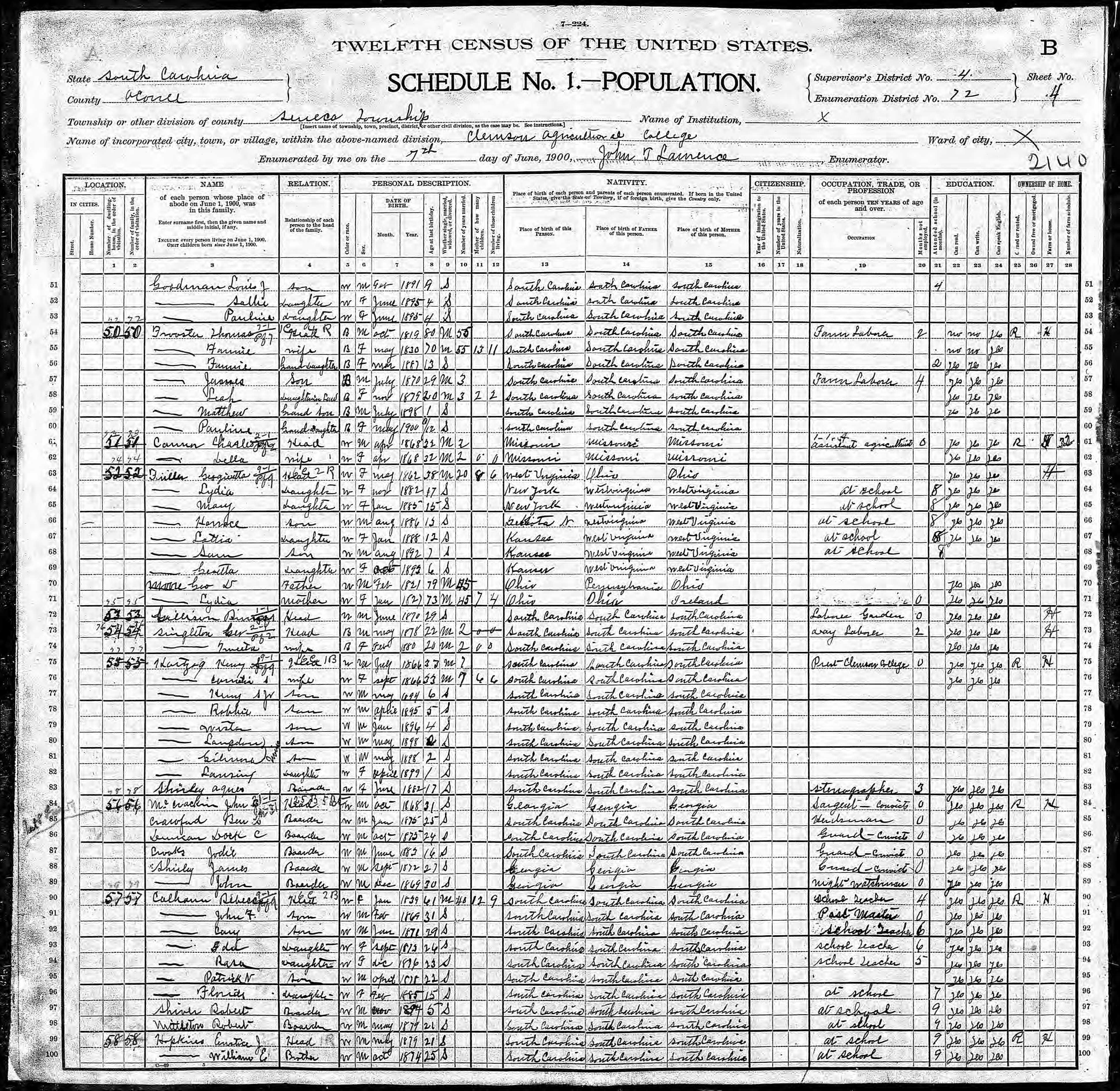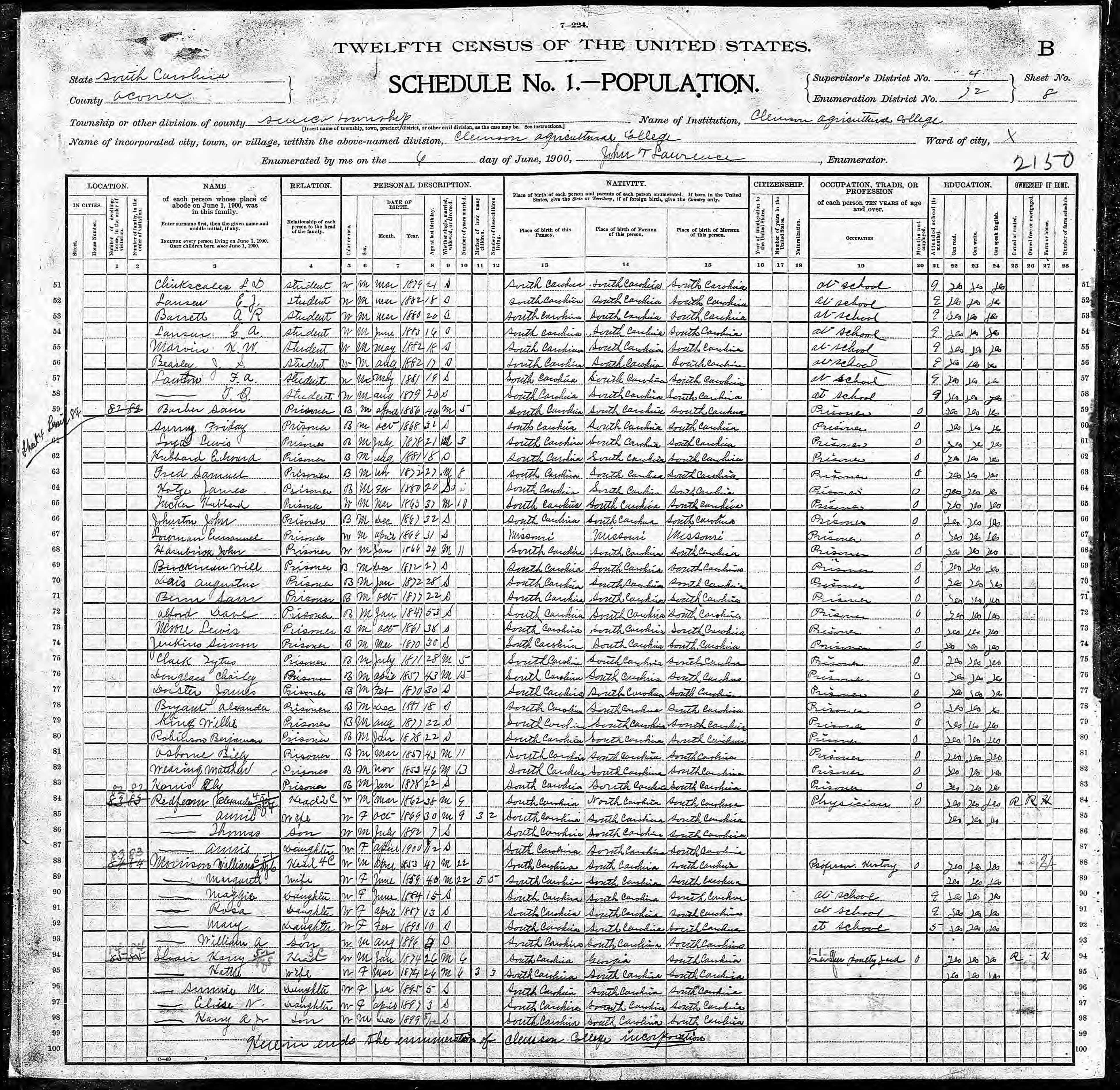 In the 1900 US Census for Clemson College, the names of 25 prisoners who had been leased by trustees to build the institution are included. (Click image to enlarge)