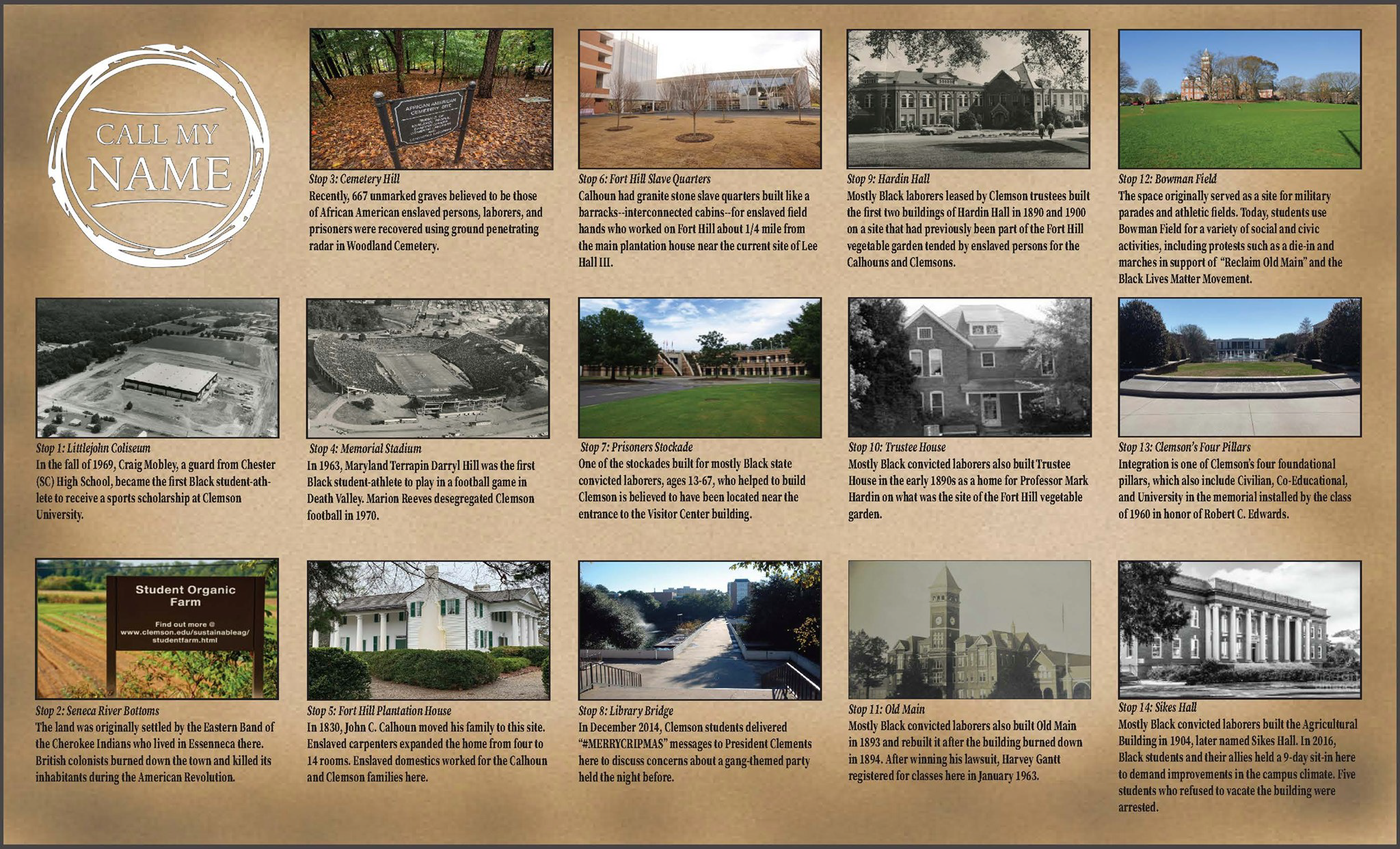 Below please find copies of the first edition of the CMN walking tour of the Clemson University campus. Please email us at www.callmynamecu@clemson.edu to request a hard or electronic copy of the map.