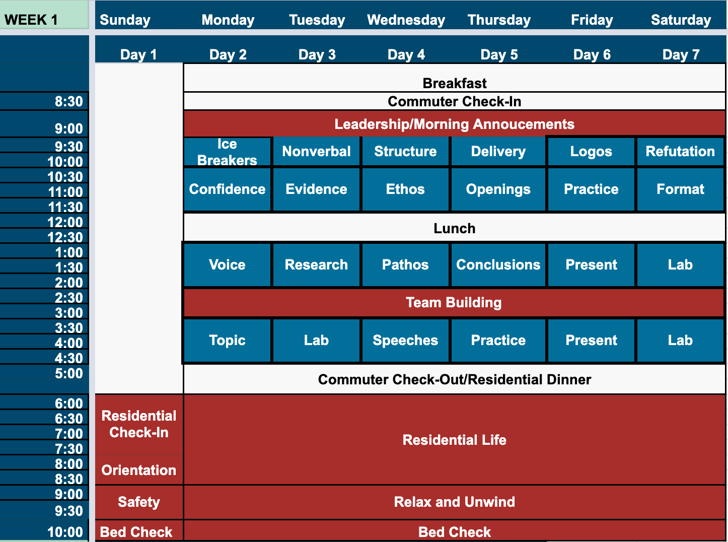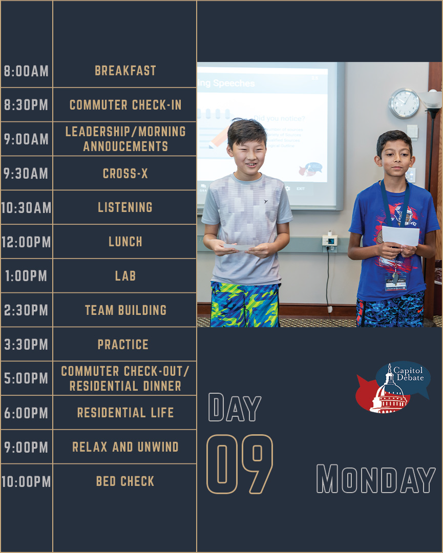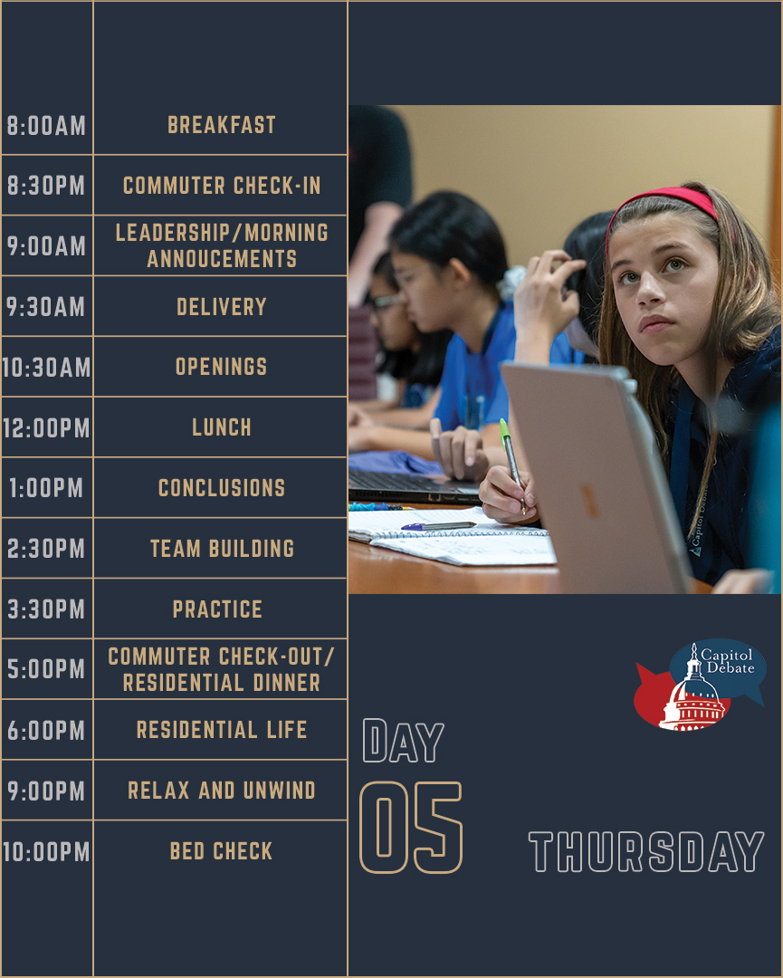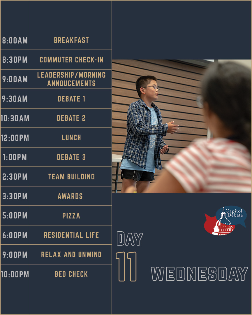 Get ready for an exciting week filled with learning, leadership, and fun at Capitol Debate summer camps! During the first week, students will follow a typical daily schedule that includes breakfast at 8am for residential students, 8:30am check-in for commuters, followed by morning announcements and leadership exercises at 9am. They'll dive into public speaking and debate lessons in the morning, learning new skills and putting them into practice.