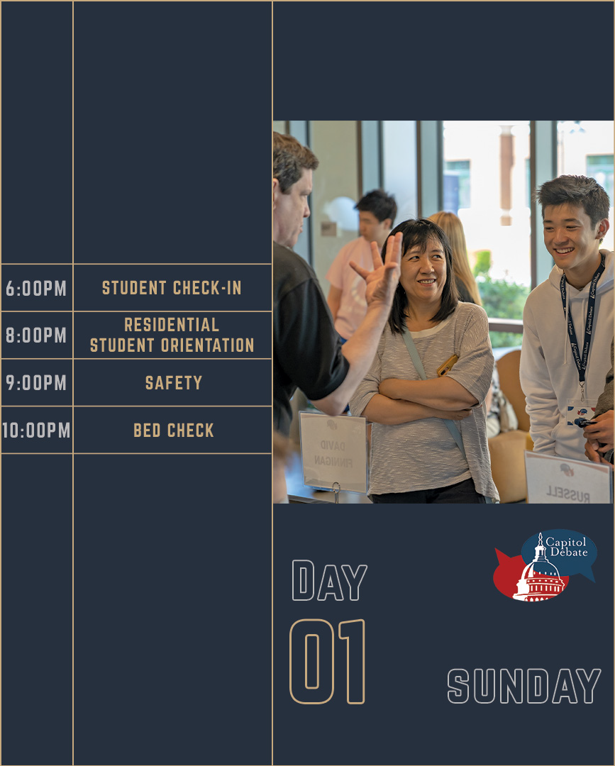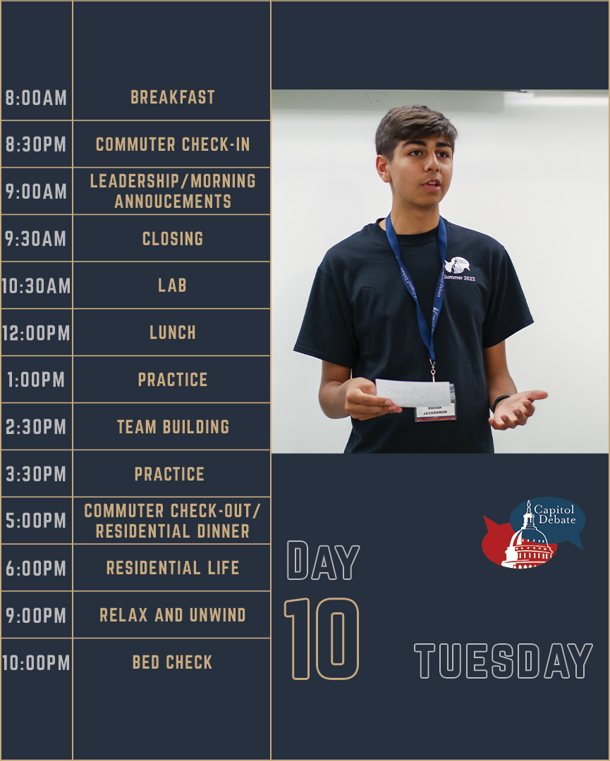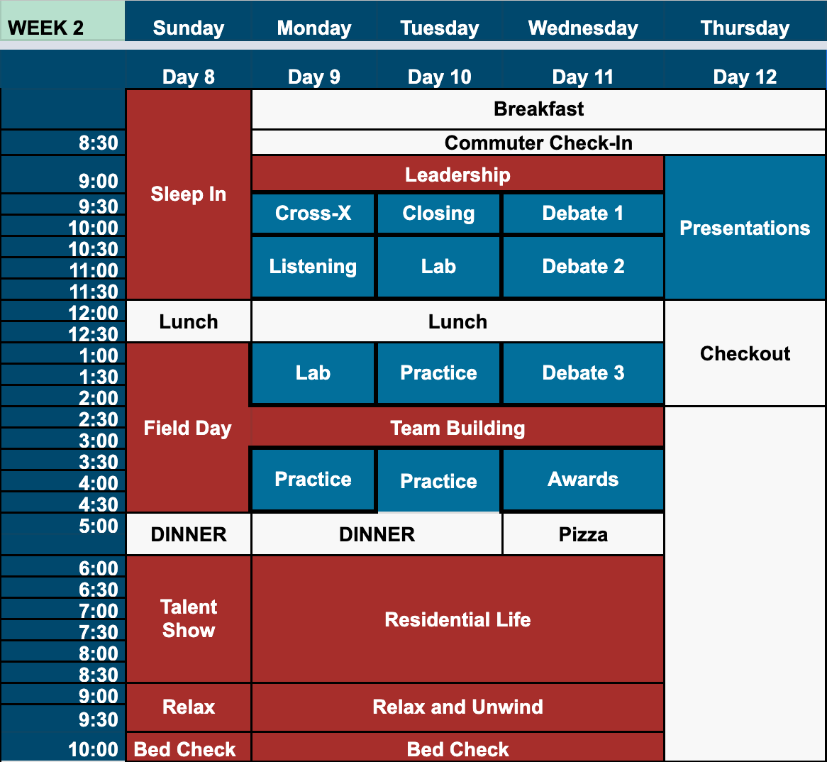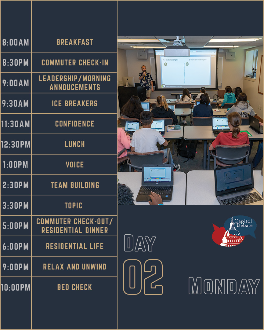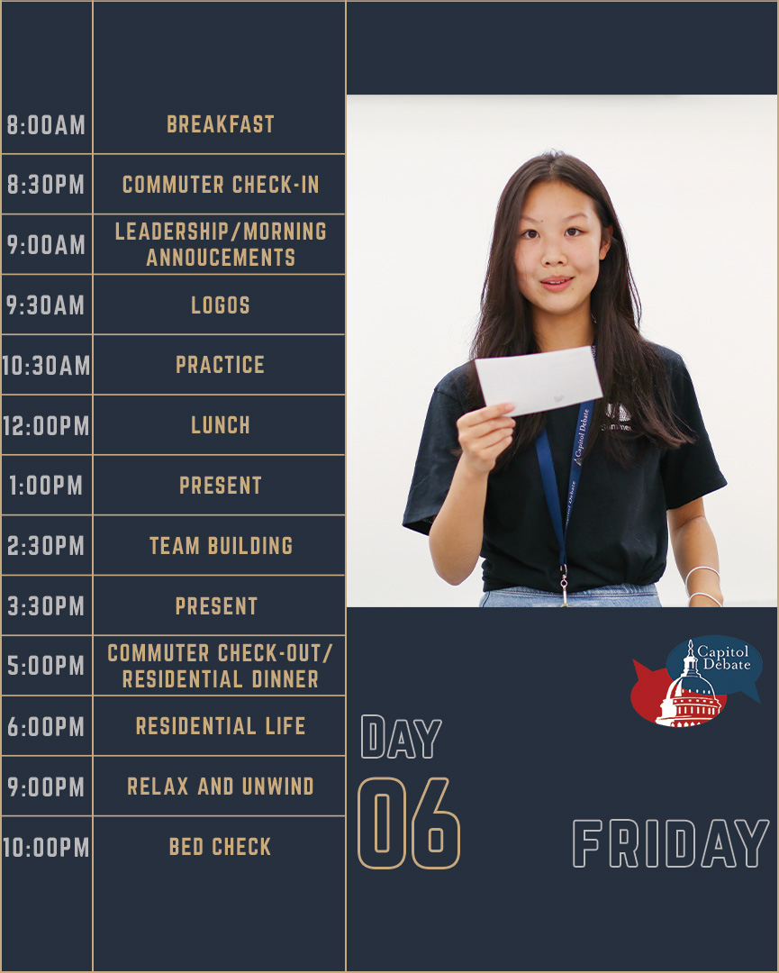 Get ready for an exciting week filled with learning, leadership, and fun at Capitol Debate summer camps! During the first week, students will follow a typical daily schedule that includes breakfast at 8am for residential students, 8:30am check-in for commuters, followed by morning announcements and leadership exercises at 9am. They'll dive into public speaking and debate lessons in the morning, learning new skills and putting them into practice.