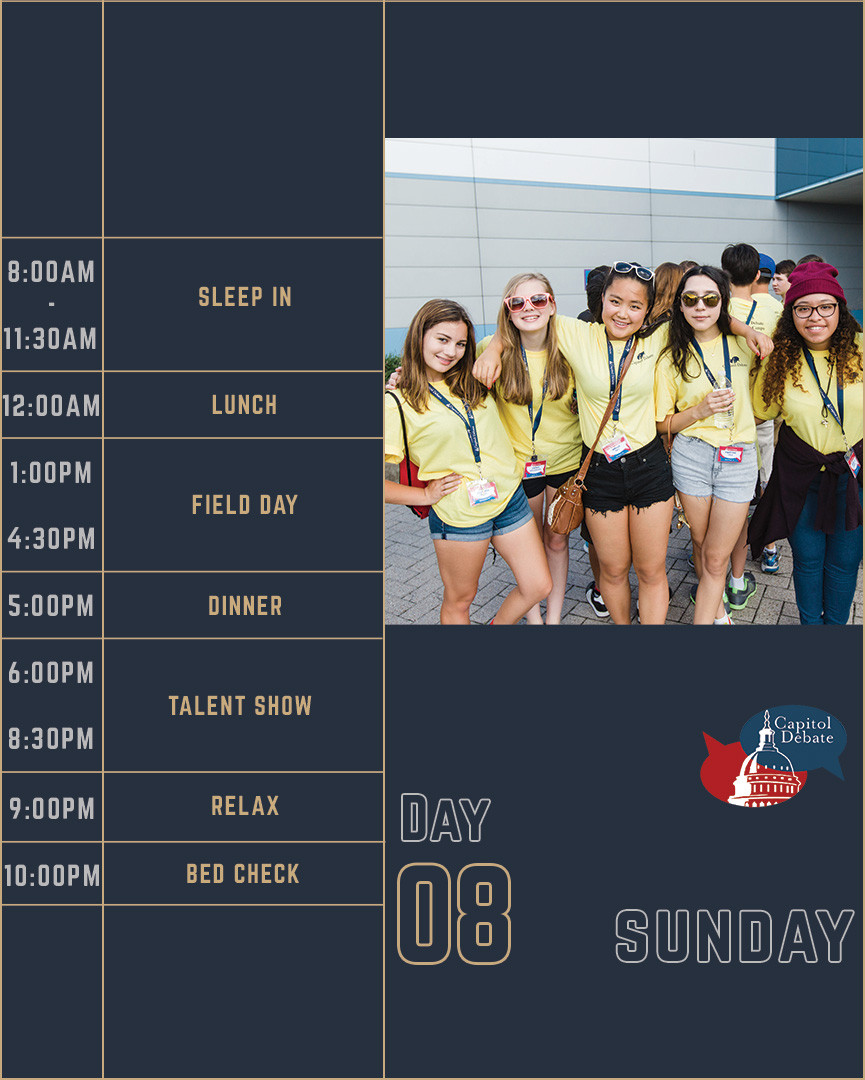 Welcome to Sunday, the day of rest for our hardworking Capitol Debate Summer Camp students! After a full week of learning, practicing, and honing their public speaking and debate skills, our students have earned a well-deserved break. Residential students get to enjoy the luxury of sleeping in until noon, while our commuter students have the day off.