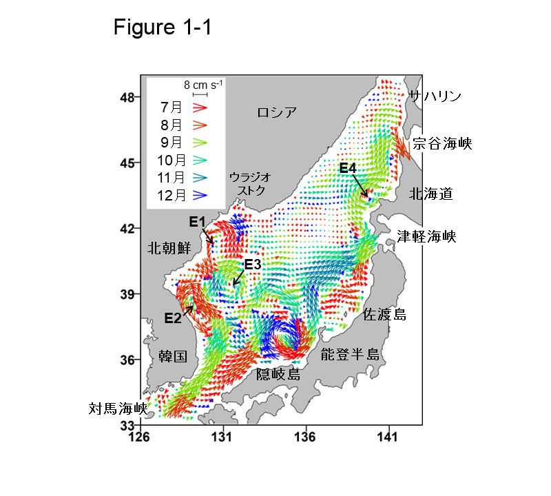 一つ目は対馬海峡の南部から日本列島に沿った北東向きの赤色矢印ベクトル(7〜8月の夏季に強化)であり、対馬暖流の「沿岸分枝流」と呼ばれています。二つ目は対馬海峡の北部から韓国沖を北上、その後、南北に2〜3回程度大きく蛇行しながら東流する黄緑→水色→濃青色の矢印ベクトル(9〜12月の秋〜冬季にかけて強化)です。この海流は対馬暖流の「沖合分枝流」と呼ぶ研究者が多いのですが、我々は特徴的な流れパターンから「沖合蛇行流」と呼んでいます。三つ目は北朝鮮沖にある閉じた2個の渦流、E1とE2の赤矢印ベクトルであり、その存在はこれまで指摘されたことがありませんでした。そのため、北朝鮮沖の流動場を支配する重要な渦流なのですが、海流名はまだ付いていません。なお、E1とE2の渦流の強化は夏季(赤矢印の7〜8月)ではなく、後述するように、逆回転の渦流偏差となる冬季(1〜2月)にあります。