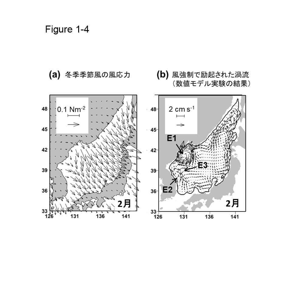 本章の最後は、海流名がまだなく、北朝鮮沖にある三つ目の海流(または渦流)について、です。図1-4の(a)は冬季2月の日本海海上で卓越する季節風ベクトル、(b)はその風応力により駆動される流動場の数値モデル実験の結果です(朝日・磯田 (2016)のFig. 10a,bを改変)。アジア大陸から日本海へ噴き出す冬季季節風の水平シアー(大気から海への渦度供給)は、北朝鮮沖が日本海の中で最も強いことがわかります(図1-4a)。数値実験では、その供給された渦度によって、北朝鮮沖の局所的な二か所(E1とE2)に時計回りの渦流の発生を予測しました(図1-4b)。両渦流の場所と形状は、(季節表記が異なるために)回転方向が全く逆(反時計回りの渦流偏差)ですが、図1-1のE1とE2に非常によく似ています。この実験結果をもとにすれば、E1とE2の渦流形状をもつ海流は、季節風が連吹する冬季にのみ卓越すること、沖合蛇行流の一部(E3付近)に影響を与えることが示唆されました。我々は両渦流の存在を信じていますが、将来、関係各国の海洋研究者と共に海洋観測を行い、その存在を証明できる日を夢見ています(最近では、この渦流が日本海の深層流を駆動している可能性も示唆されており、その意味でも非常に重要な現象と考えています)。