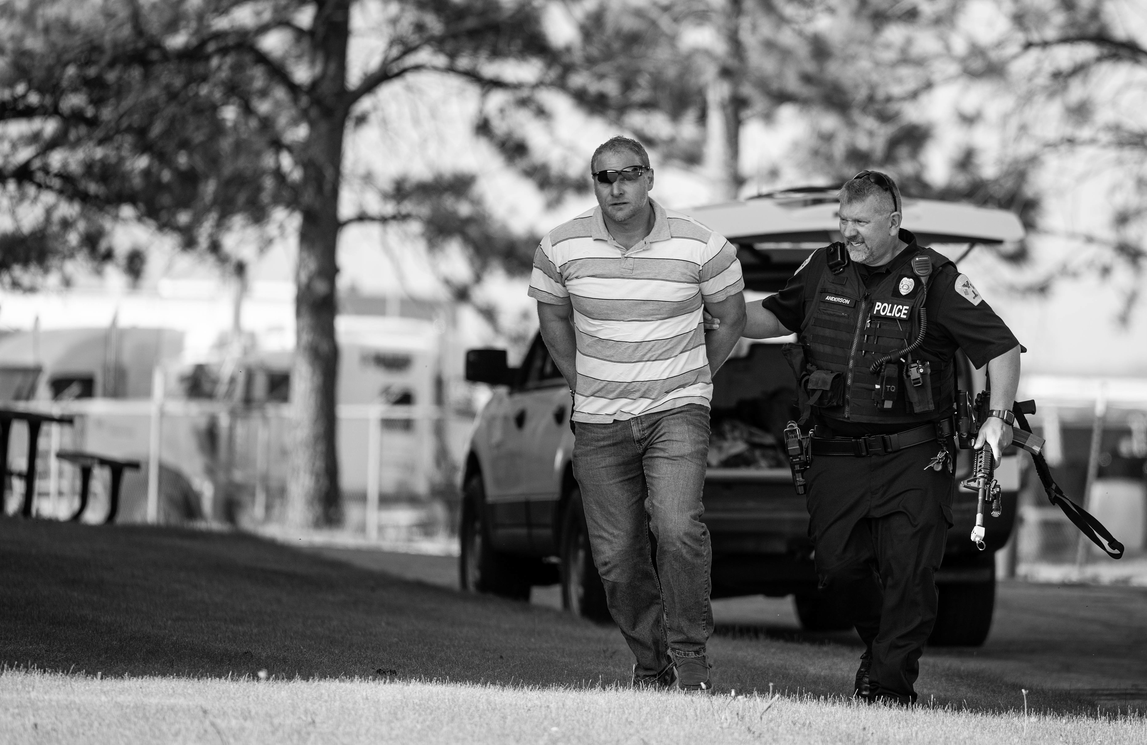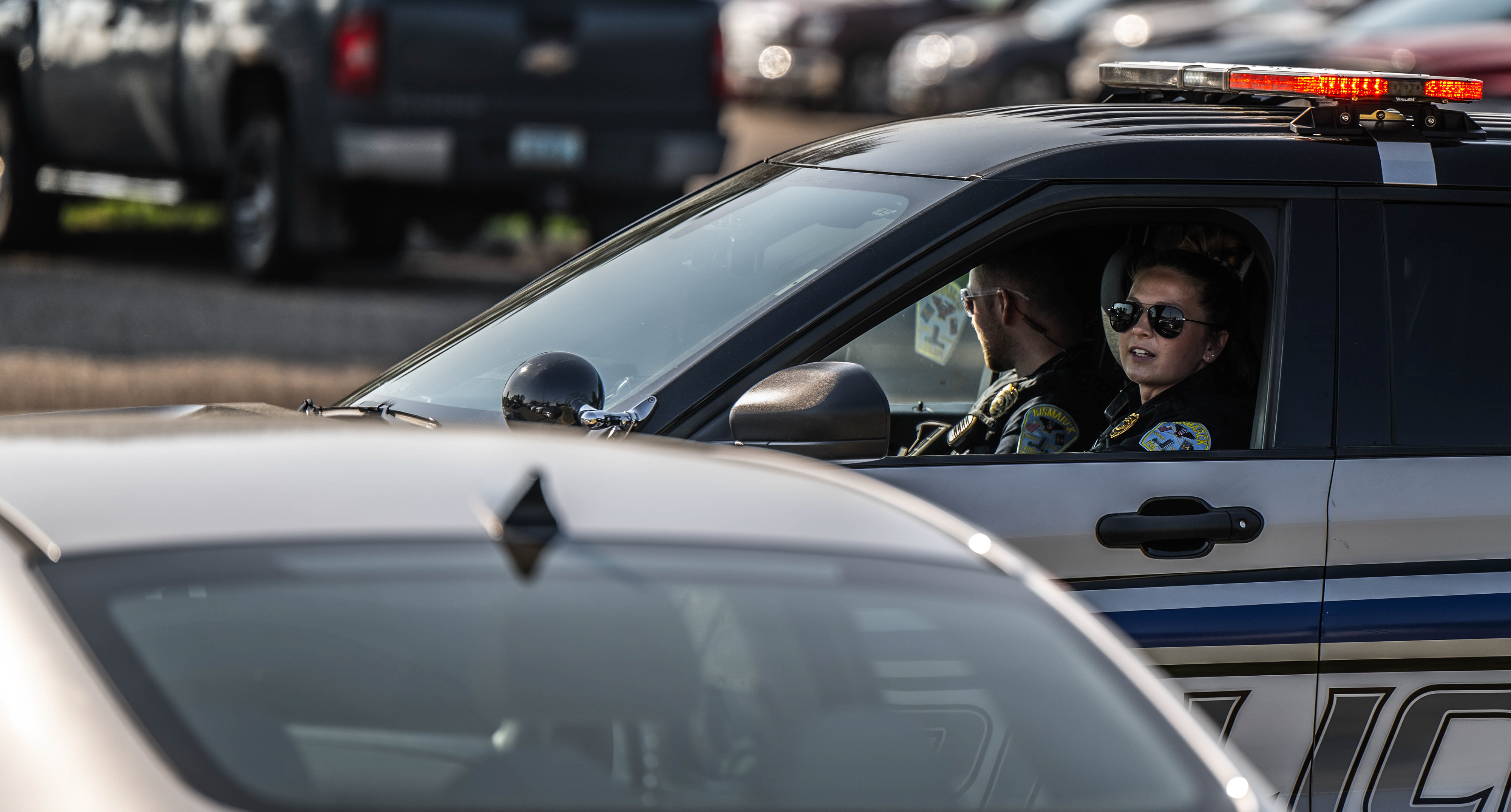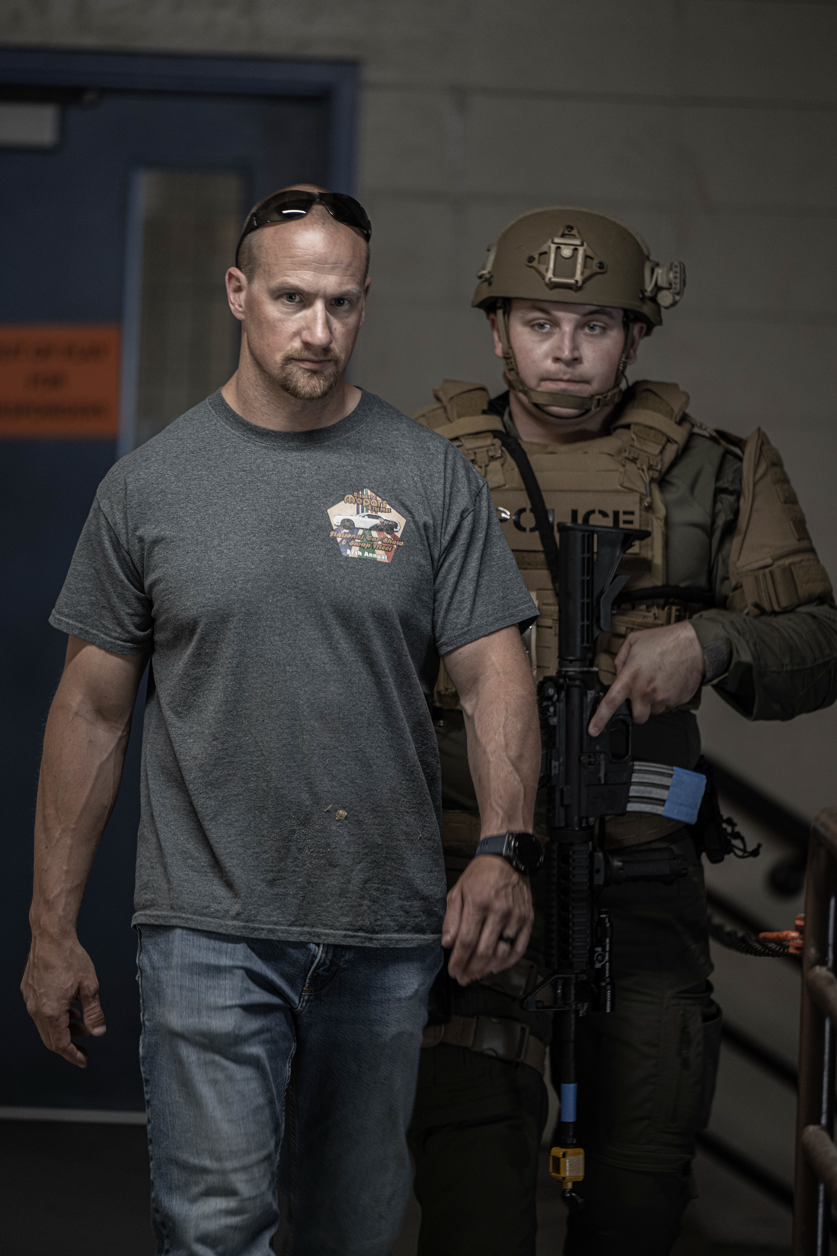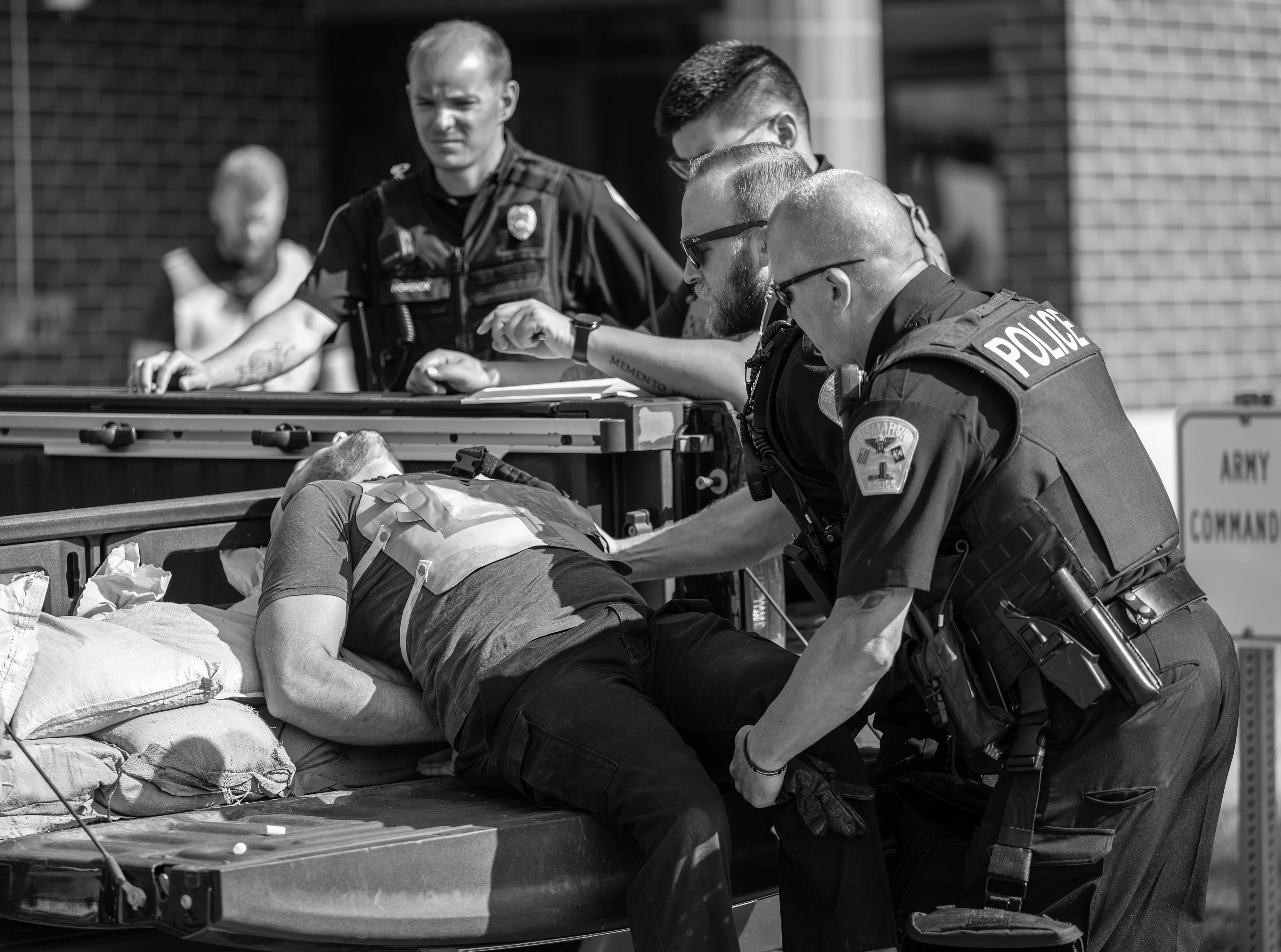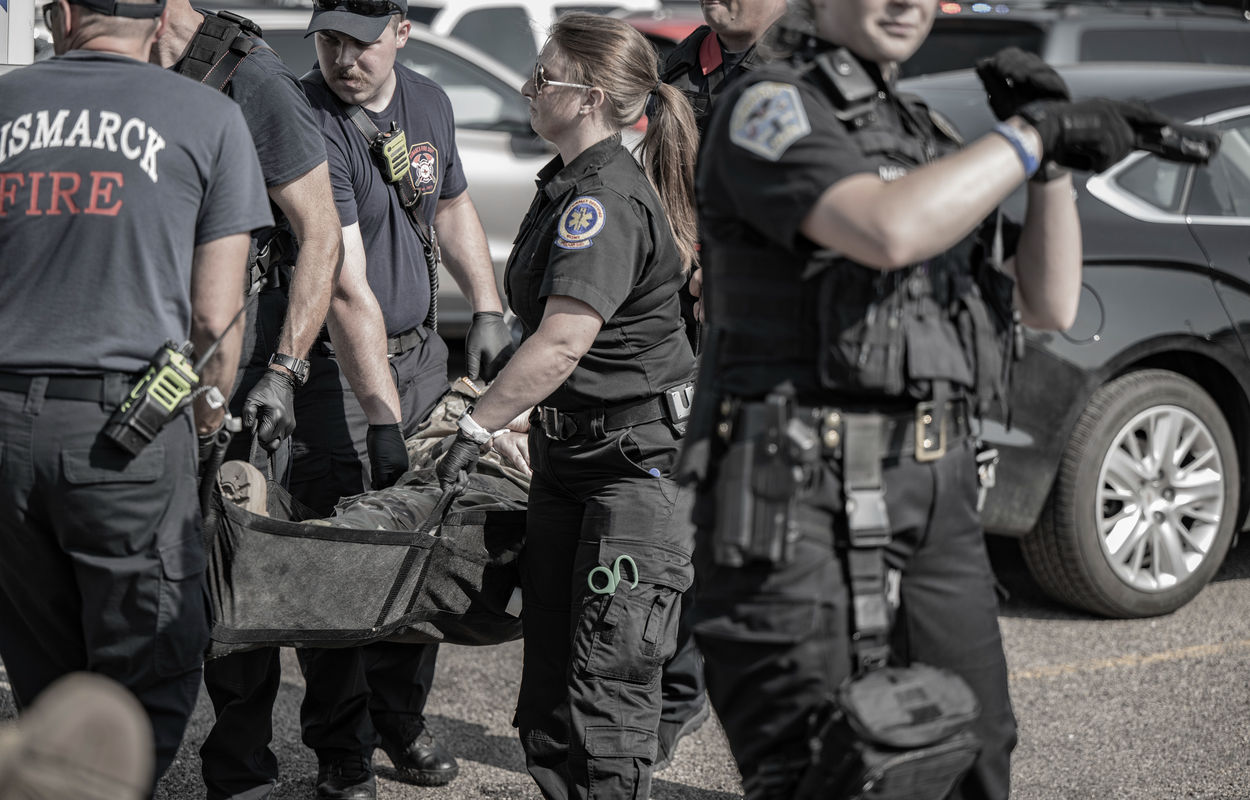 Bismarck police officers assess injuries on a acting victim during a active shooter exercise at the Raymond J. Bohn Armory, Bismarck, N.D., June 8, 2023.