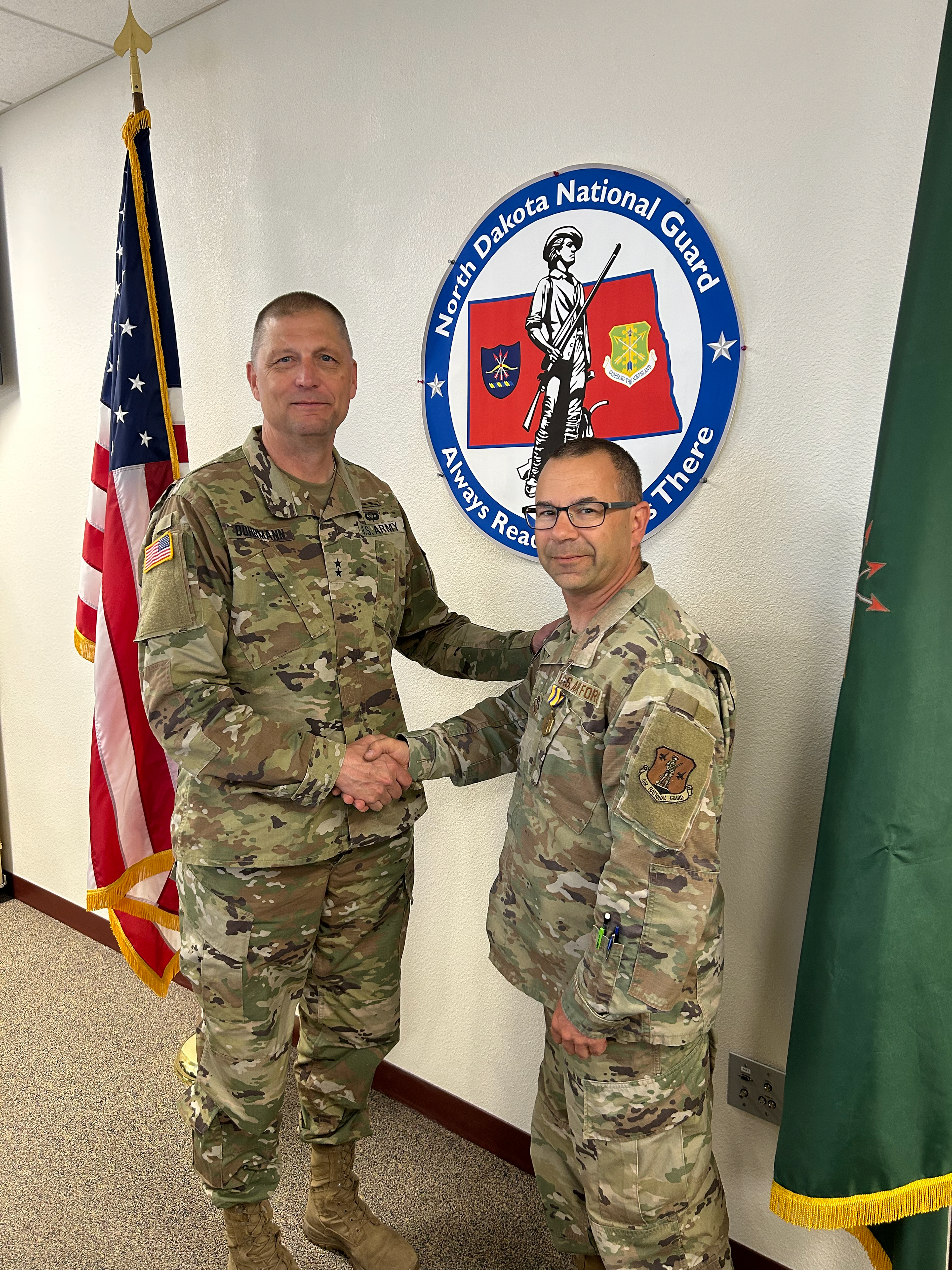 Maj. Gen. Al Dohrmann, N.D. National Guard adjutant general, left, presents Master Sgt. Dale Fanchuk, Joint Force Headquarters, The Air and Space Commendation Medal for outstanding achievement at the Raymond J. Bohn armory, Bismarck, N.D., June 11, 2023.