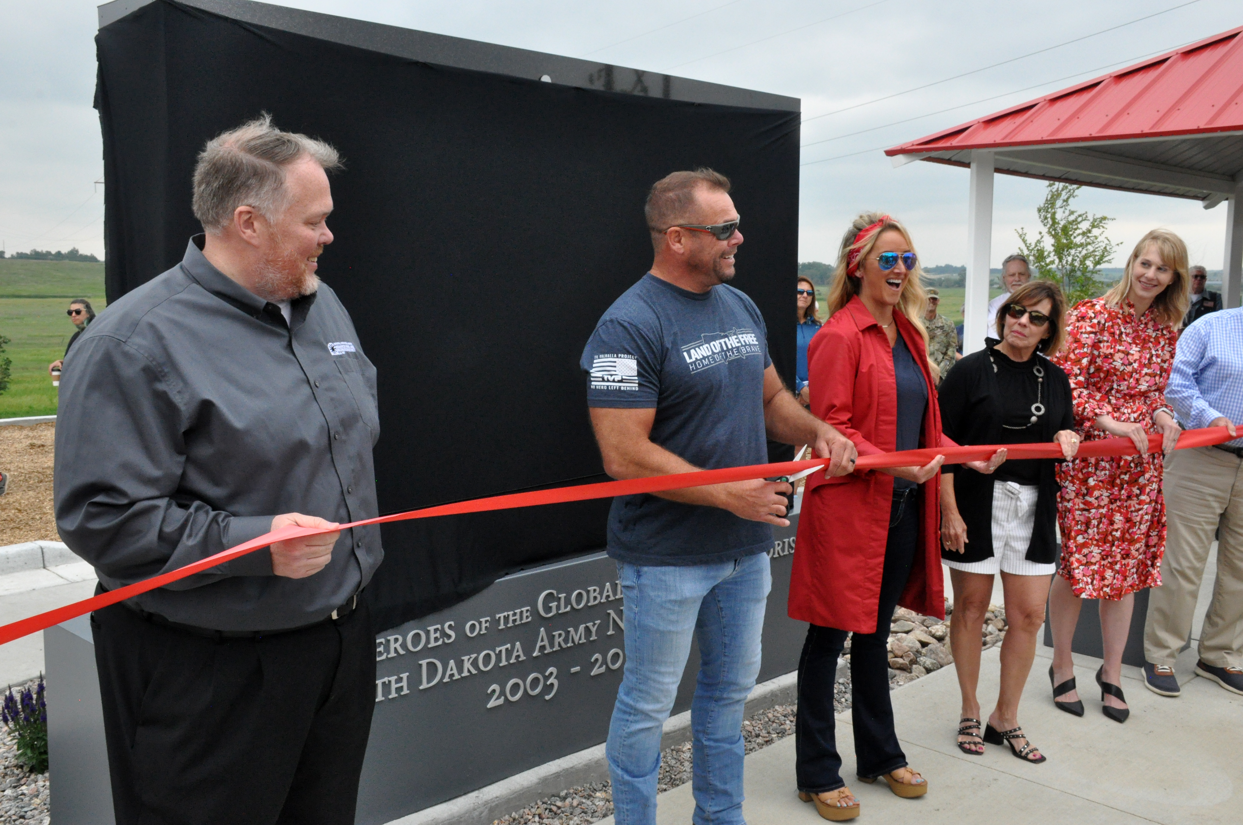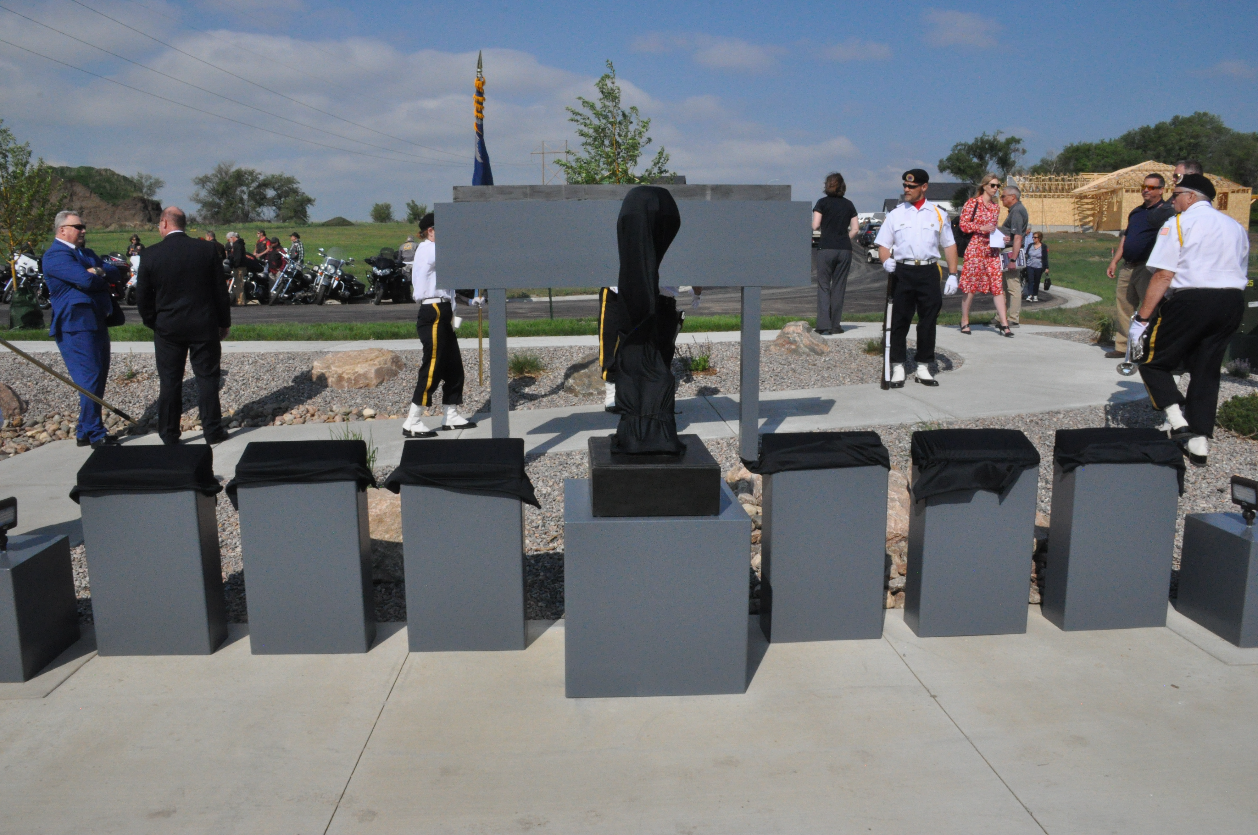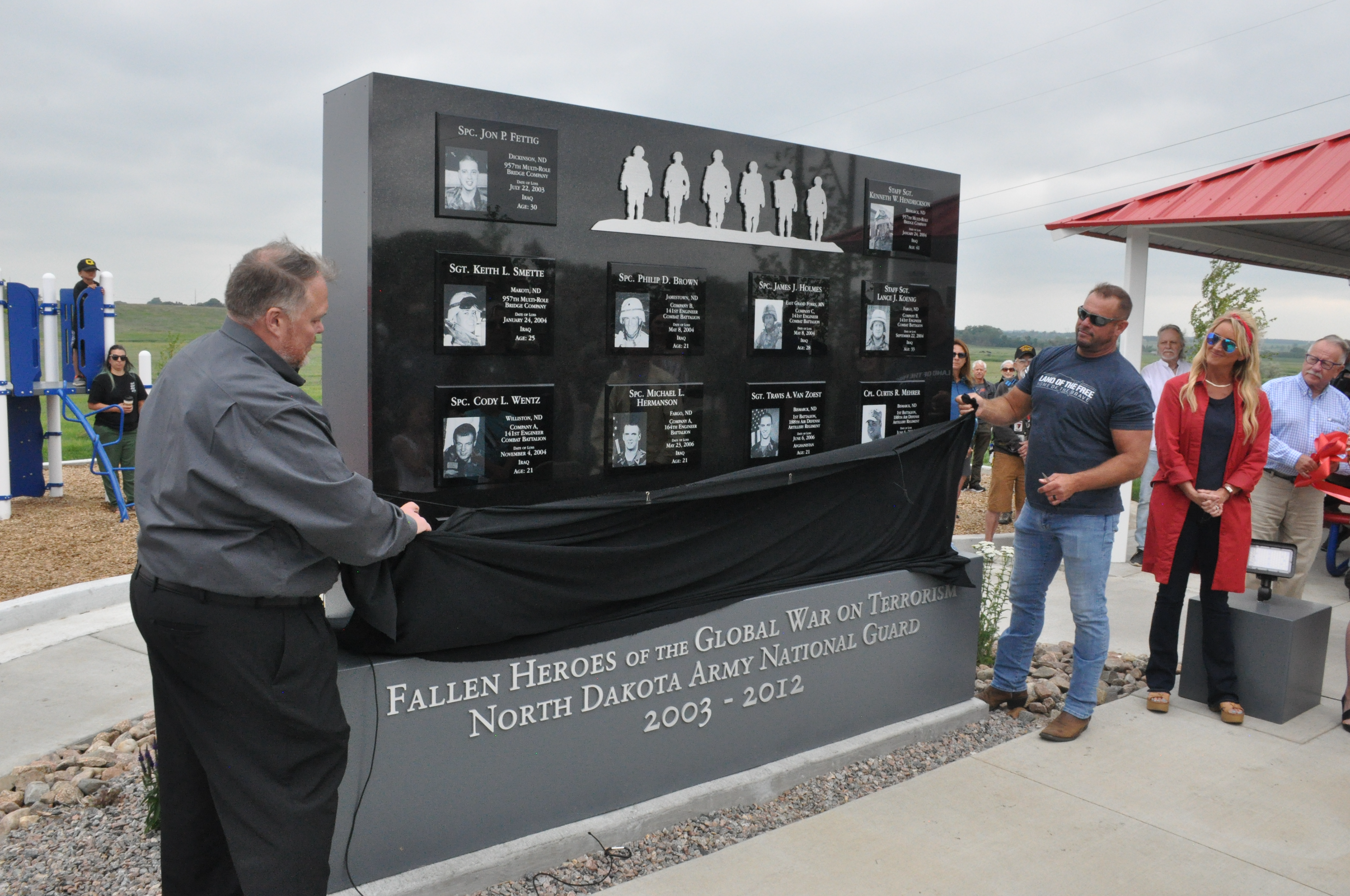 The park dedication ceremony featured the unveiling of a monument wall to the fourteen N.D. National Guard Soldiers killed in action during the Global War on Terrorism (GWOT). Also included during the ceremony was an unveiling of a Battlefield Cross (also called a Fallen Soldier Battlefield Cross) and plaques honoring six Bismarck-area fallen heroes. Of these six, four are N.D. National Guardsmen. These items were donated by the North Dakota Heroes Foundation with support by the North Dakota Patriot Guard. This was the seventh Battlefield Cross and sixteenth memorial plaque donated state-wide in an effort to honor all North Dakota Servicemembers lost during GWOT.