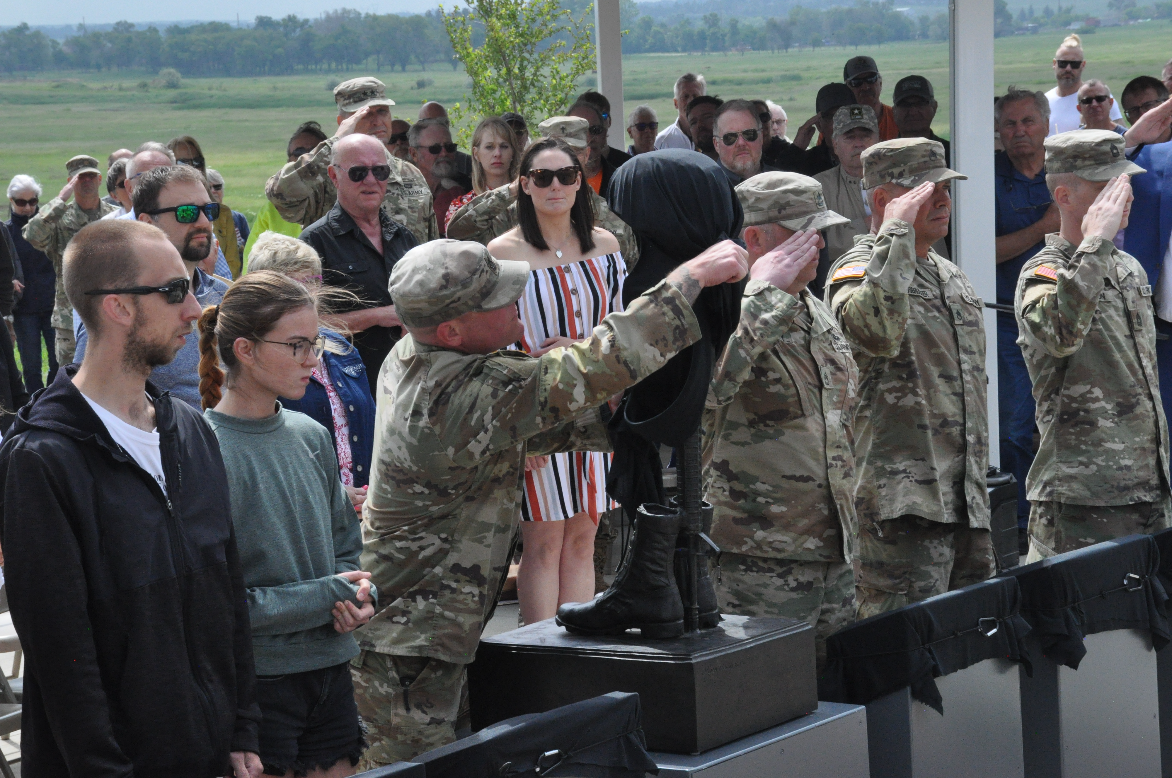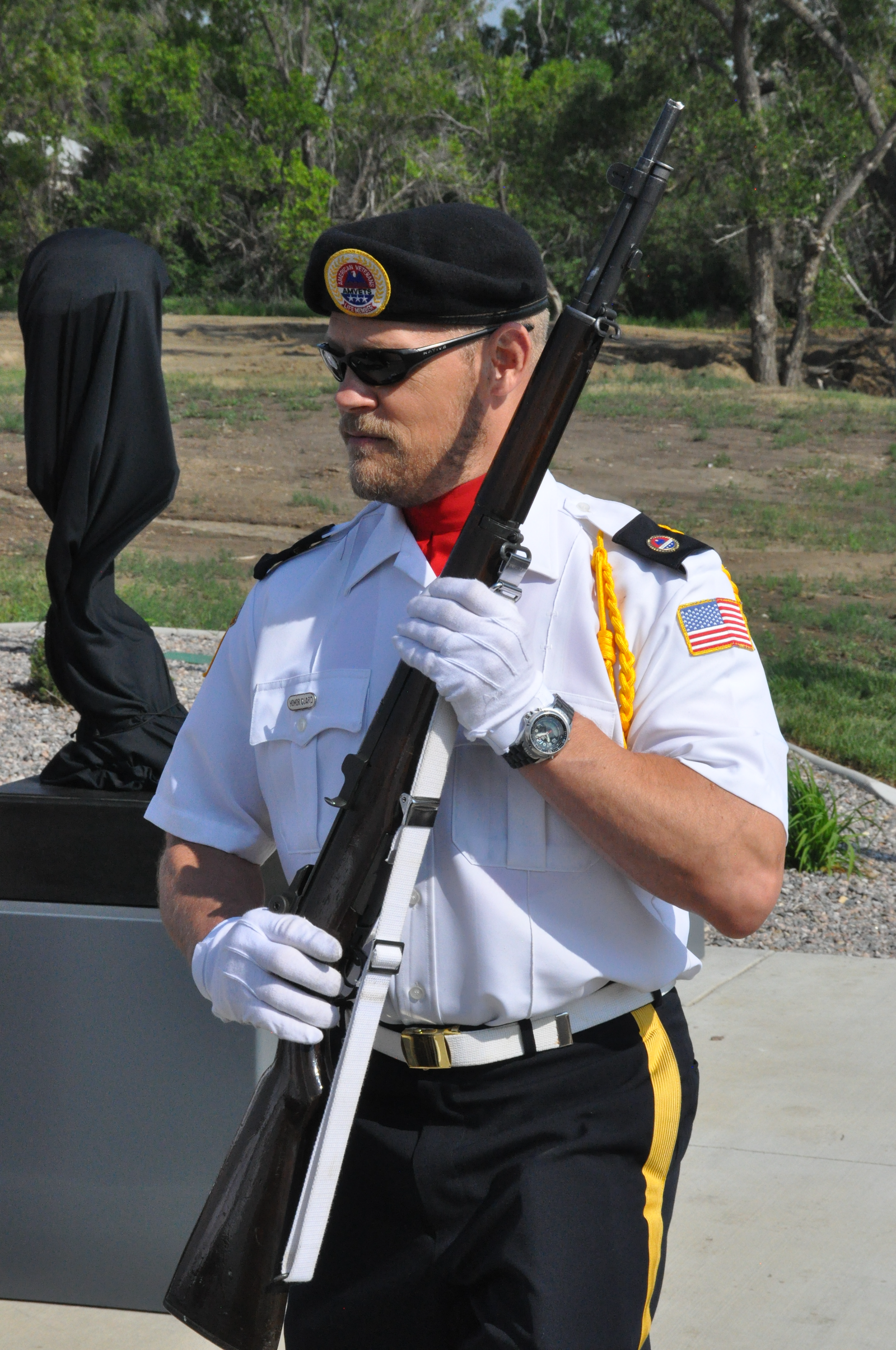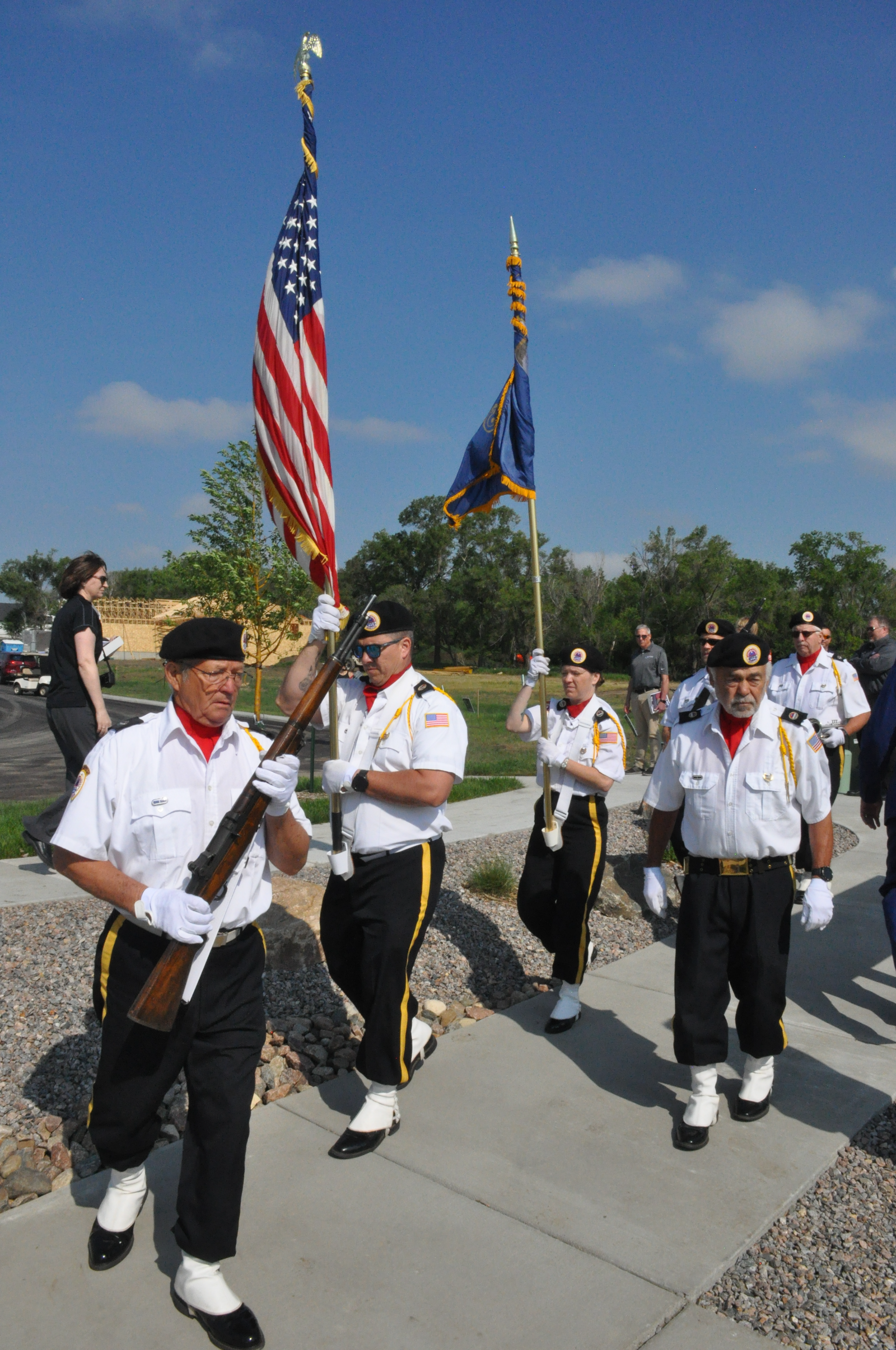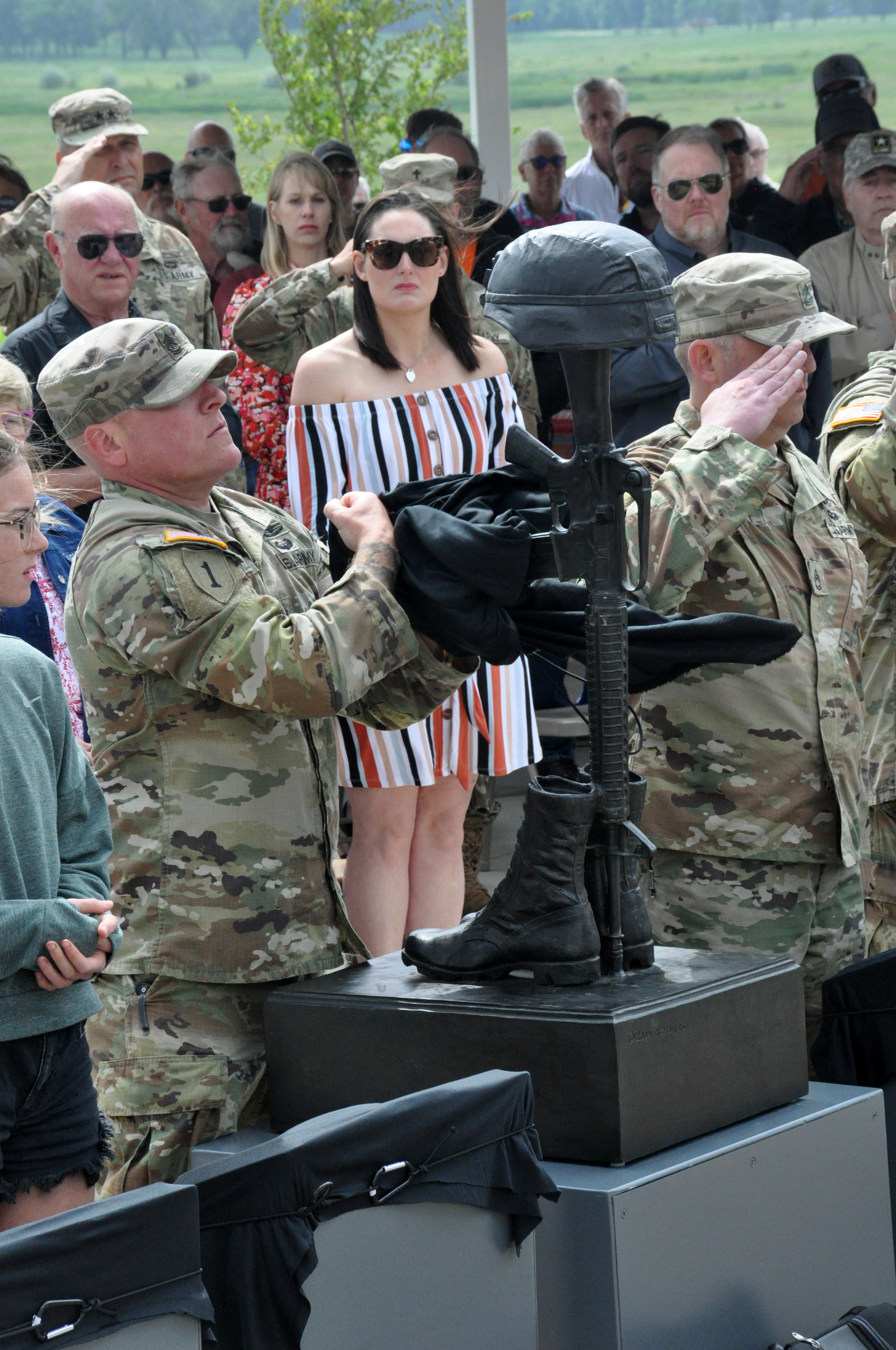 The park dedication ceremony featured the unveiling of a monument wall to the fourteen N.D. National Guard Soldiers killed in action during the Global War on Terrorism (GWOT). Also included during the ceremony was an unveiling of a Battlefield Cross (also called a Fallen Soldier Battlefield Cross) and plaques honoring six Bismarck-area fallen heroes. Of these six, four are N.D. National Guardsmen. These items were donated by the North Dakota Heroes Foundation with support by the North Dakota Patriot Guard. This was the seventh Battlefield Cross and sixteenth memorial plaque donated state-wide in an effort to honor all North Dakota Servicemembers lost during GWOT.
