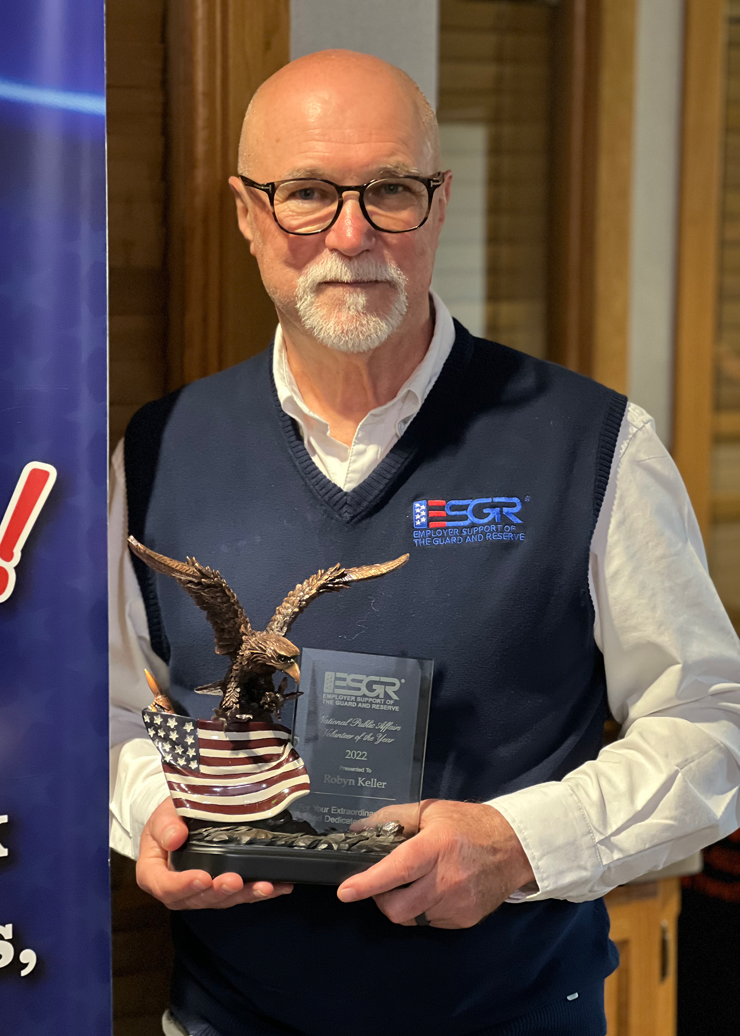 “Mr. Rob Keller is the definition of ‘Outstanding Volunteer.’ It was easy for me to nominate Rob for this honor. Besides leading our ESGR Public Affairs efforts for North Dakota, he also is Co-Chair of our Bismarck-Mandan Region for ESGR. His efforts in reinventing our social media platforms, consistently posting the North Dakota ESGR Committee activities, as well as being an expert resource in everything related to public affairs, he still finds time to be an excellent presenter, trainer, and a ‘go-to’ person on anything ESGR related. His energy and passion for the mission of ESGR shows in all his efforts,” said Delton D. Steele, the state chair of the North Dakota ESGR.