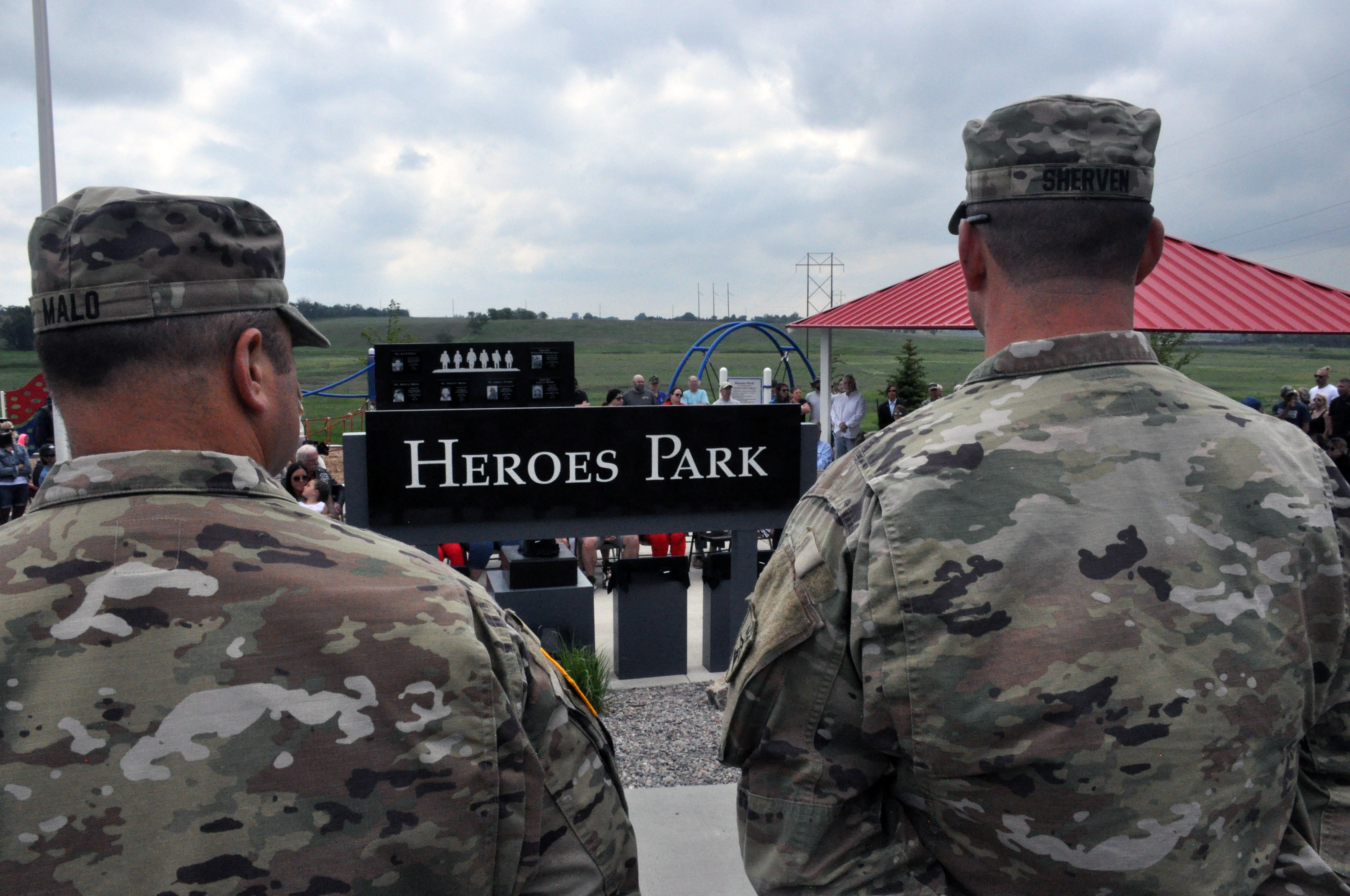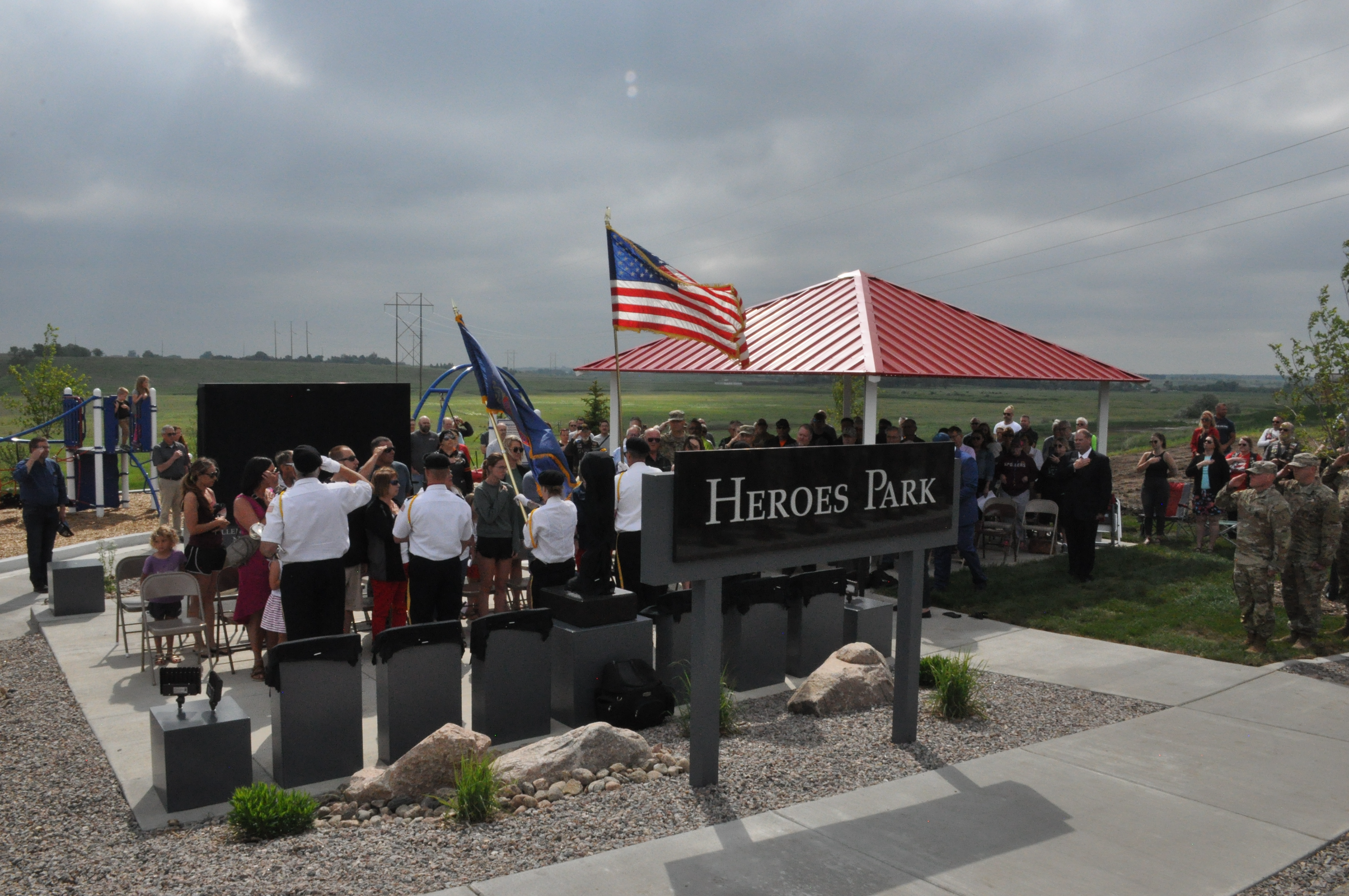 Matt and Kelly Geiger donated the land for the 3.89-acre park to the Bismarck Parks and Recreation District. A ceremony on Aug. 28, 2020, dedicated the 14 streets named in honor of the N.D. National Guard Soldiers killed in action during GWOT in the housing area surrounding Heroes Park.