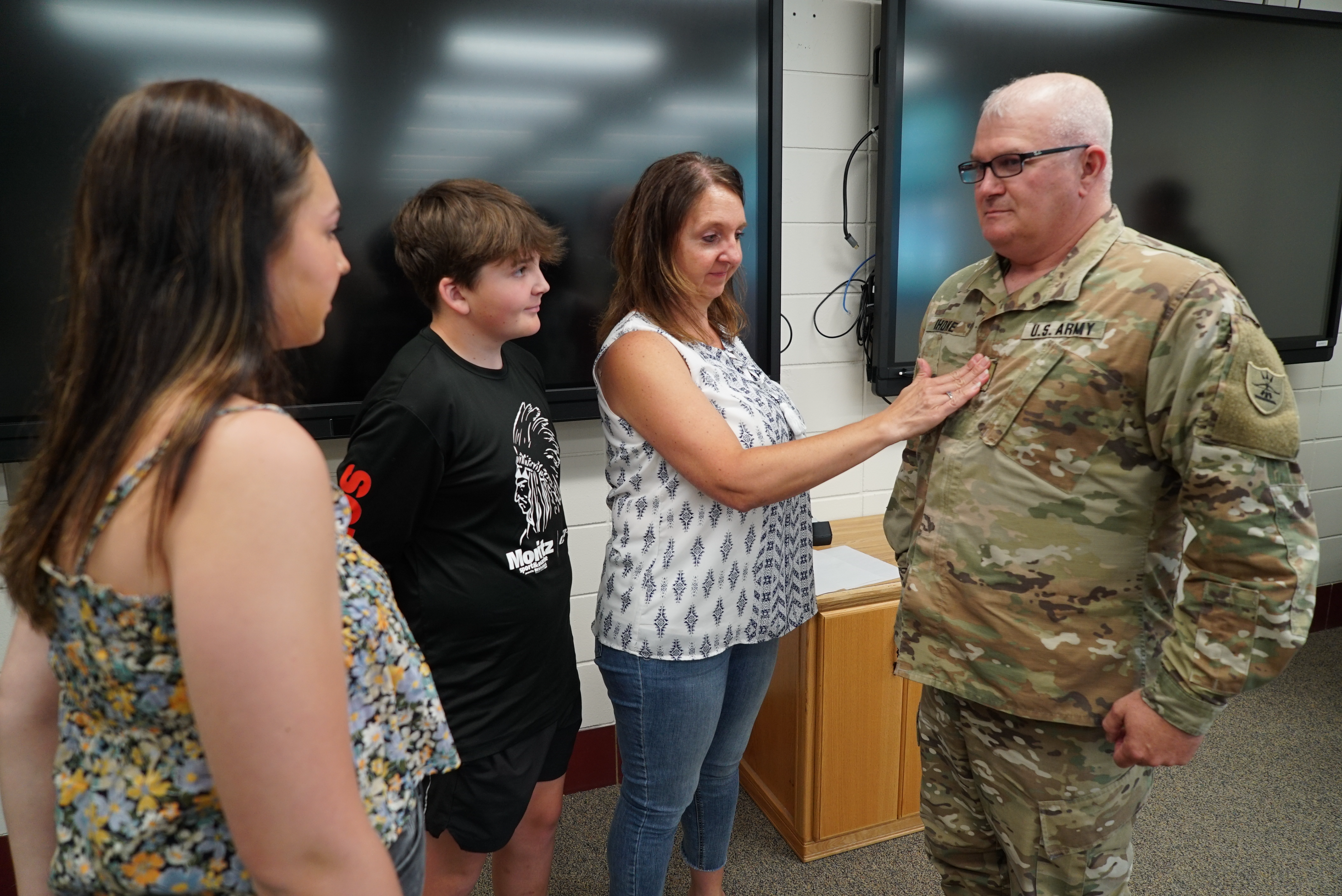 The family of newly promoted Chief Warrant Officer 5 Rick Rhone, Joint Force Headquarters, place his new rank on his uniform during a promotion ceremony at Fraine Barracks, Bismarck, N.D., June 11, 2023.
