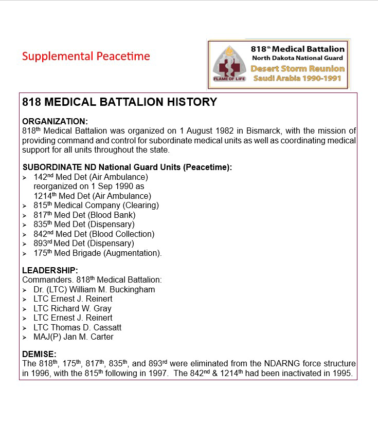 The 818th Medical Battalion was alerted for duty Nov. 12, 1990; placed active federal service on Nov. 17, 1990; moved to mobilization station (Fort Carson, Colorado) the day after Thanksgiving, Nov. 23, 1990; and arrived in Saudi Arabia on Dec. 1, 1990 when Operation Desert Sheild was still in effect.