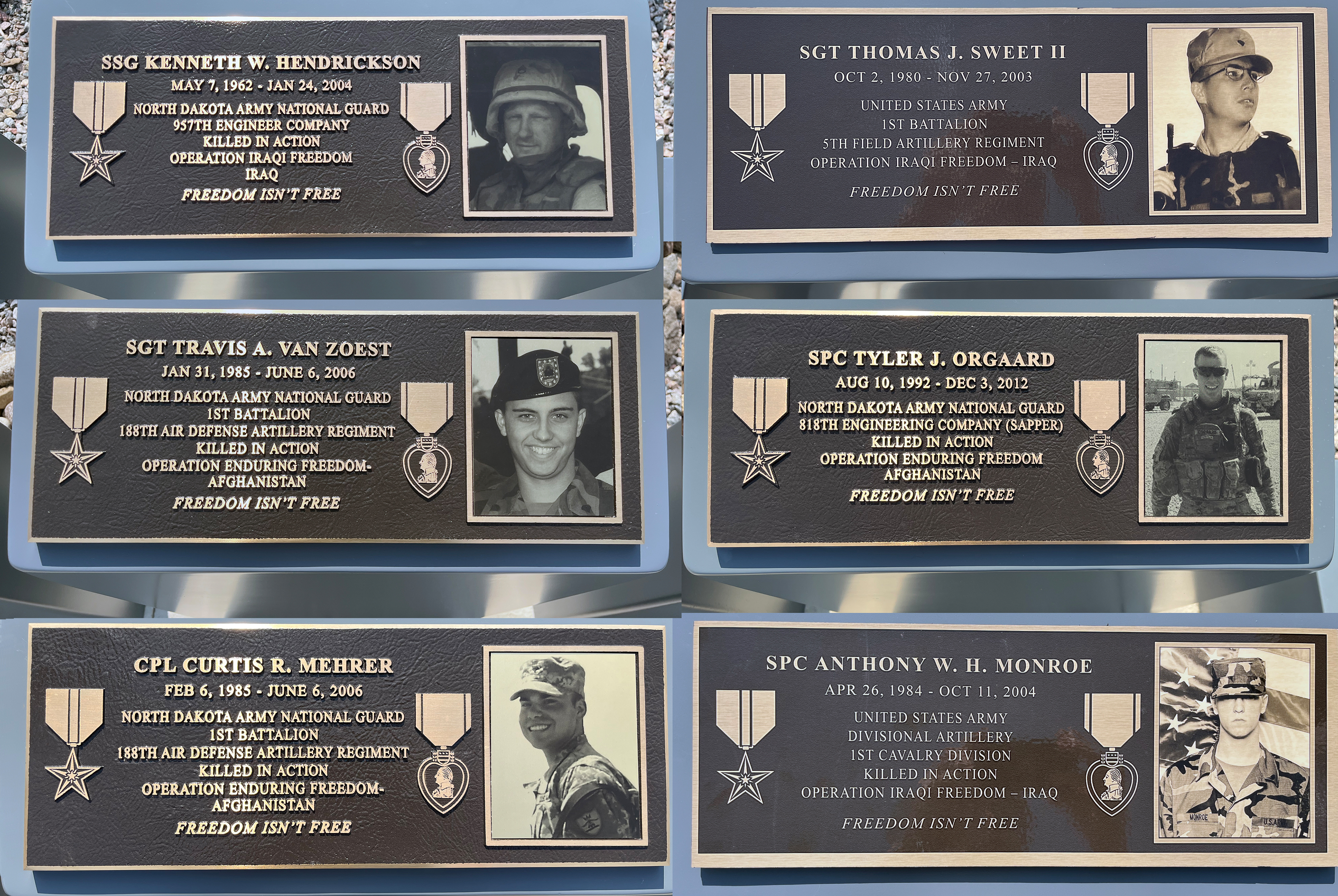 The dedicated plaques honored N.D. National Guard Soldiers Staff Sgt. Kenneth W. Hendrickson; Sgt. Travis A. Van Zoest; Cpl. Curtis R. Mehrer; and Spc. Tyler J. Orgaard. Members of the U.S. Army honored were Sgt. Thomas J. Sweet II and Spc. Anthony W.H. Monroe.