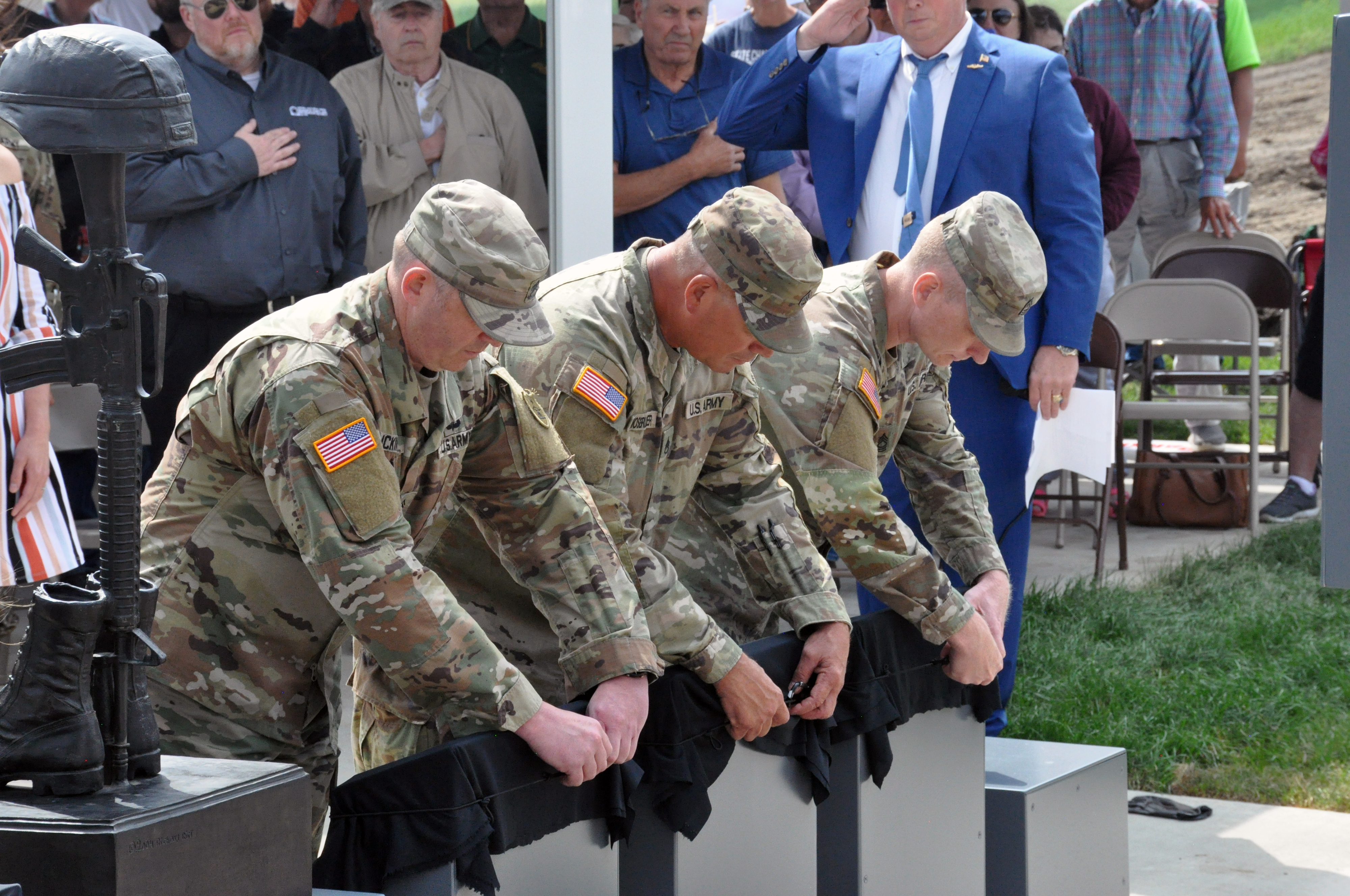 From left, N.D. National Guard members Sgt. 1st Class Matthew McKinney, Staff Sgt. Marty Mosbrucker, and Master Sgt. Levi Jensen unveil three of the six plaques honoring Bismarck area Servicemembers killed in action during the Global War on Terrorism, at the Heroes Park dedication, Bismarck, N.D., June 10, 2023. (Photo courtesy of Bill Prokopyk)