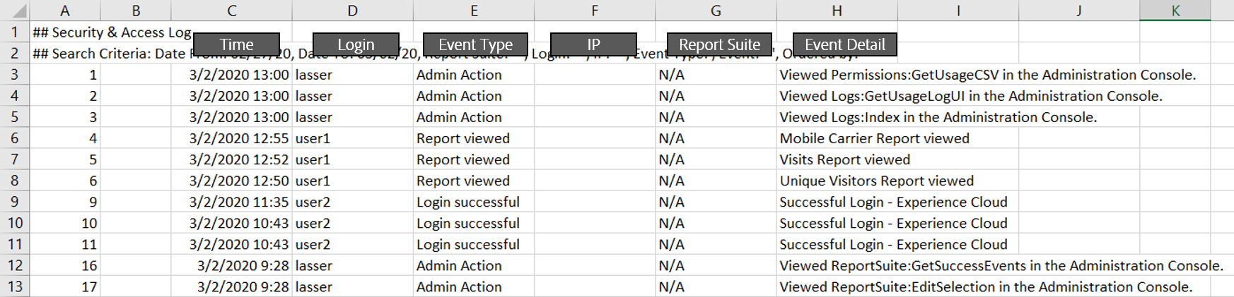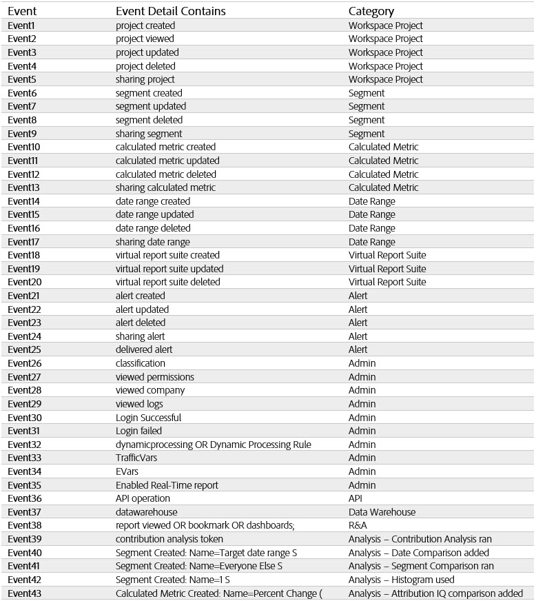 You can create a variety of events from the logs. To do this, you want to look for certain words in the Event Category;Event Detail concatenated field. See the table below for 43 suggested events. Two notes when creating the event column for your file upload: