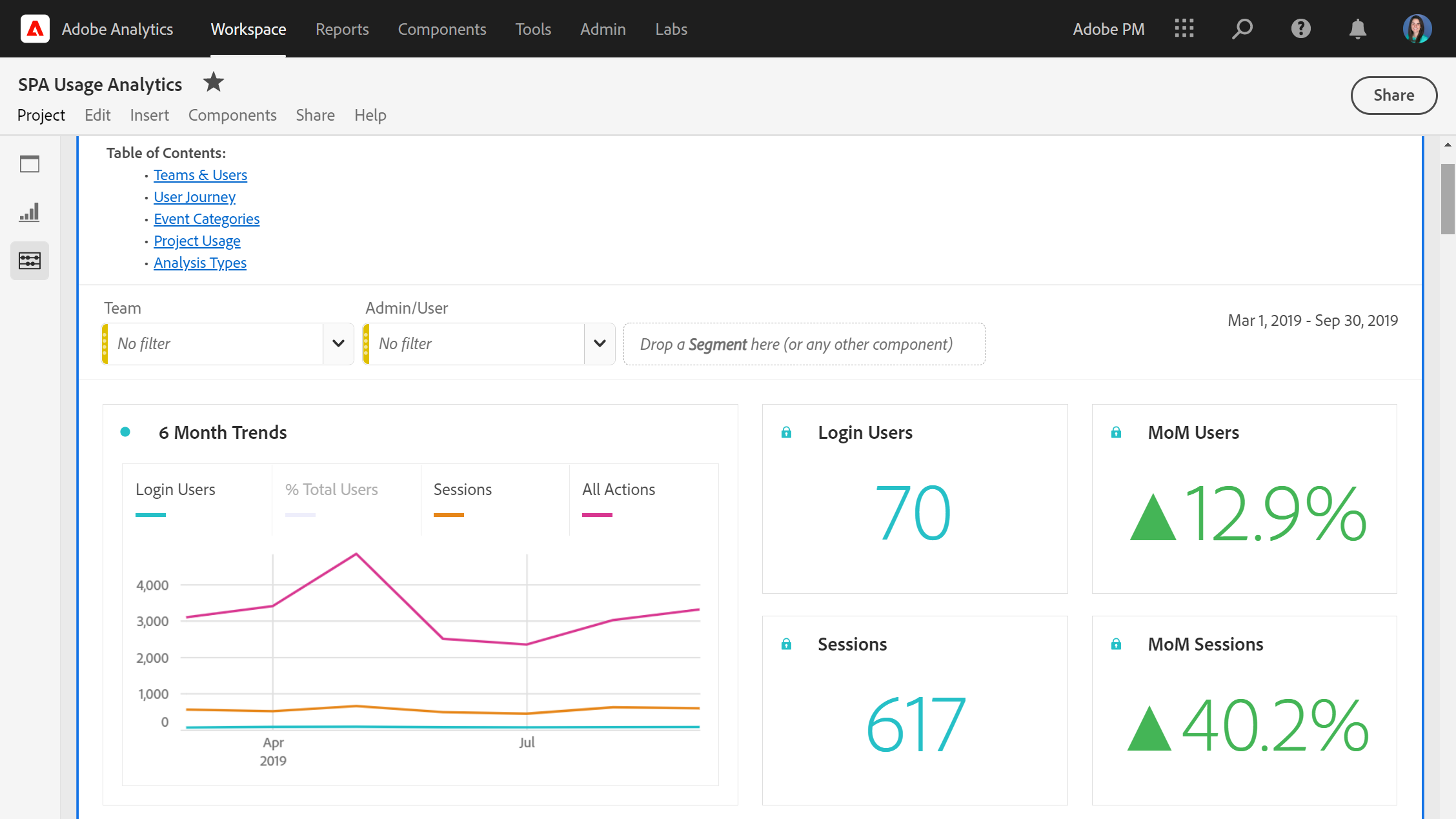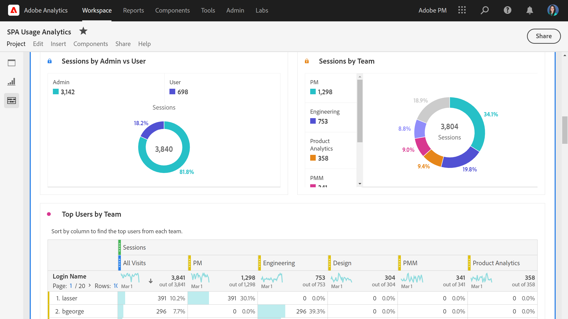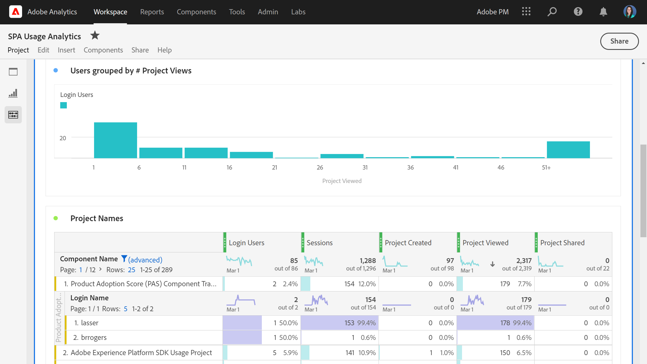 Dive into details about Analysis Workspace, from project creation & shares, to project views. Breakdown project names by login name to see which users are accessing your projects. Use project views to understand if shared dashboards are actually being opened & viewed by the intended audience.