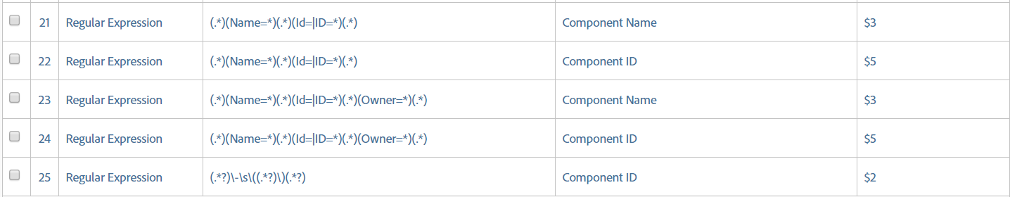 3. Define Component ID & Component Name with RegEx. Components include Projects, Segments, Calculated Metrics, Date Ranges, and Virtual Report Suites. Here are the rules you can setup: