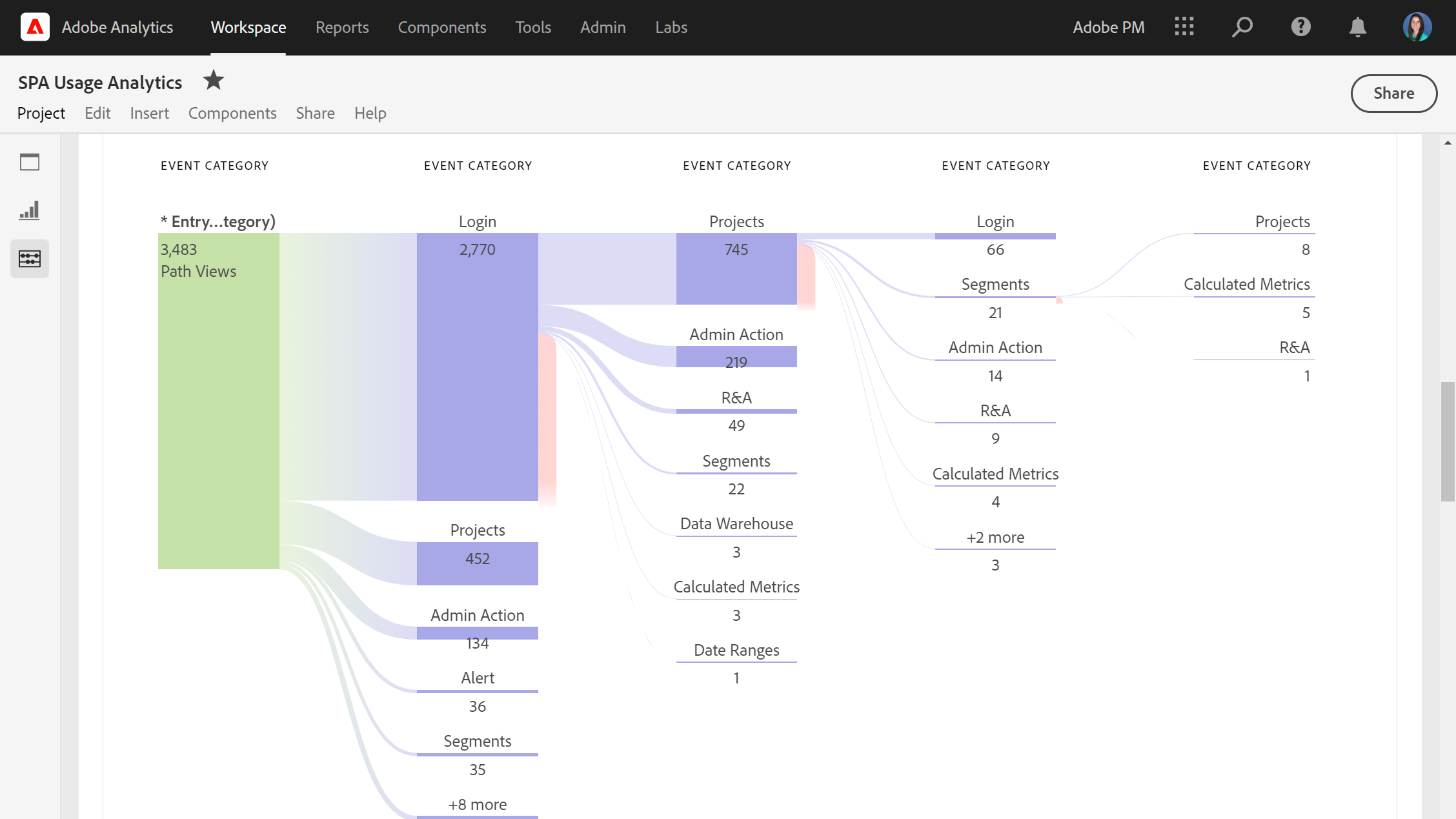 View common journeys users are taking through Analytics. See which users are logging in and going straight to Reports & Analytics, to find opportunities to suggest Analysis Workspace training.